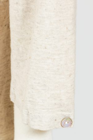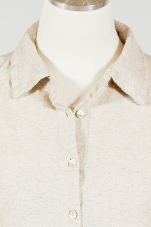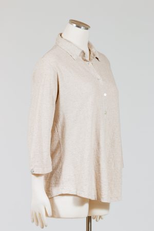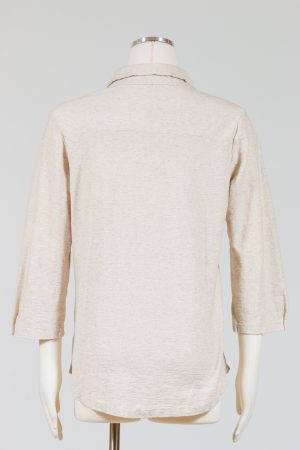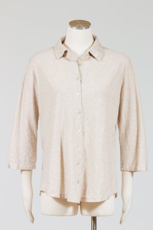 Cut Loose’s 3/4 Sleeve Shirt is a collared and button-front knit top with three-quarter sleeves. Sleeves have a tiny pleat with Mother of Pearl closure. Narrow fit that falls over the hips. Curved hemline. No pockets.Â