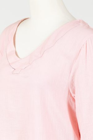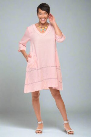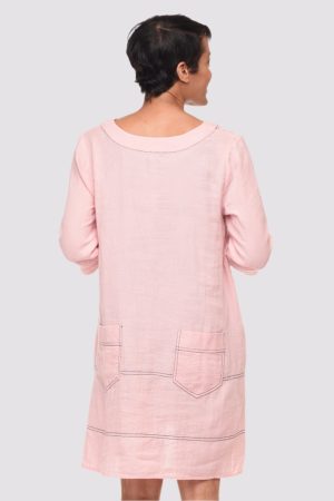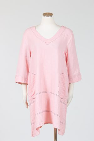 The Bungalow Dress by Tulip is an A-line cotton gauze dress with multiple pockets. It’s perfect for casual wear or as a swimsuit cover up. The lightweight woven material gives it a loose, flowy shape and the V-neckline and three quarter length sleeves add a touch of elegance. It comes in baby pink with black contrast stitching and falls just above the knees on most. Front side entry pockets and back patch pockets offer functional convenience.