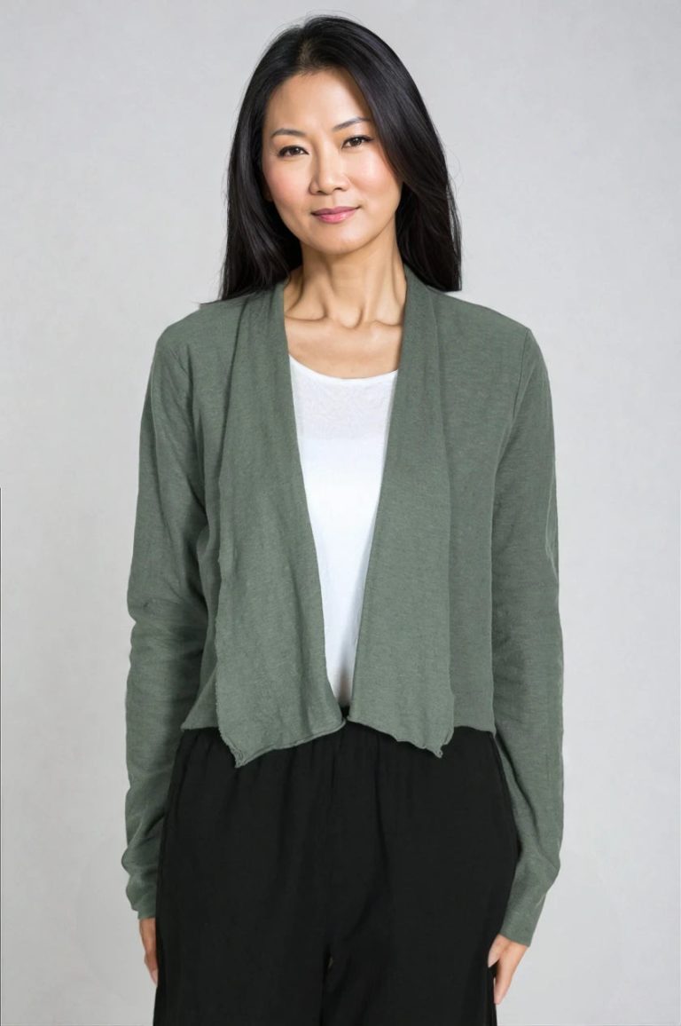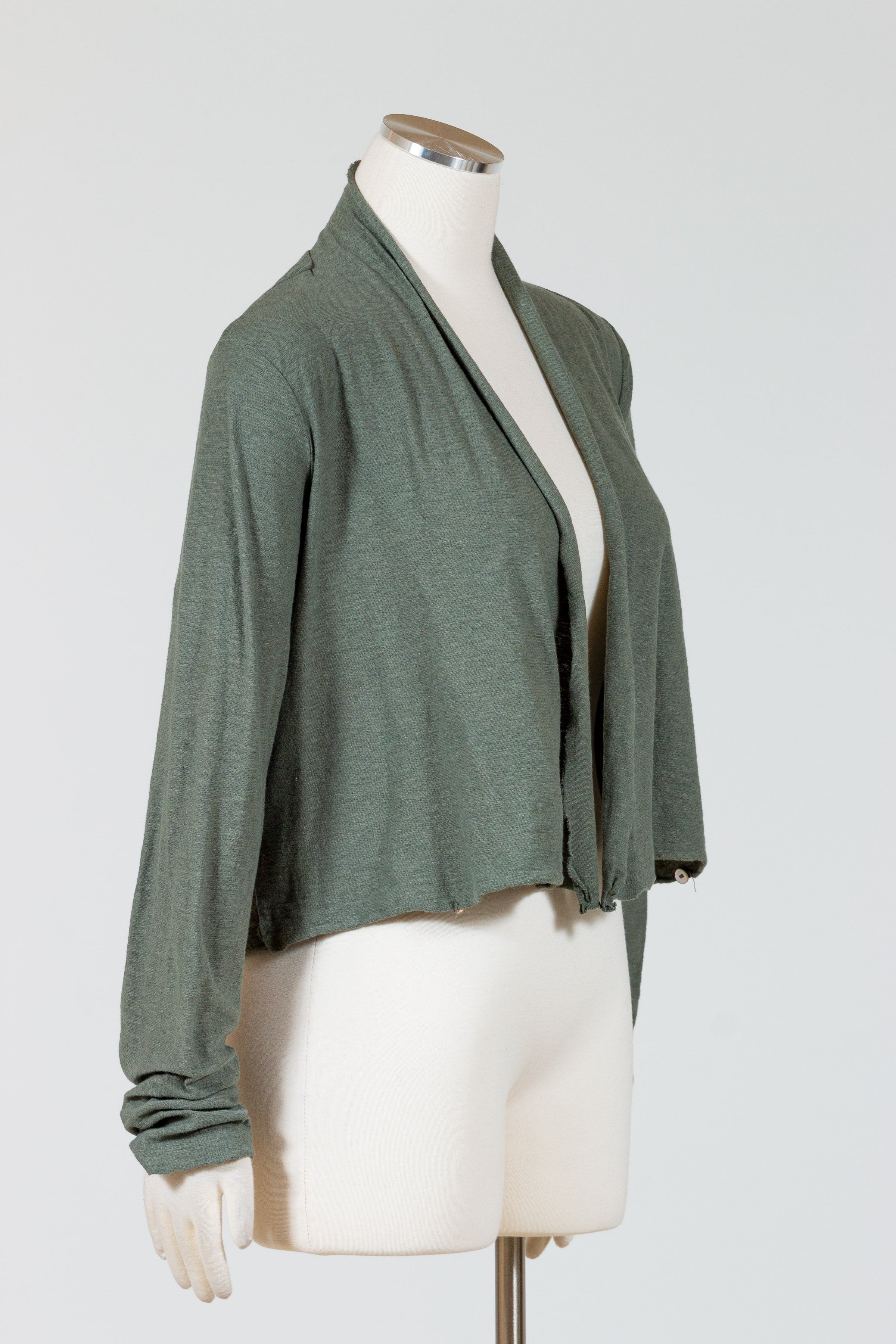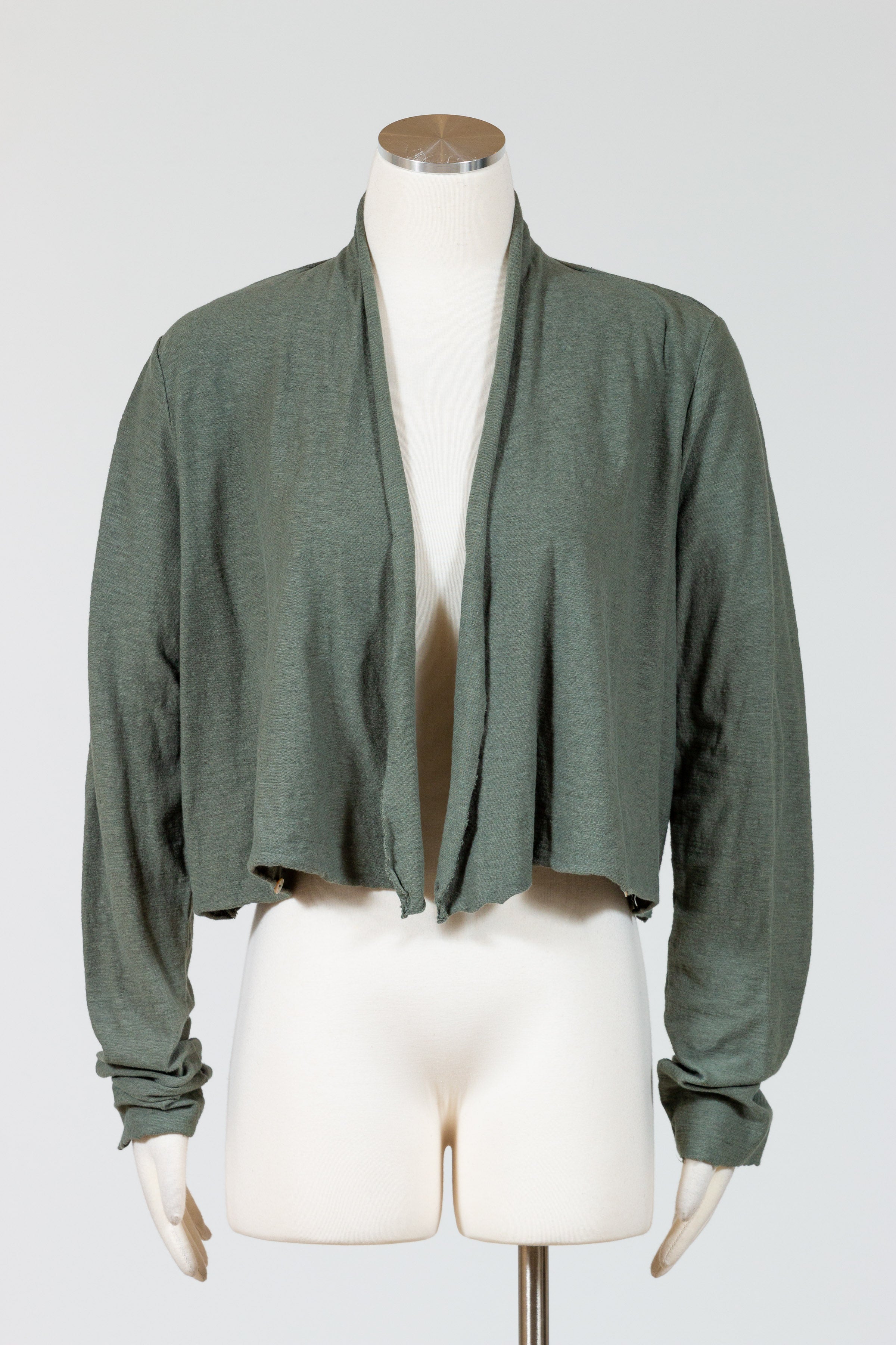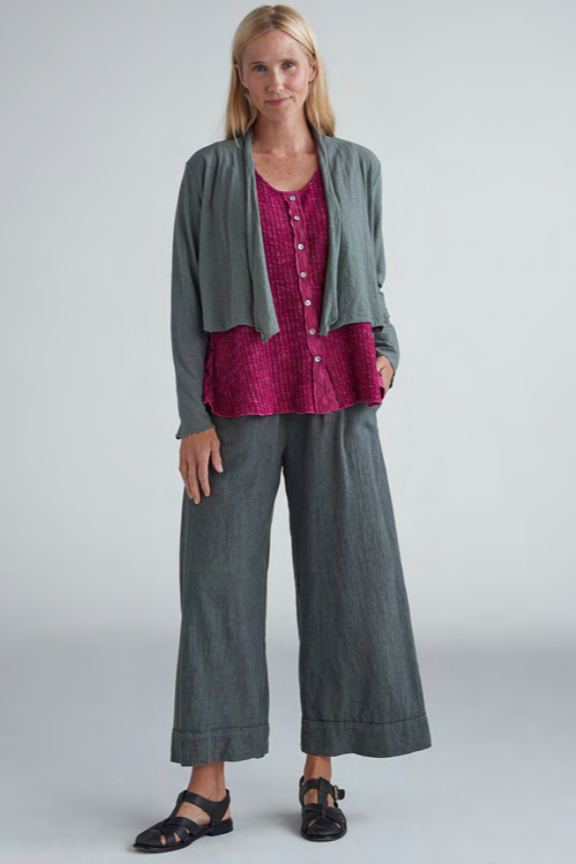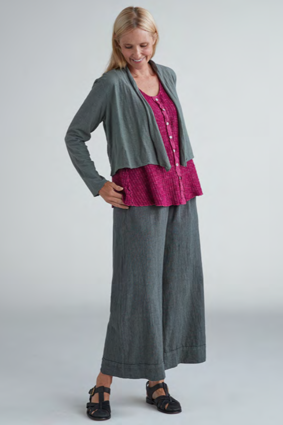 Cut Loose Cropped Cardigan is a cropped topper with long sleeves. When worn open, the front falls long to points and cardigan has a swing shape. Secret side buttons can be used to wear wrapped closed. Falls over the waist on most. A great topper piece to have in your wardrobe as a layer over most anything. Made in a knit cotton and linen jersey fabric that is mid-weight and breathable. No pockets.Â