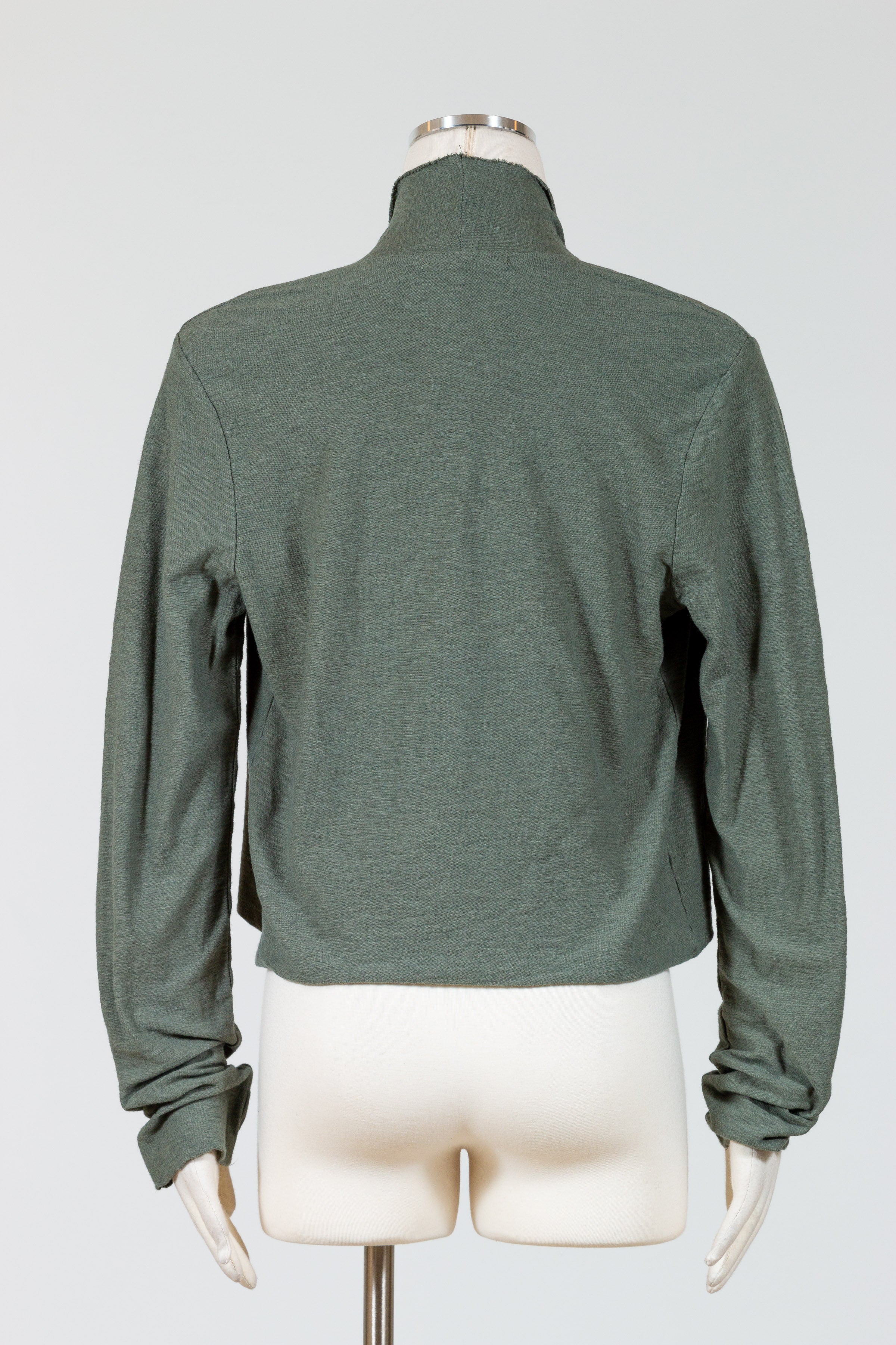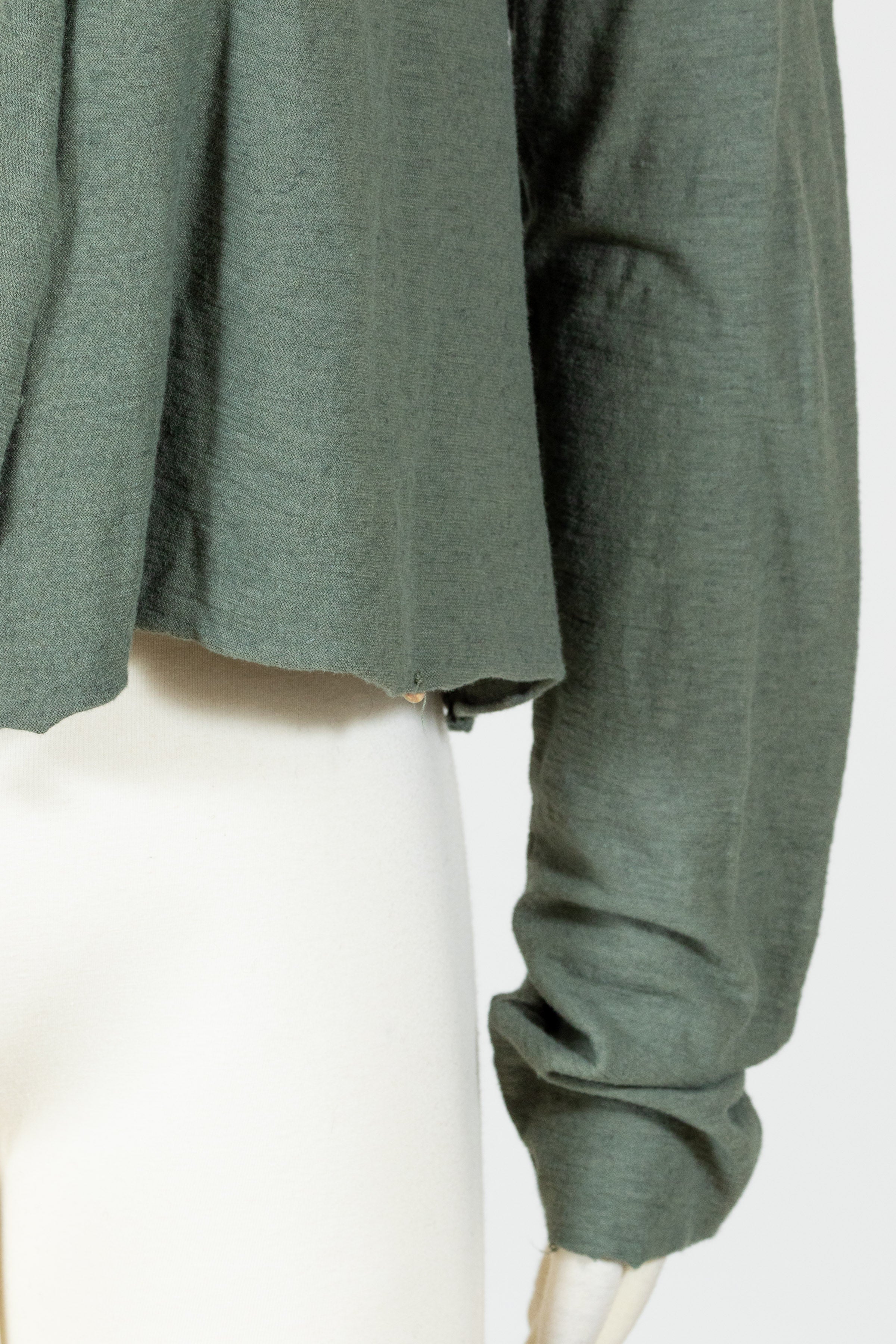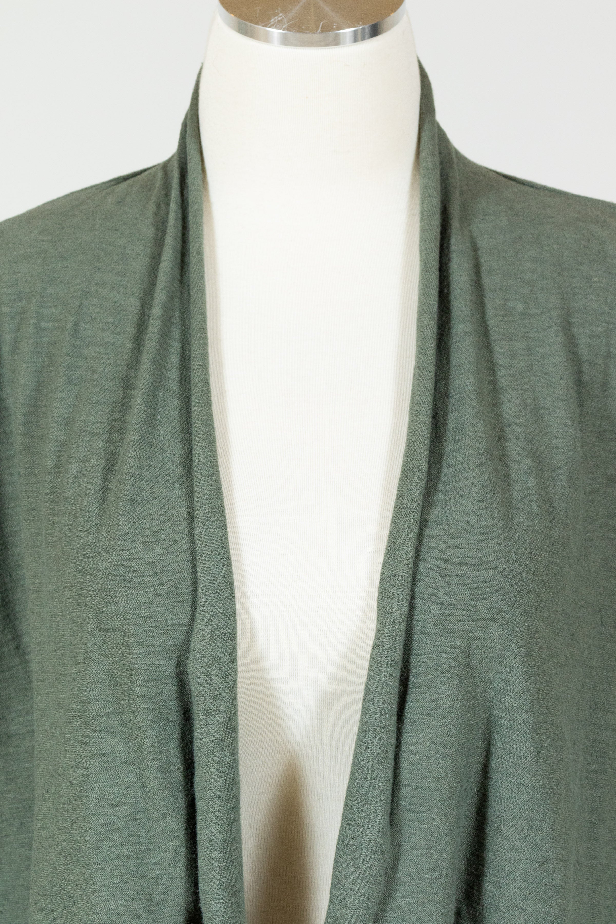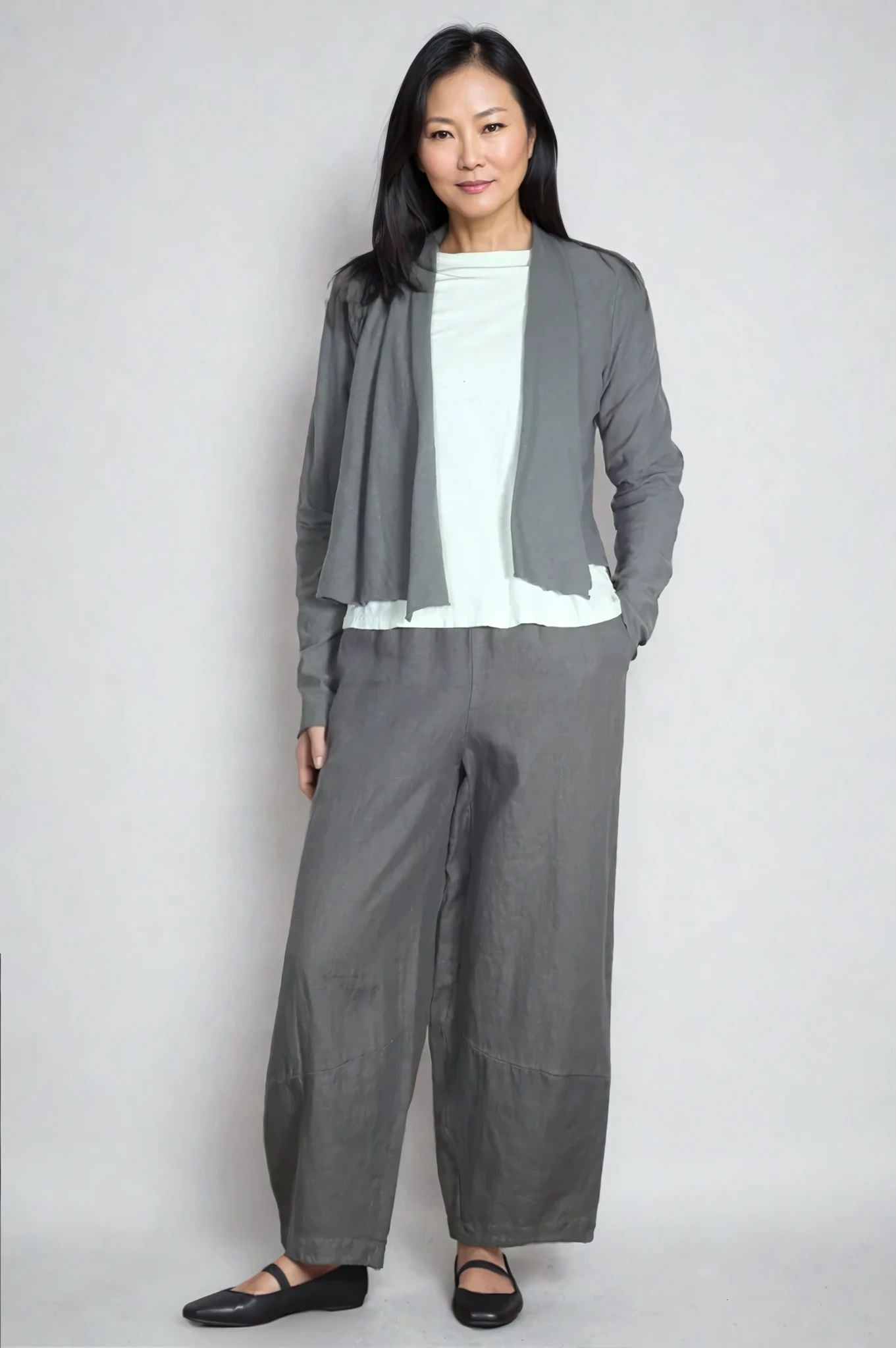 Cut Loose Cropped Cardigan is a cropped topper with long sleeves. When worn open, the front falls long to points and cardigan has a swing shape. Secret side buttons can be used to wear wrapped closed. Falls over the waist on most. A great topper piece to have in your wardrobe as a layer over most anything. Made in a knit cotton and linen jersey fabric that is mid-weight and breathable. No pockets.Â