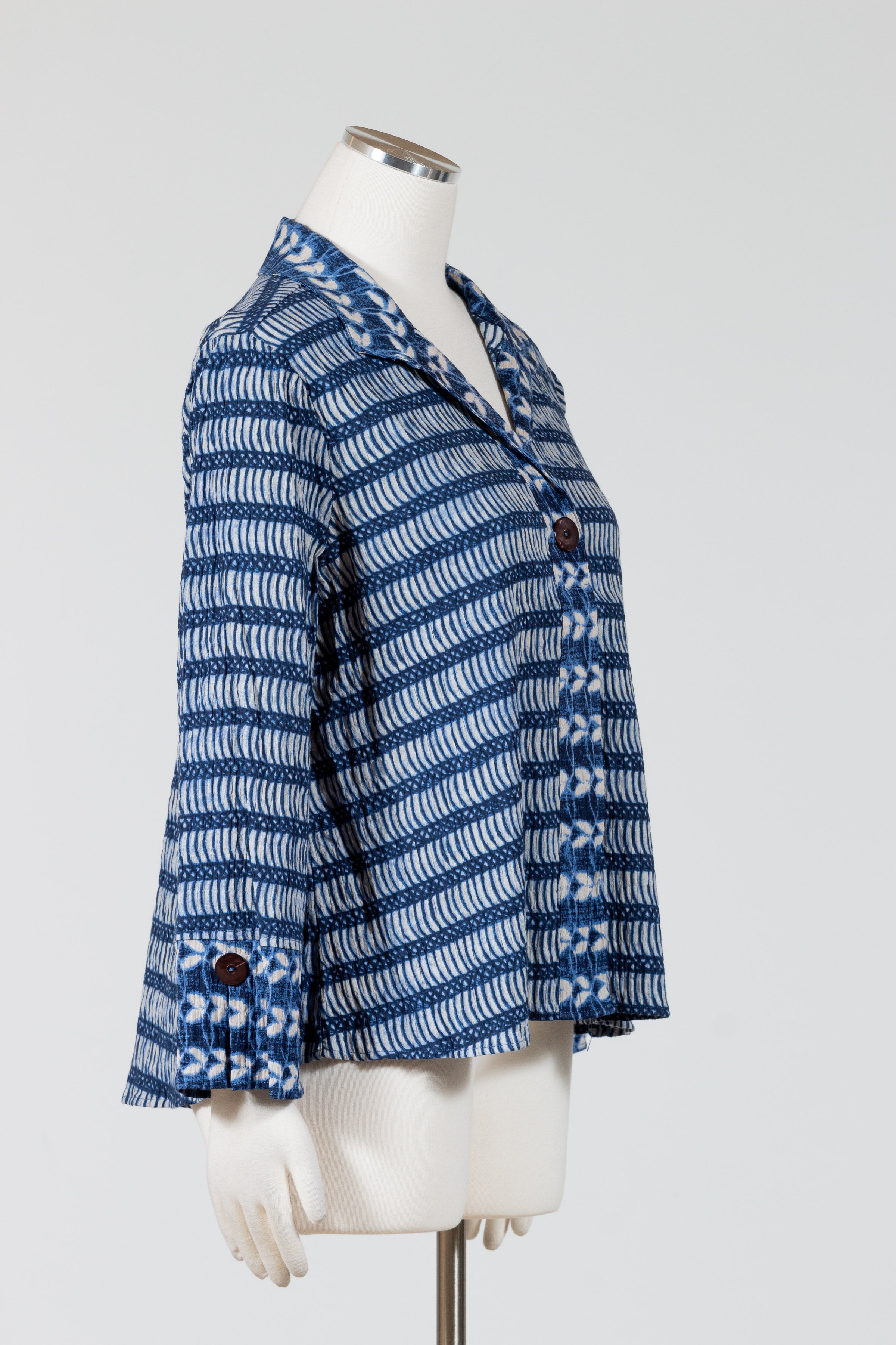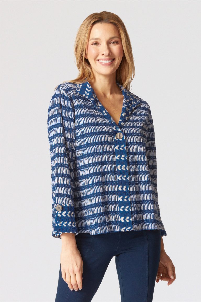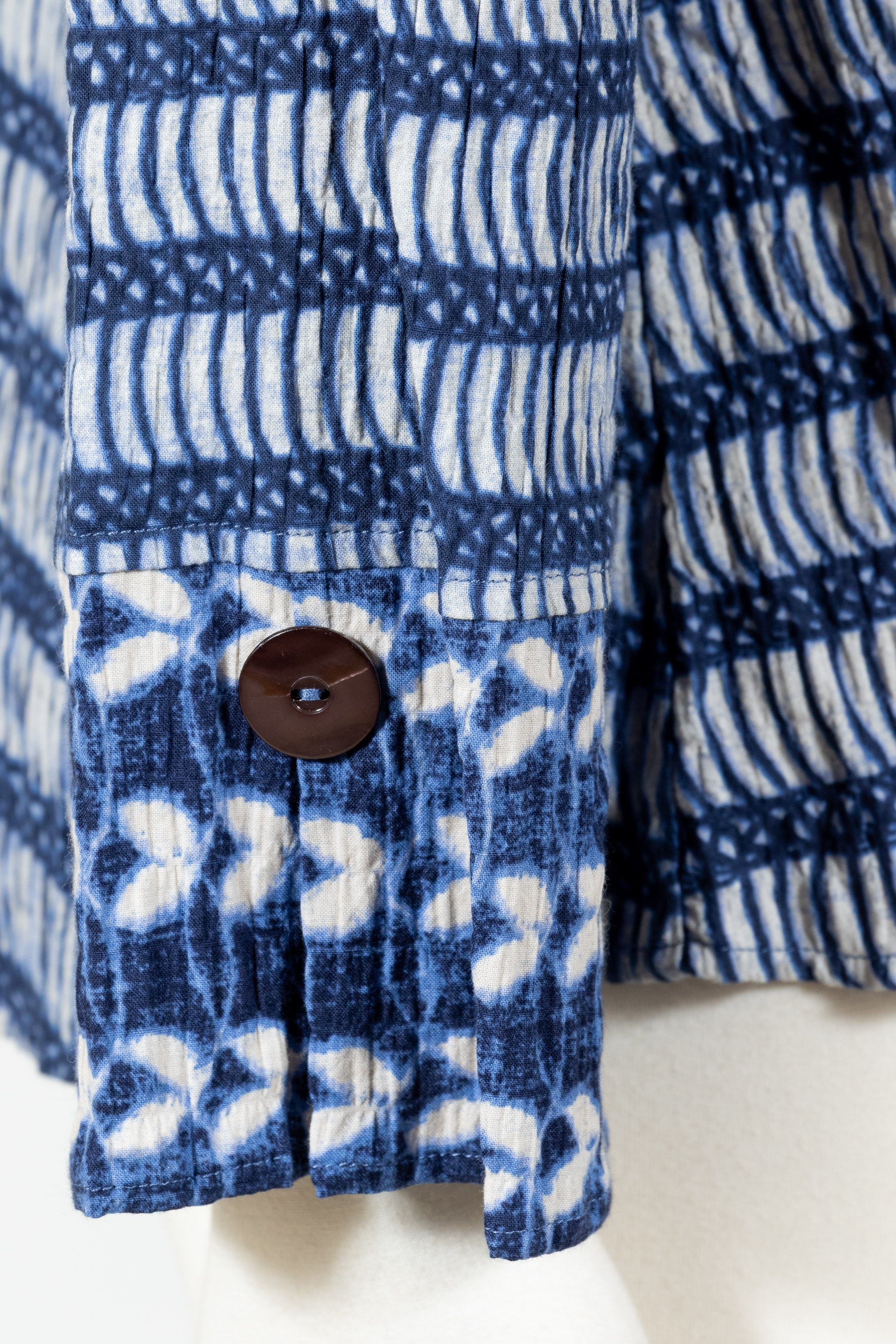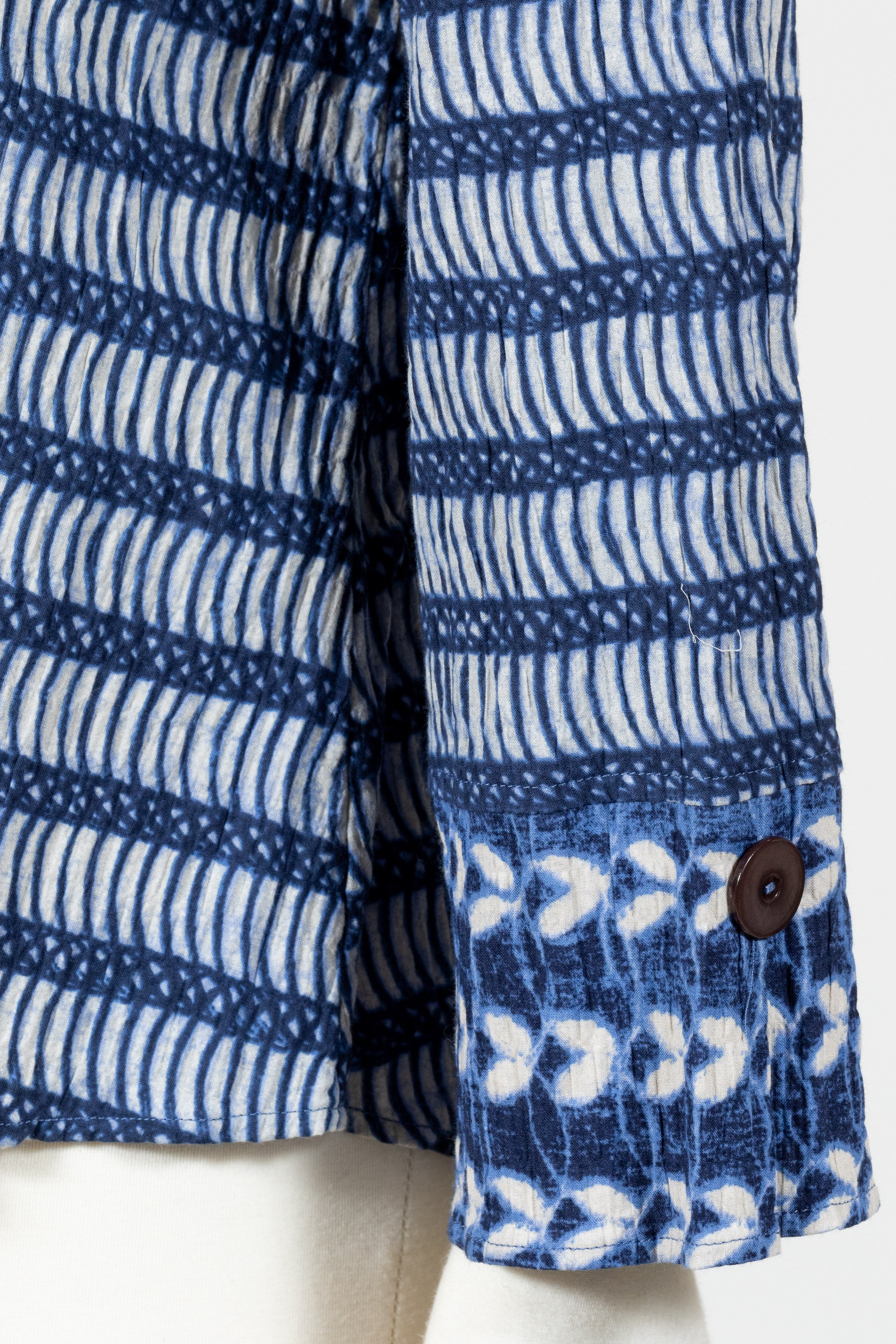 The Hidden Placket Mixed Shirt by Habitat redefines casual polish with its relaxed button-down fit and streamlined hidden button placket. Crafted in breathable crinkled cotton Batik print with a bit of stretch, the artful mix of patterns creates a fresh, one-of-a-kind look. Featuring three-quarter sleeves with slit cuffs (wear them folded or long), a curved hemline that falls over the hips, and clever invisible front pockets, this shirt blends effortless comfort with modern, versatile style. No pockets.