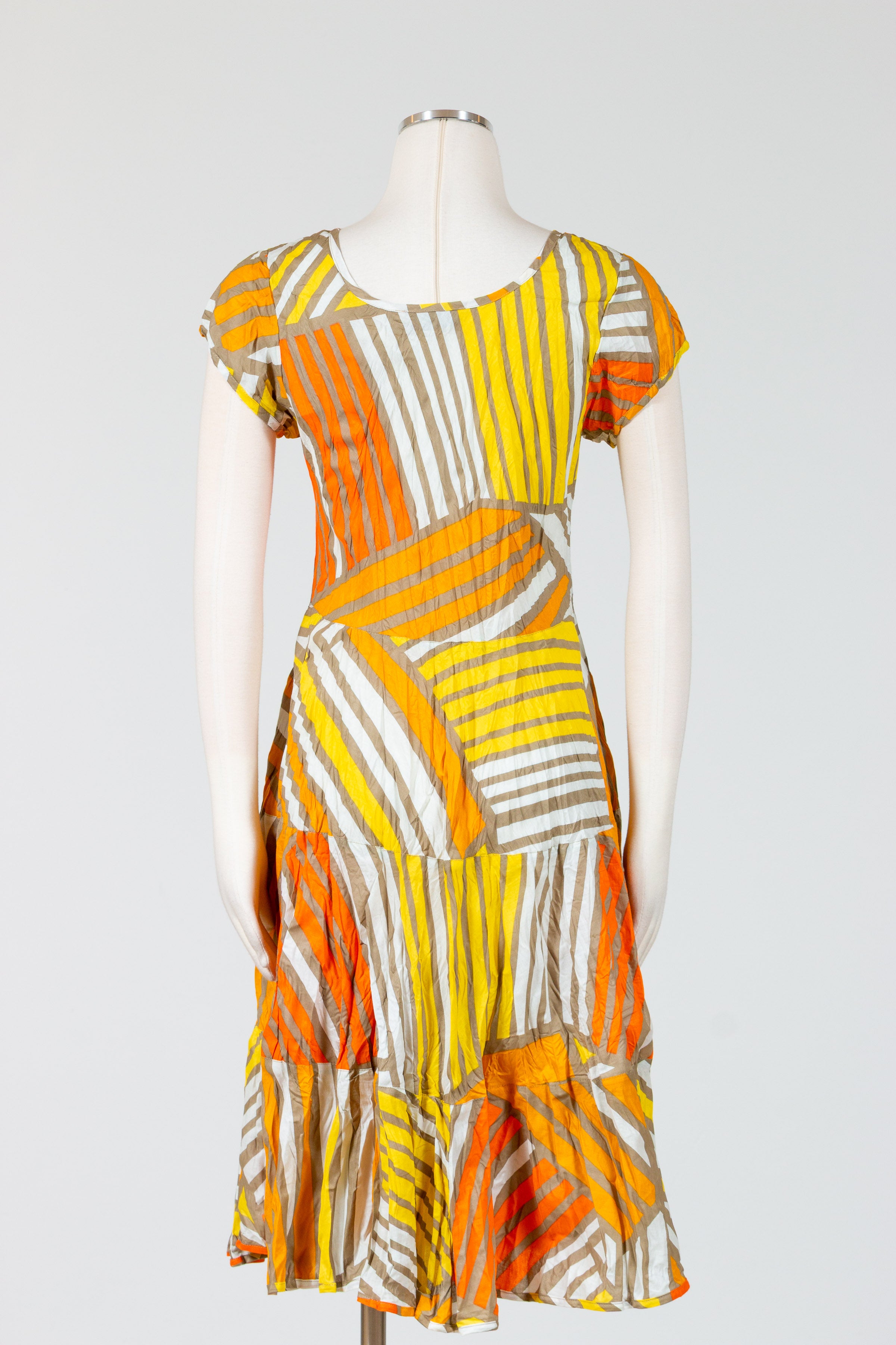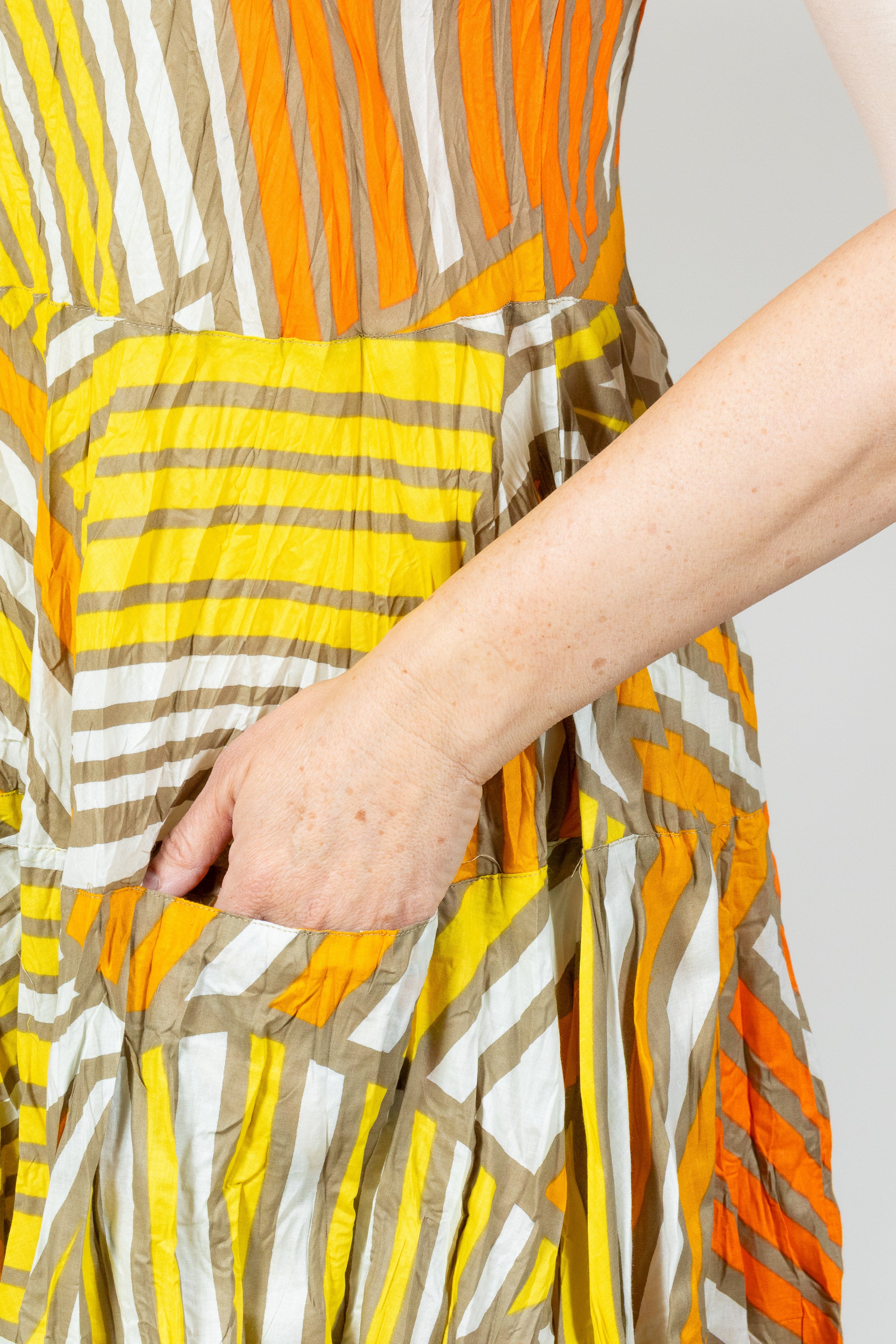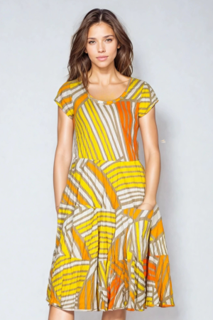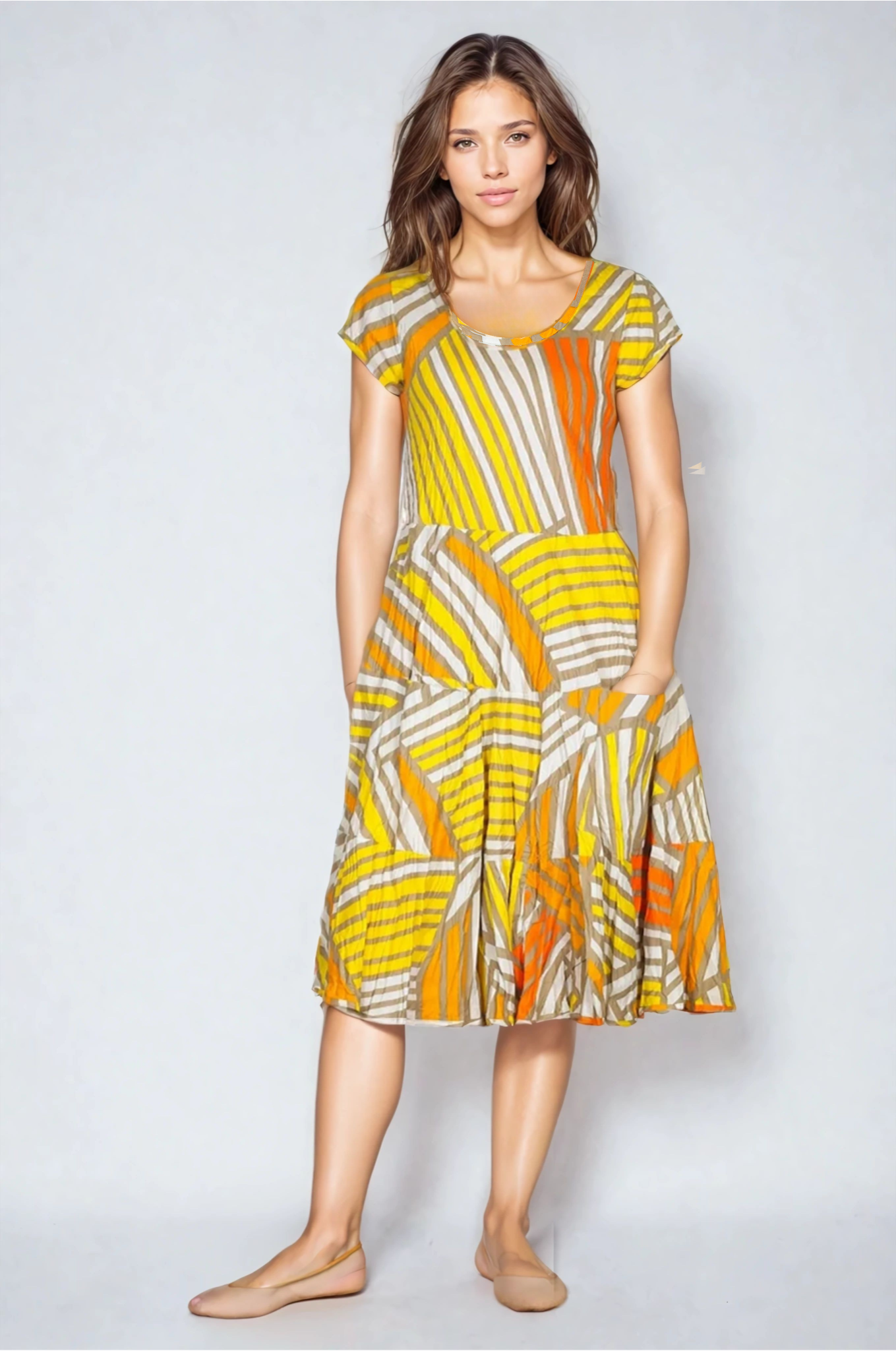 Experience all-day comfort with the Dress Addict’s Jade Dress. This crinkled woven cotton dress features a scoop neck and cap sleeves. With a flattering fit and flare silhouette and a tiered skirt, you can easily wear it for your travels and daily activities. The abstract print in shades of yellow and orange adds a pop of color to your wardrobe. Plus, the midi length falls just below the knees. Two invisible, on seam, front pockets.Â