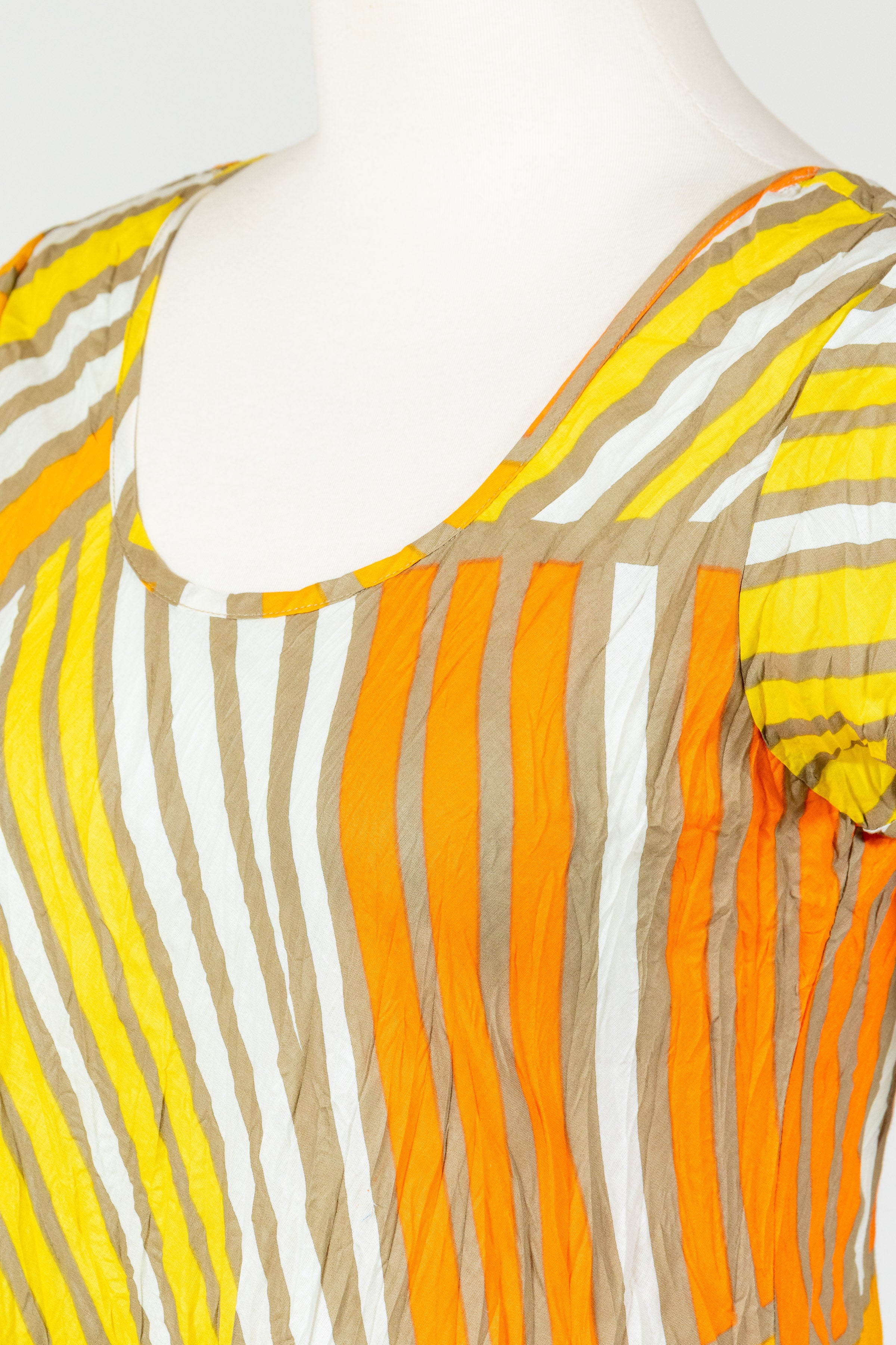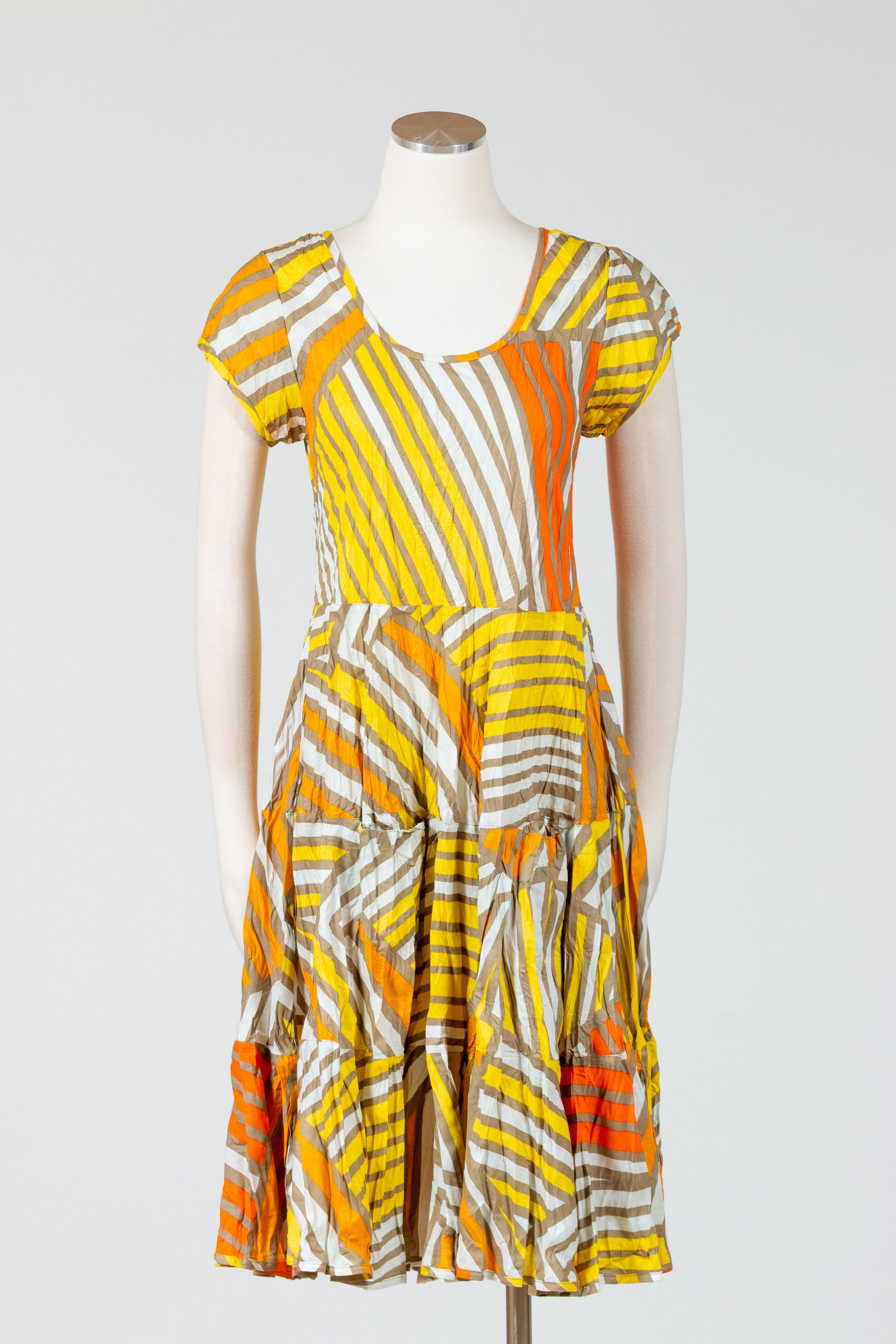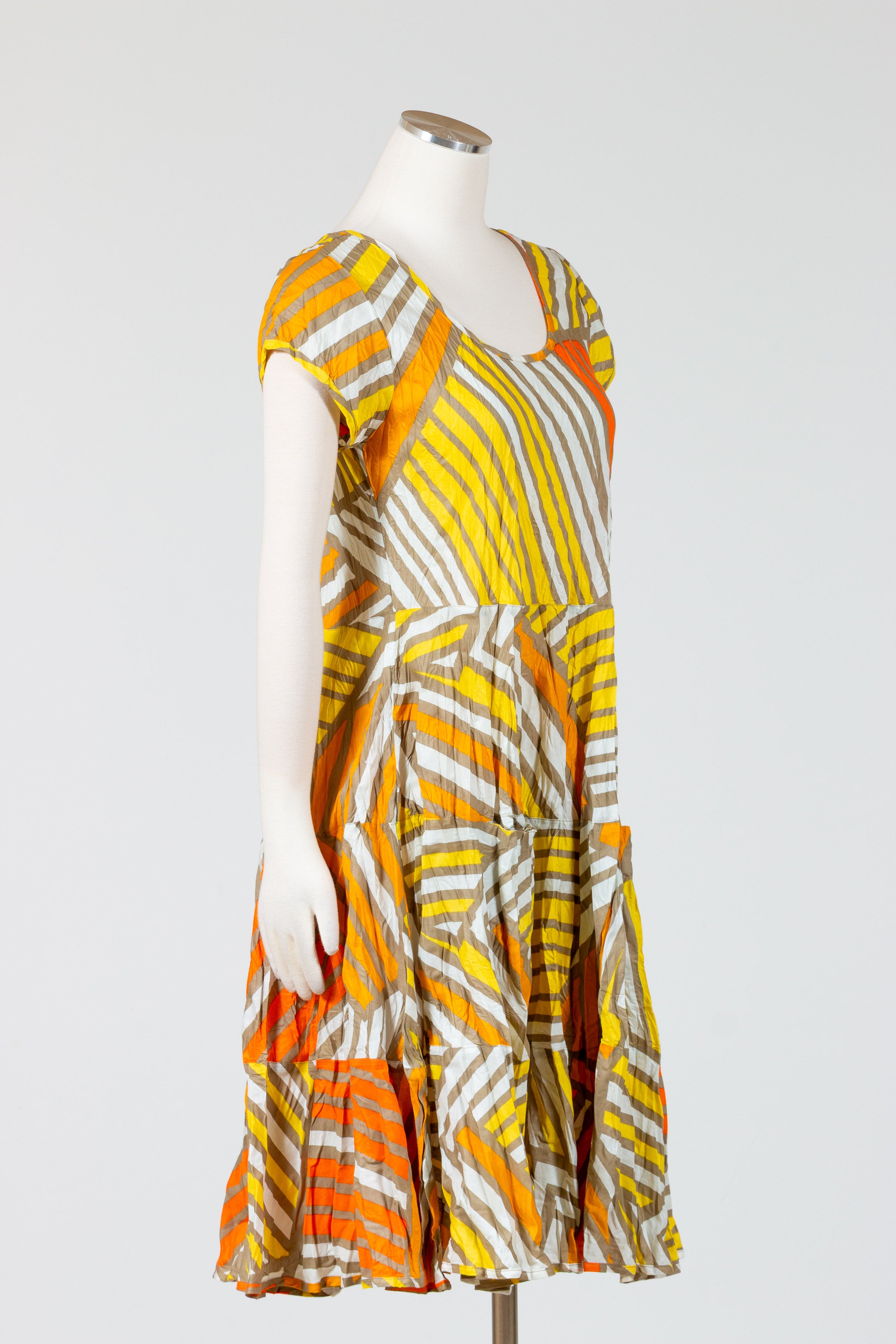 Experience all-day comfort with the Dress Addict’s Jade Dress. This crinkled woven cotton dress features a scoop neck and cap sleeves. With a flattering fit and flare silhouette and a tiered skirt, you can easily wear it for your travels and daily activities. The abstract print in shades of yellow and orange adds a pop of color to your wardrobe. Plus, the midi length falls just below the knees. Two invisible, on seam, front pockets.Â
