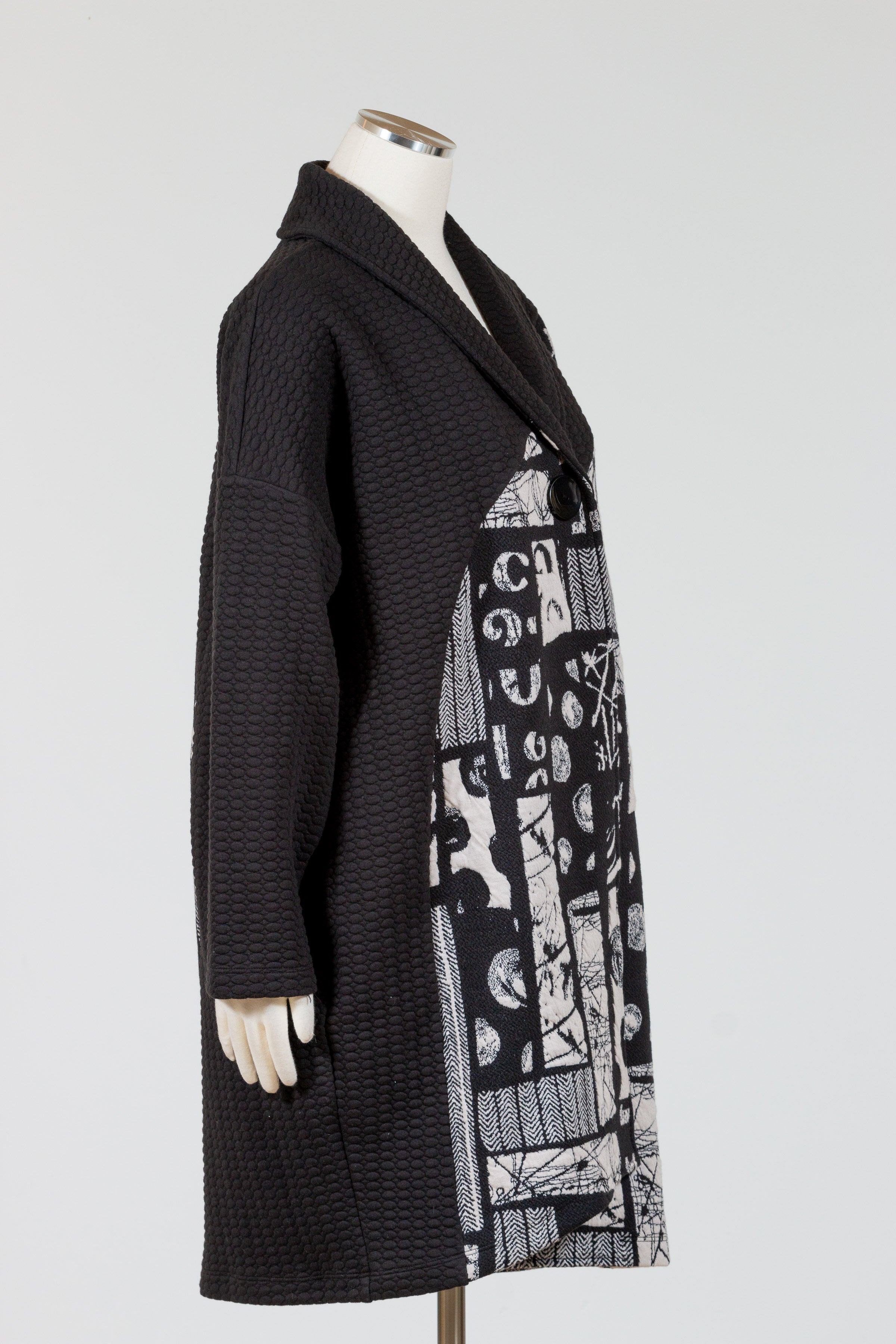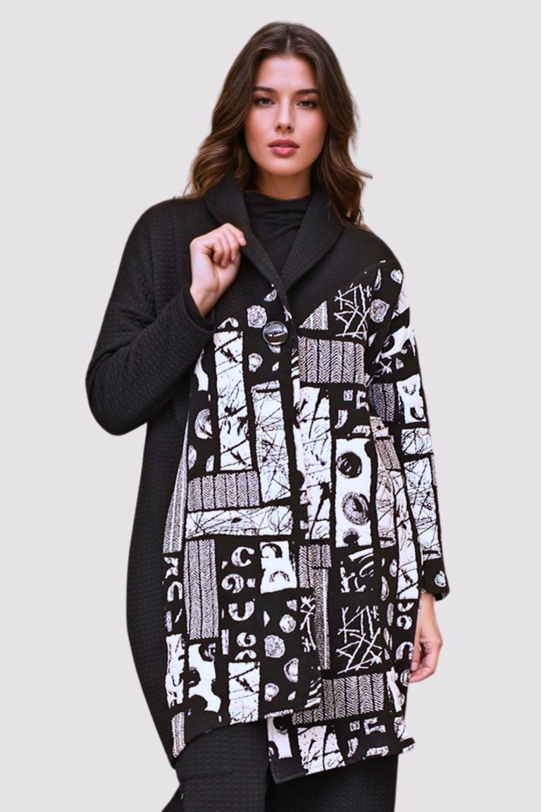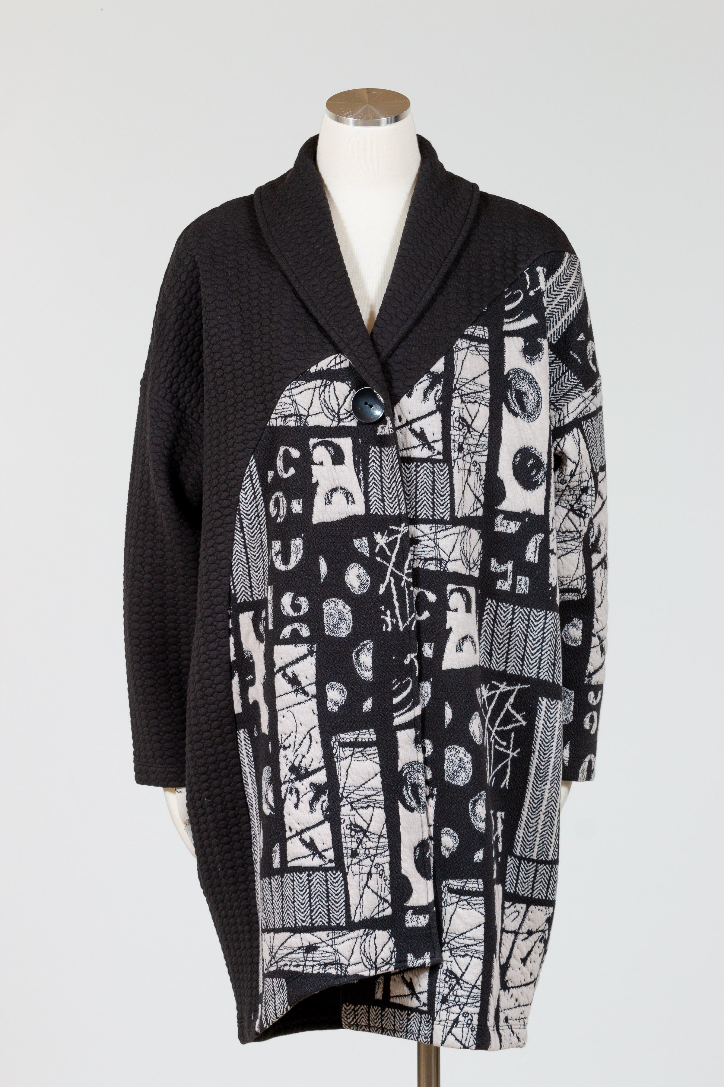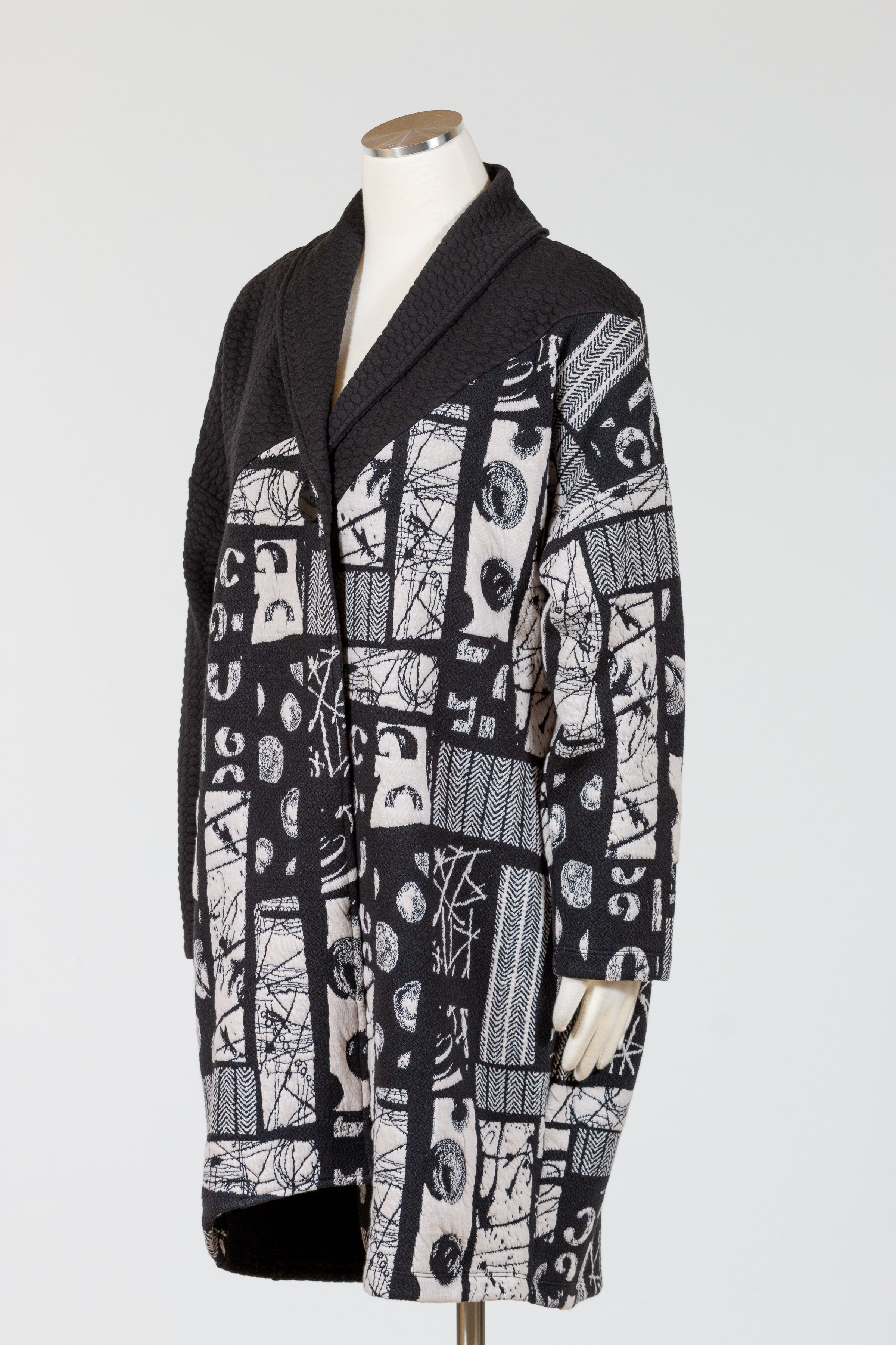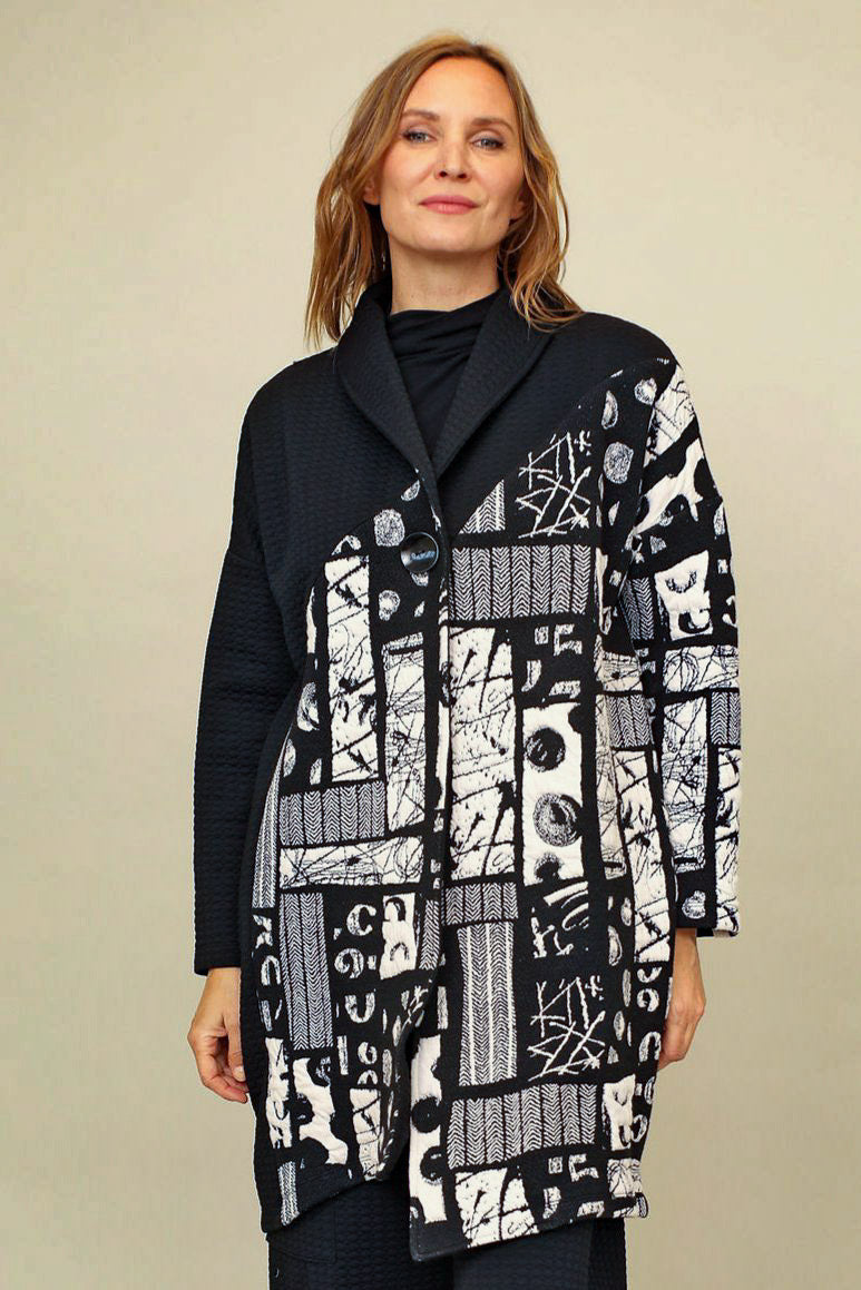 Introducing Chalet’s Laurel Coat – a bold, one-of-a-kind mid-length coat that exudes sophistication with its eclectic mix of patterns. Its shawl neck and single button closure add a touch of boldness to this distinctive piece. The asymmetrical hem falls just above the knee, while the two on seam pockets offer both functionality and style. (Note: Each piece boasts a unique pattern, making it even more stylish.)
