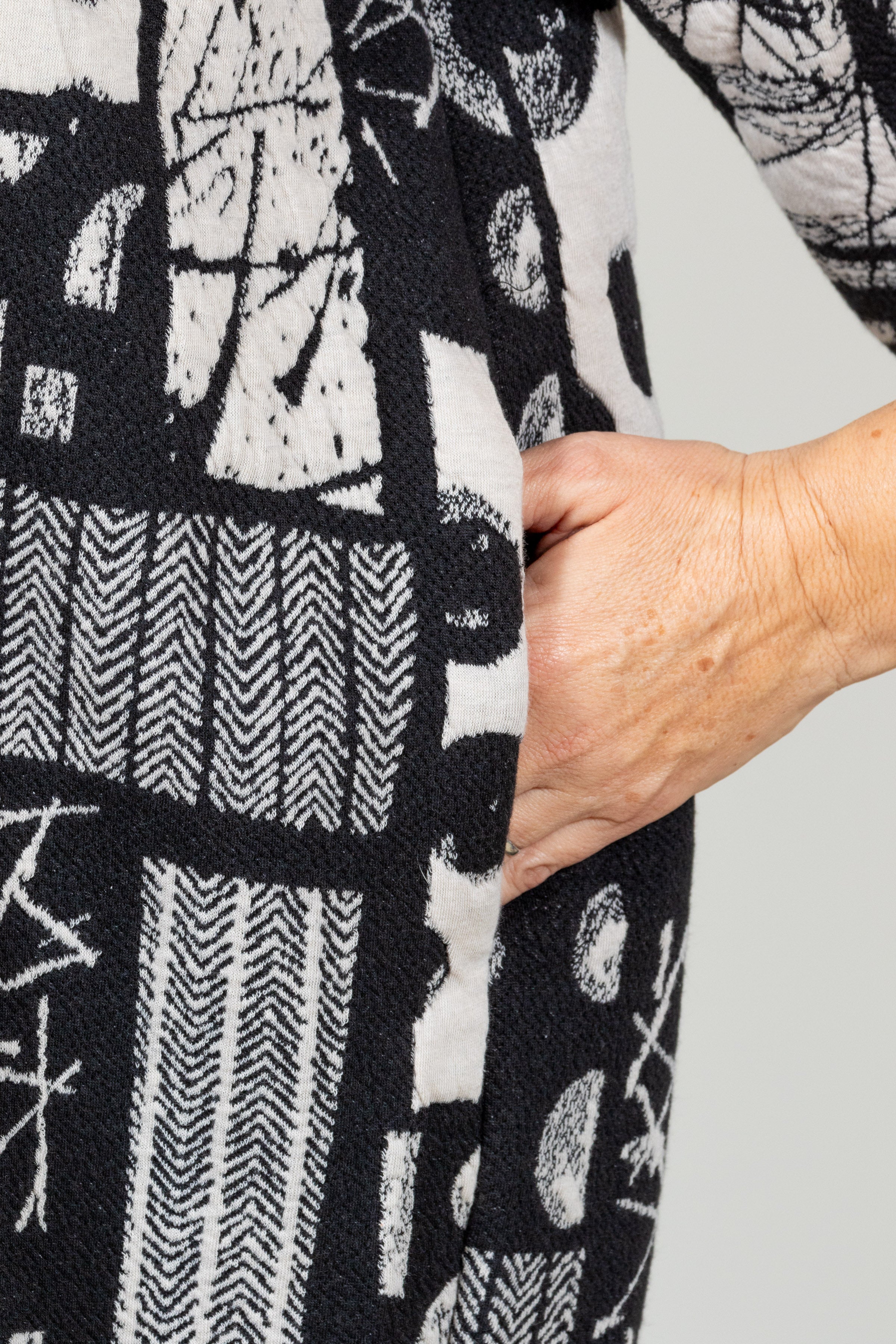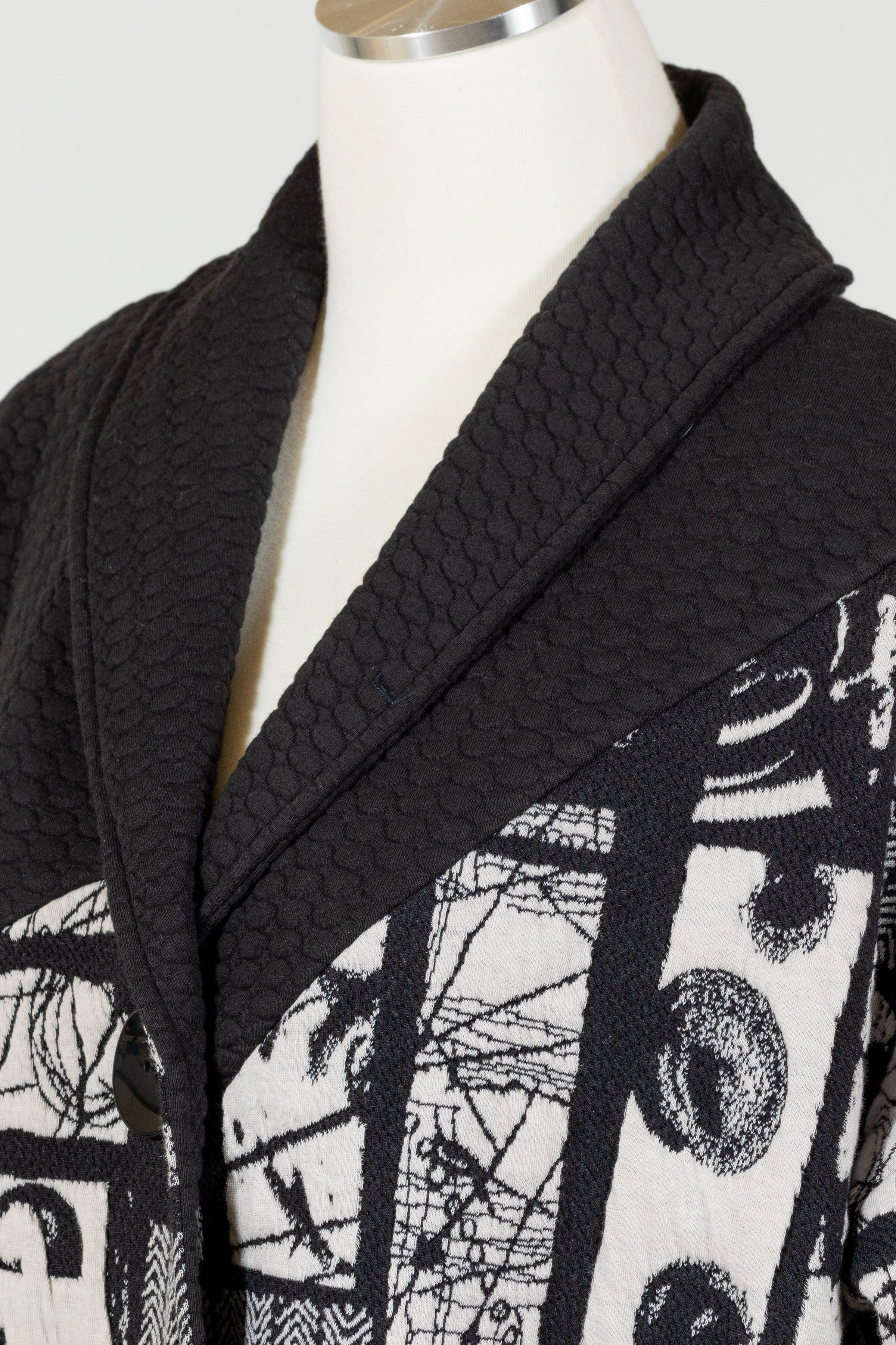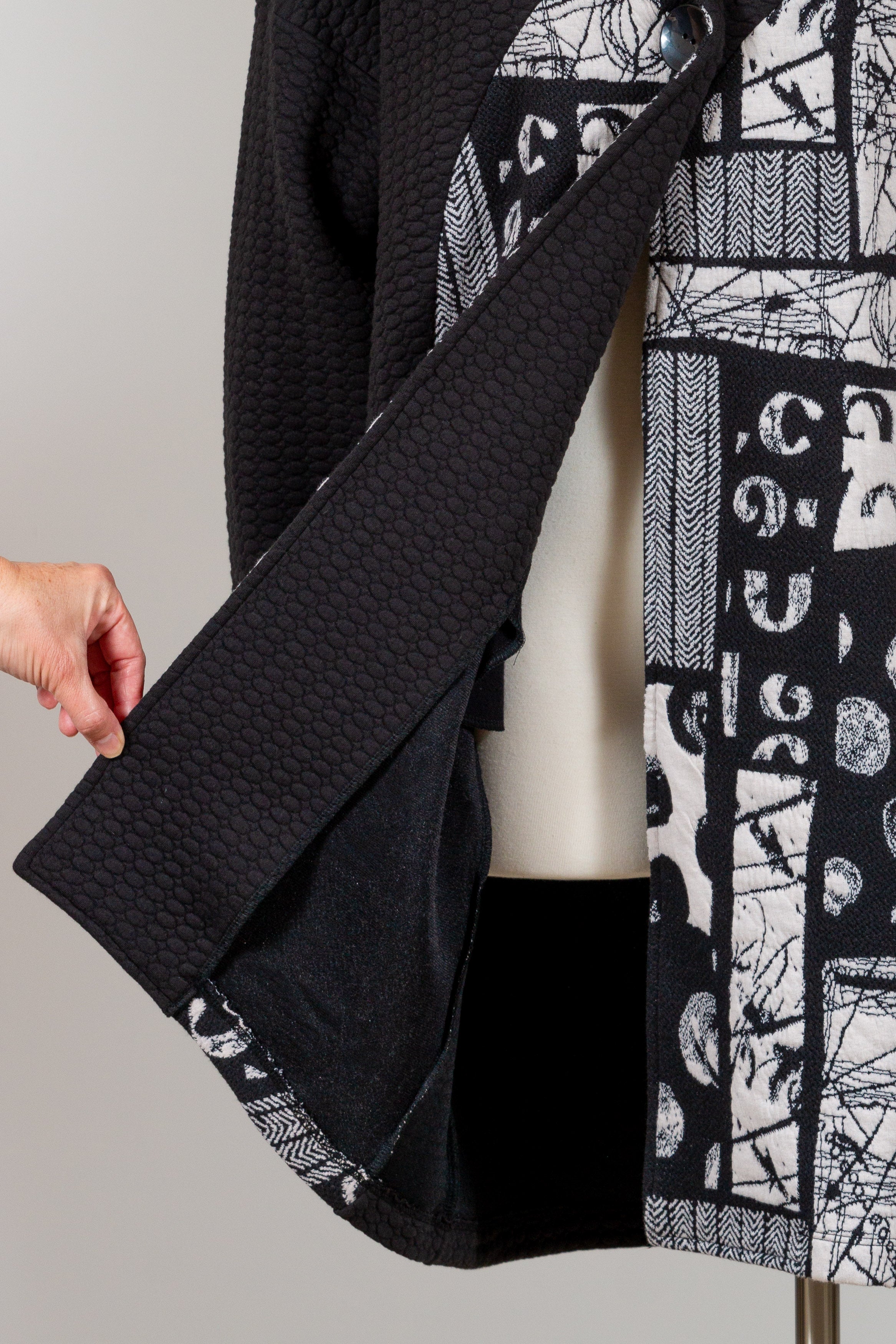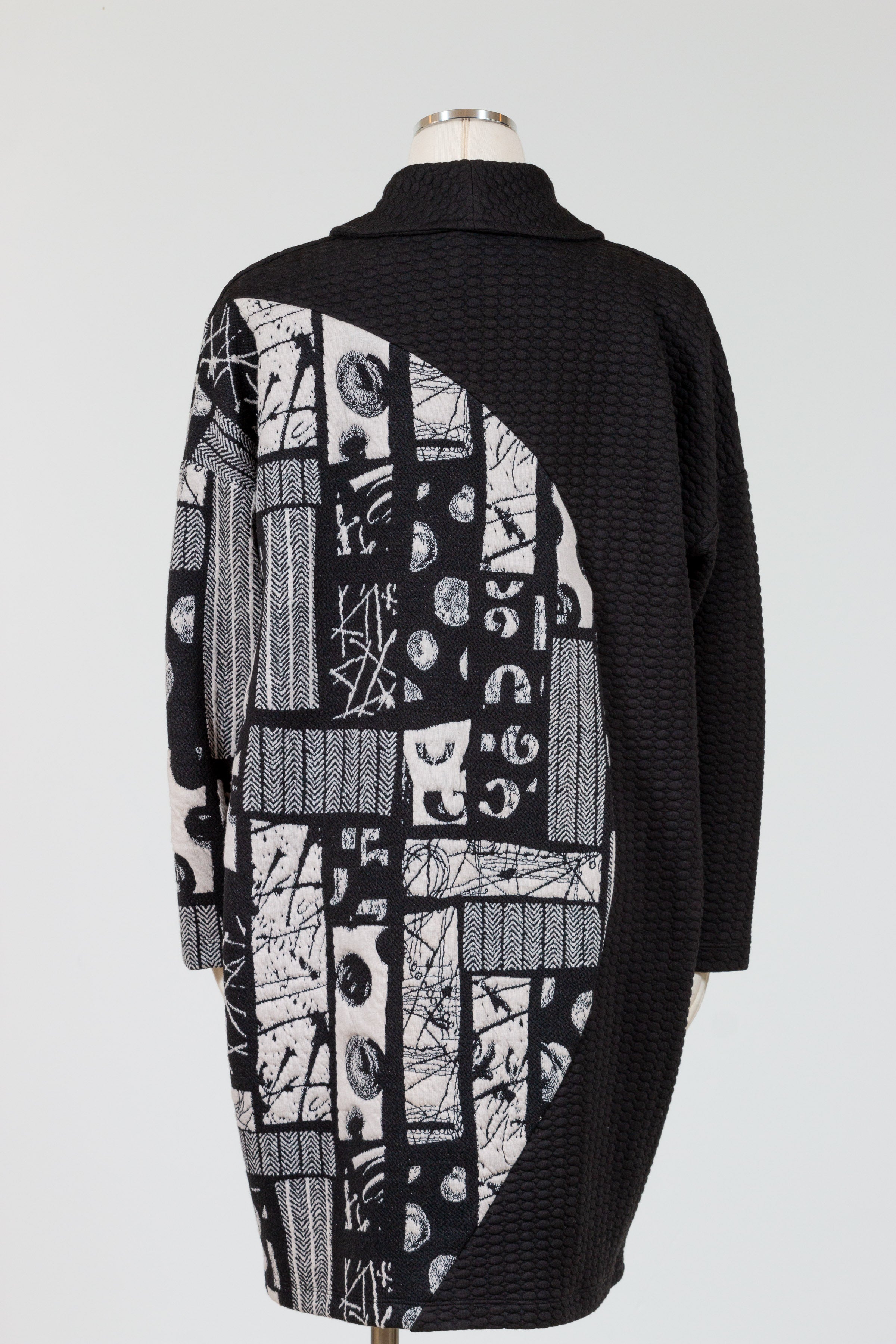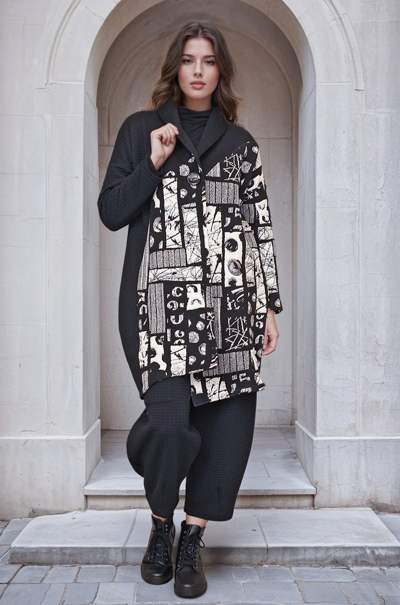 Introducing Chalet’s Laurel Coat – a bold, one-of-a-kind mid-length coat that exudes sophistication with its eclectic mix of patterns. Its shawl neck and single button closure add a touch of boldness to this distinctive piece. The asymmetrical hem falls just above the knee, while the two on seam pockets offer both functionality and style. (Note: Each piece boasts a unique pattern, making it even more stylish.)