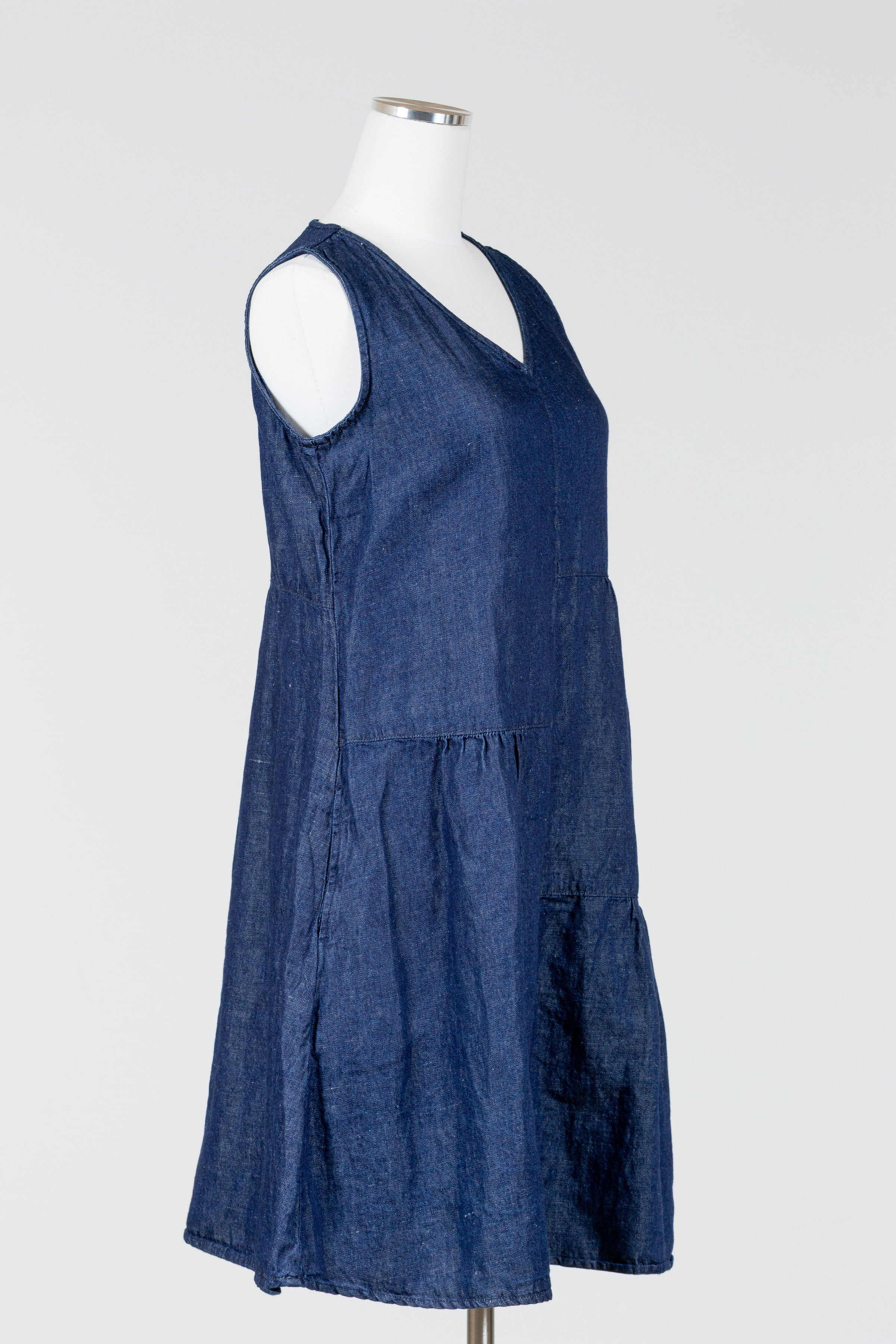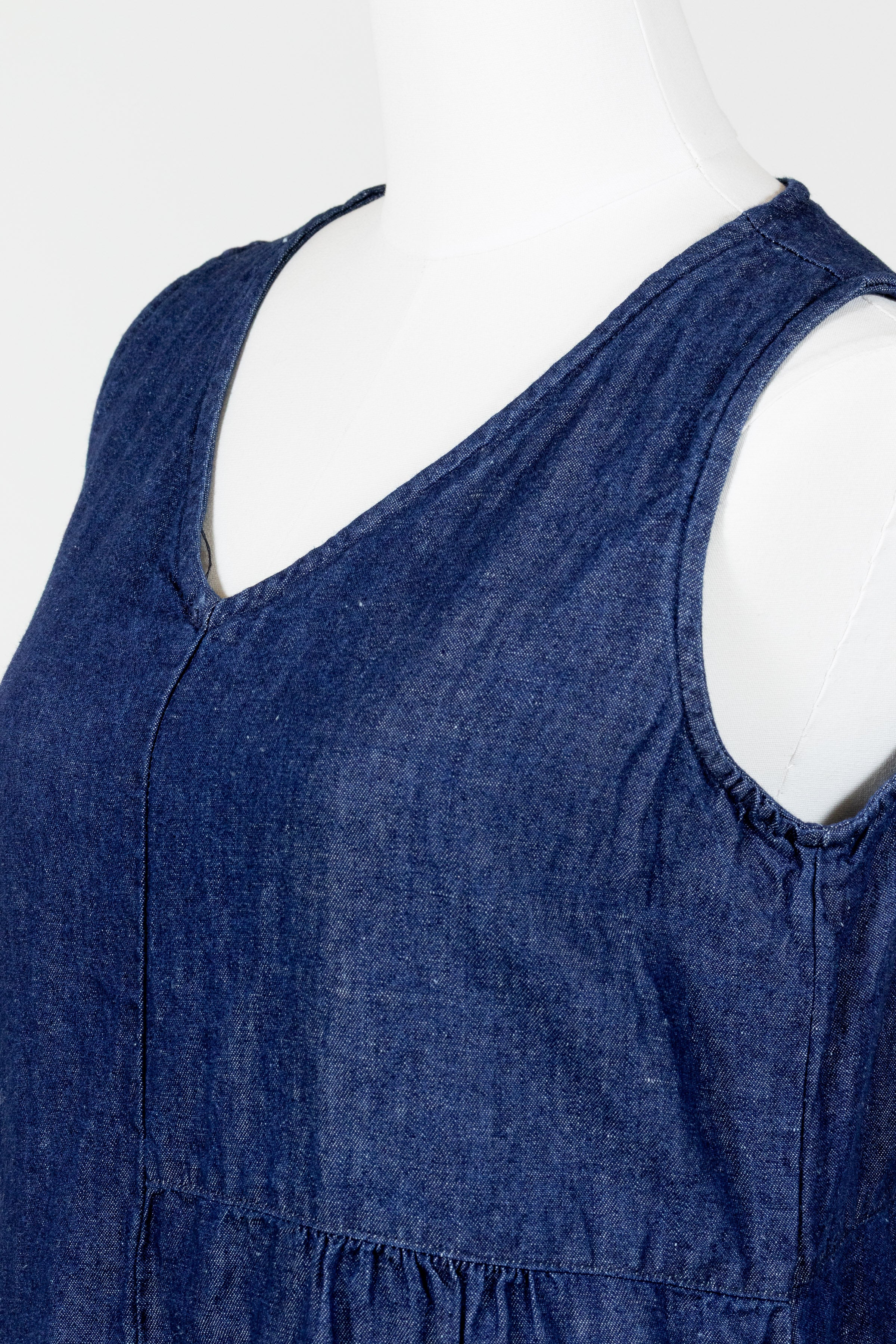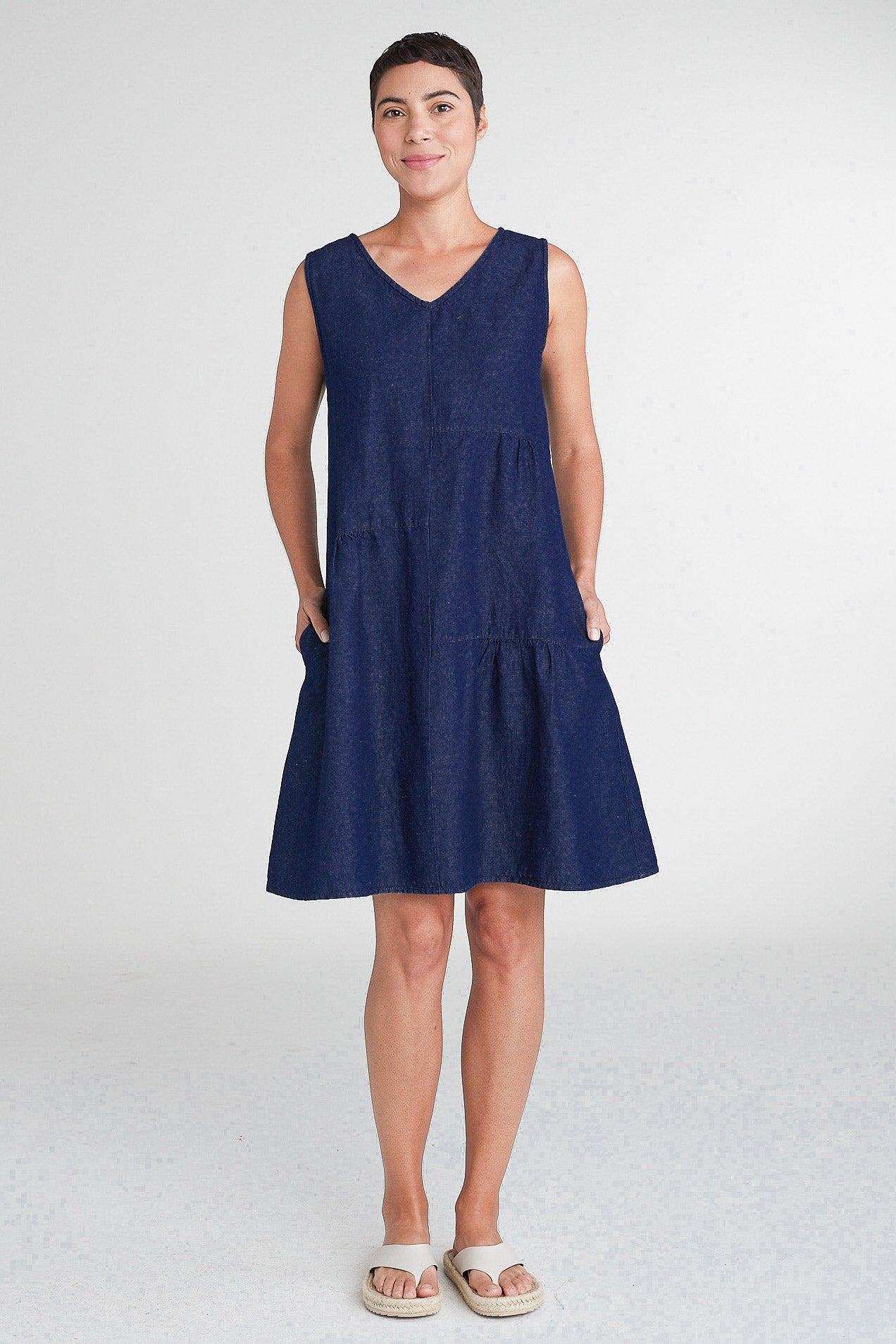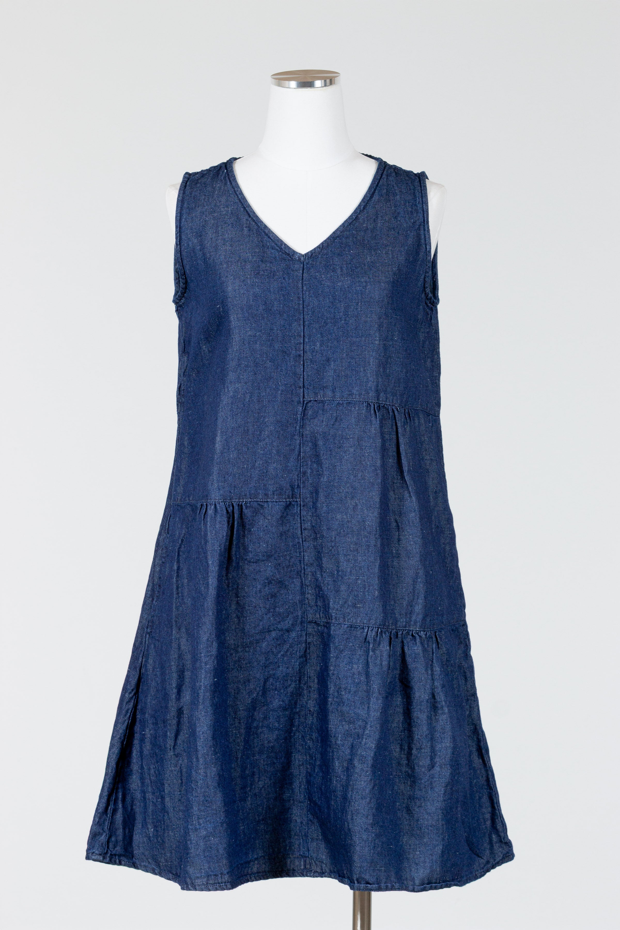 Introducing the Patch Dress by Cut Loose – the iconic dress style from Cut Loose in a new Flax Denim fabric! This style features a sleeveless design with a delicate V-neckline and eye-catching asymmetric pleated panels on the front, creating a beautifully tiered effect. The back is kept smooth for a sleek silhouette. And not to mention, it also comes with two convenient on seam pockets. Falls above the knees on most.