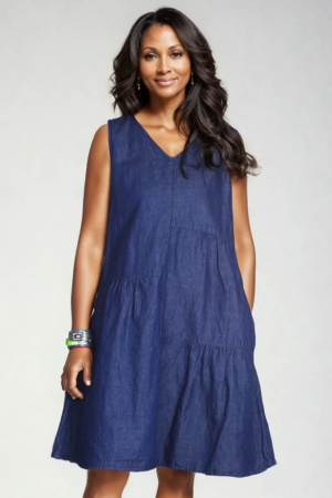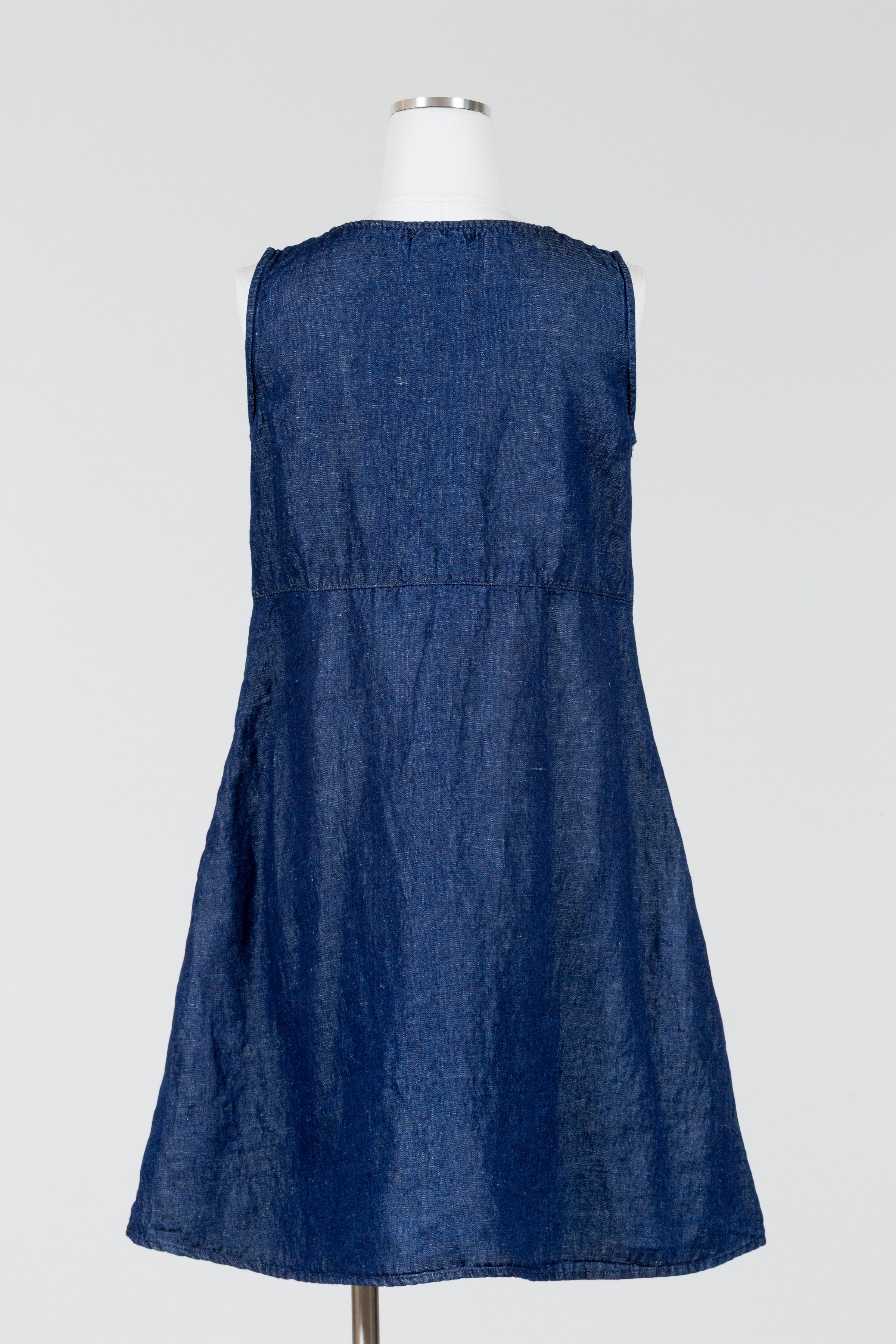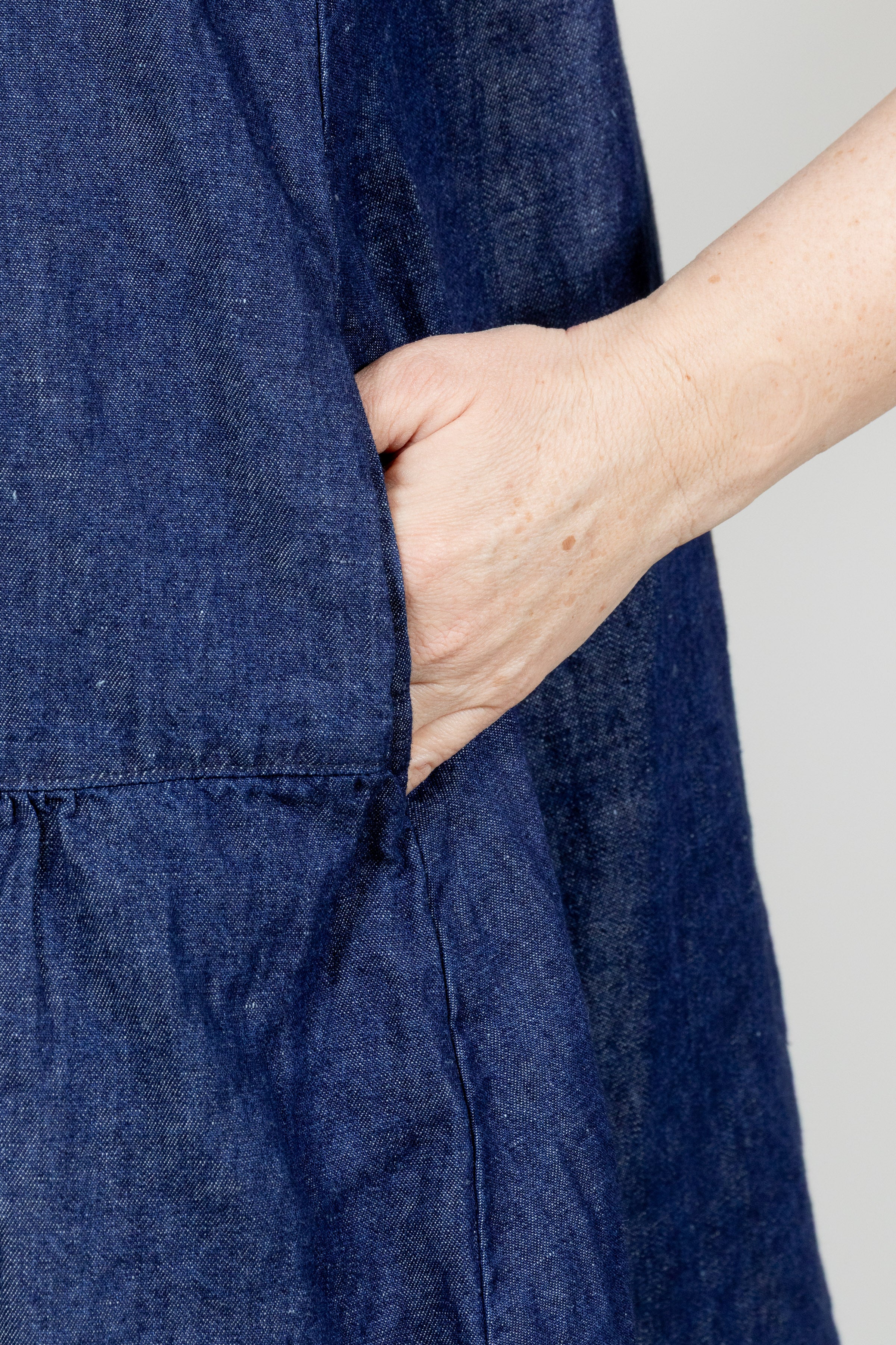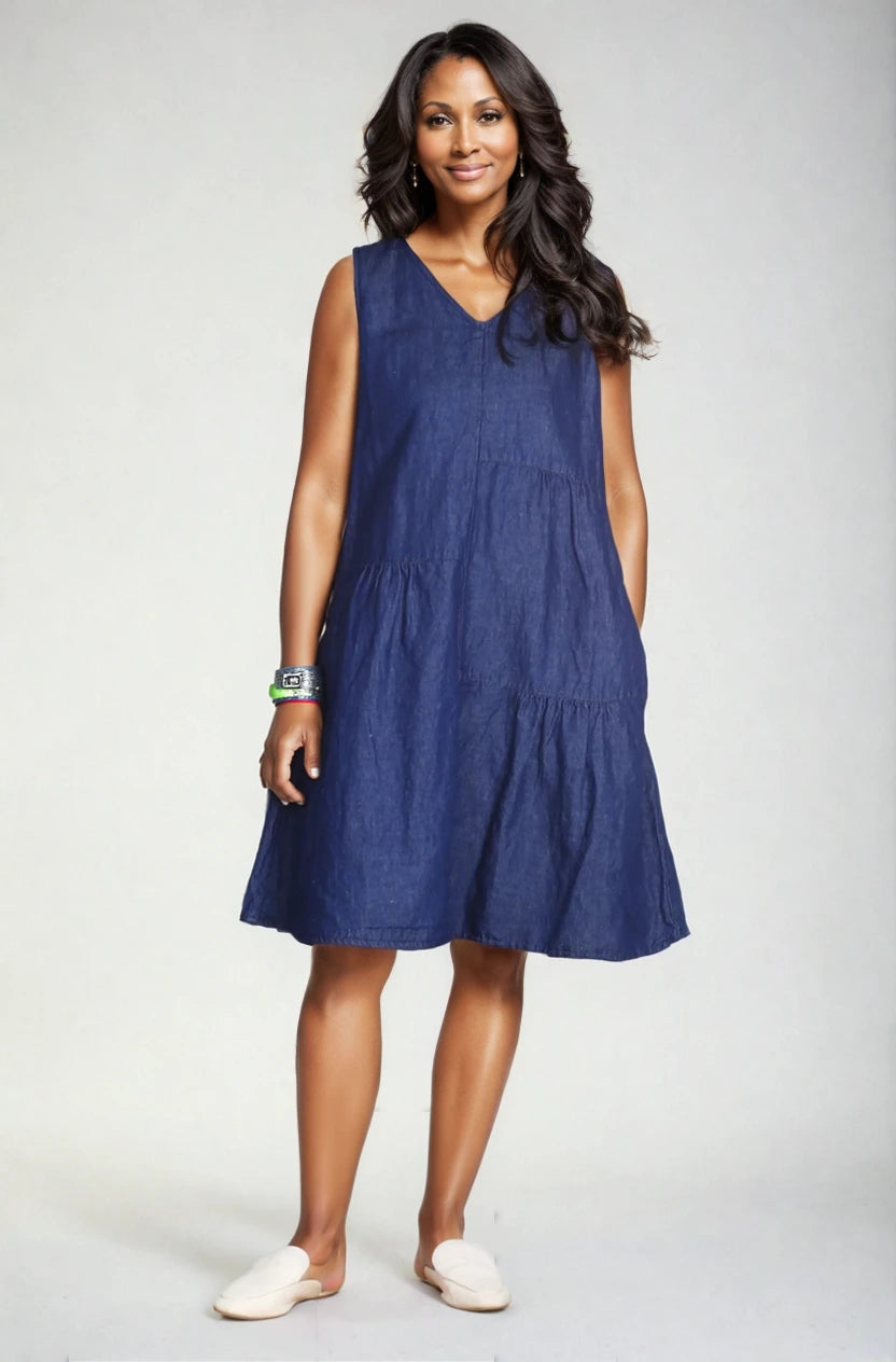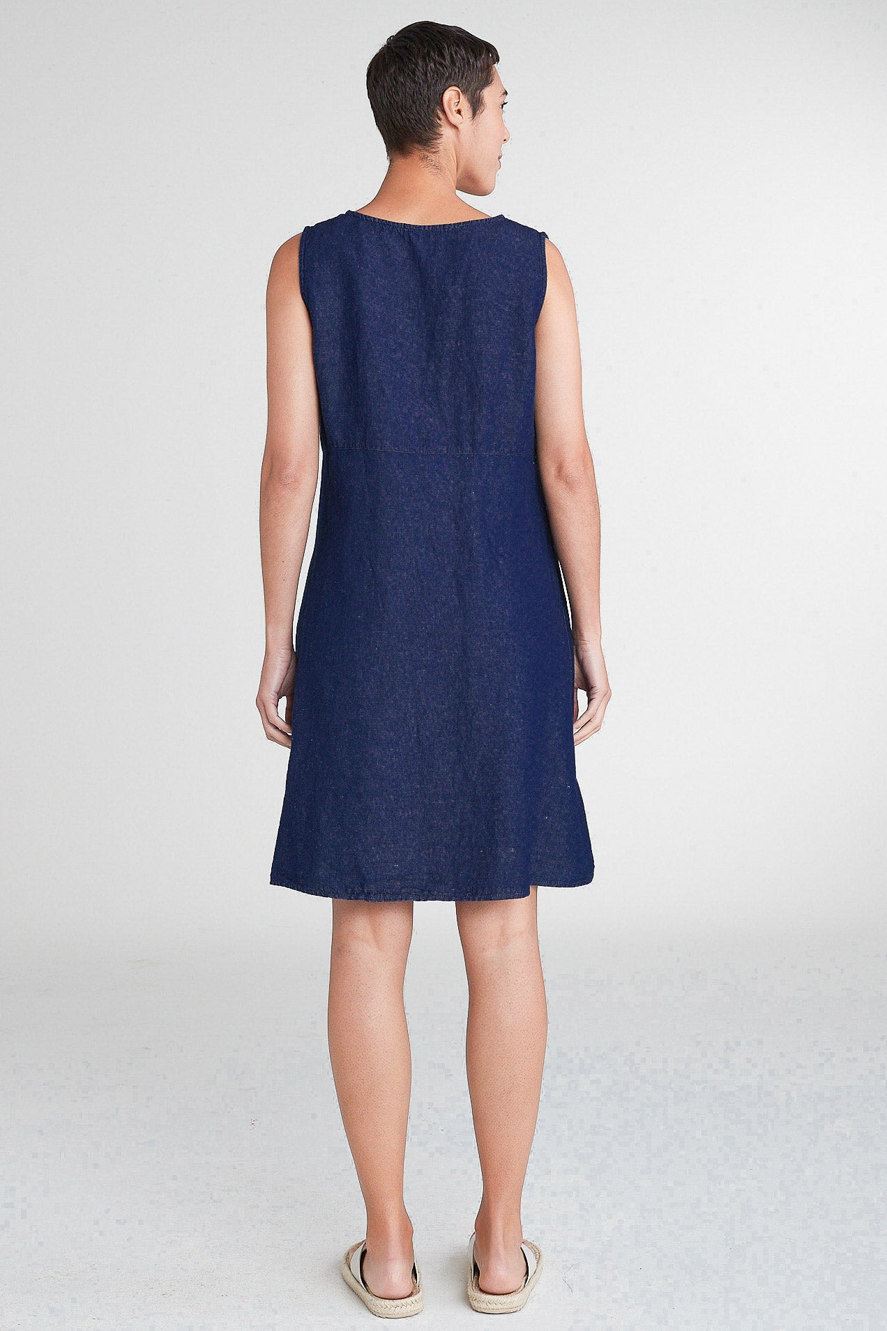 Introducing the Patch Dress by Cut Loose – the iconic dress style from Cut Loose in a new Flax Denim fabric! This style features a sleeveless design with a delicate V-neckline and eye-catching asymmetric pleated panels on the front, creating a beautifully tiered effect. The back is kept smooth for a sleek silhouette. And not to mention, it also comes with two convenient on seam pockets. Falls above the knees on most.