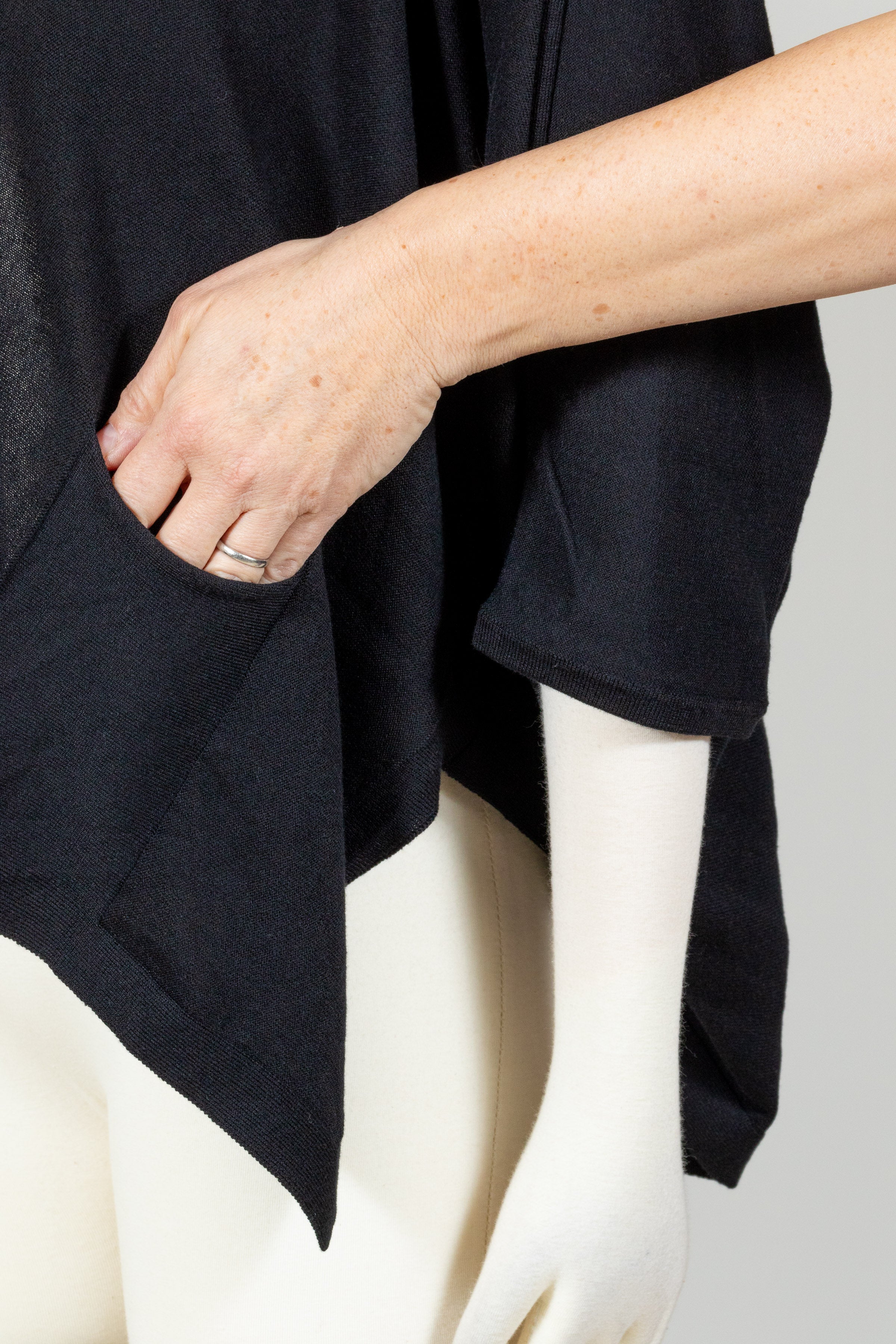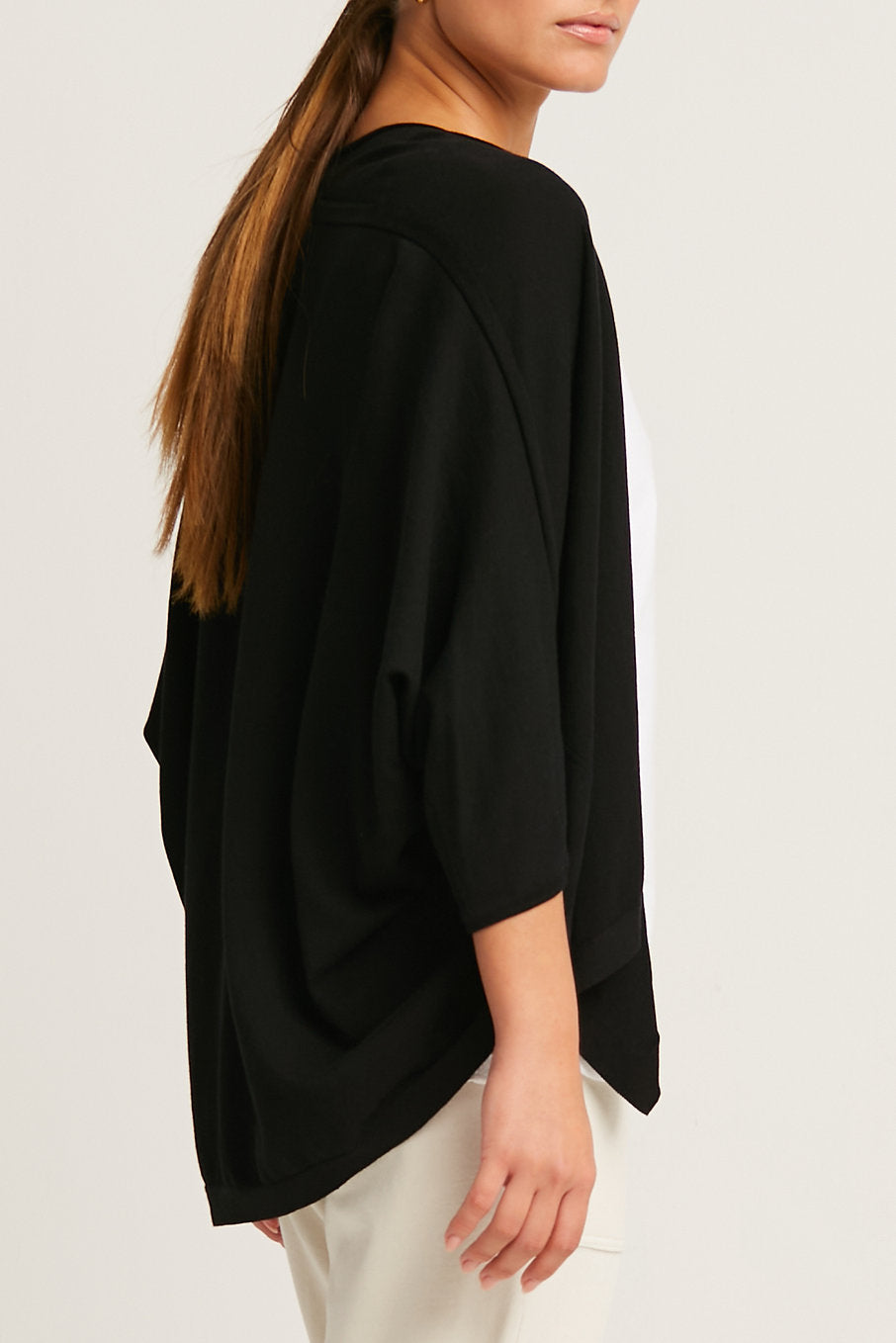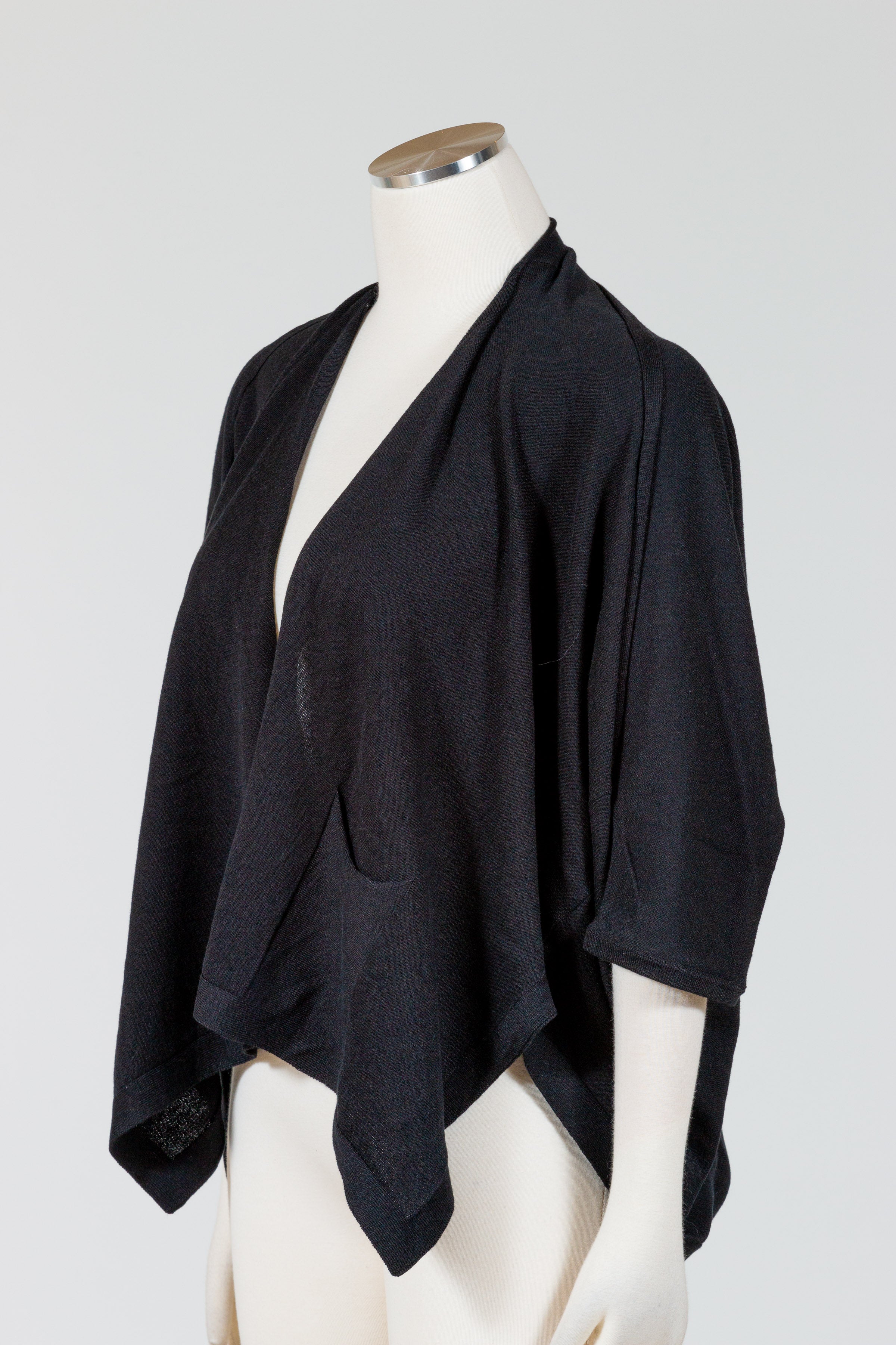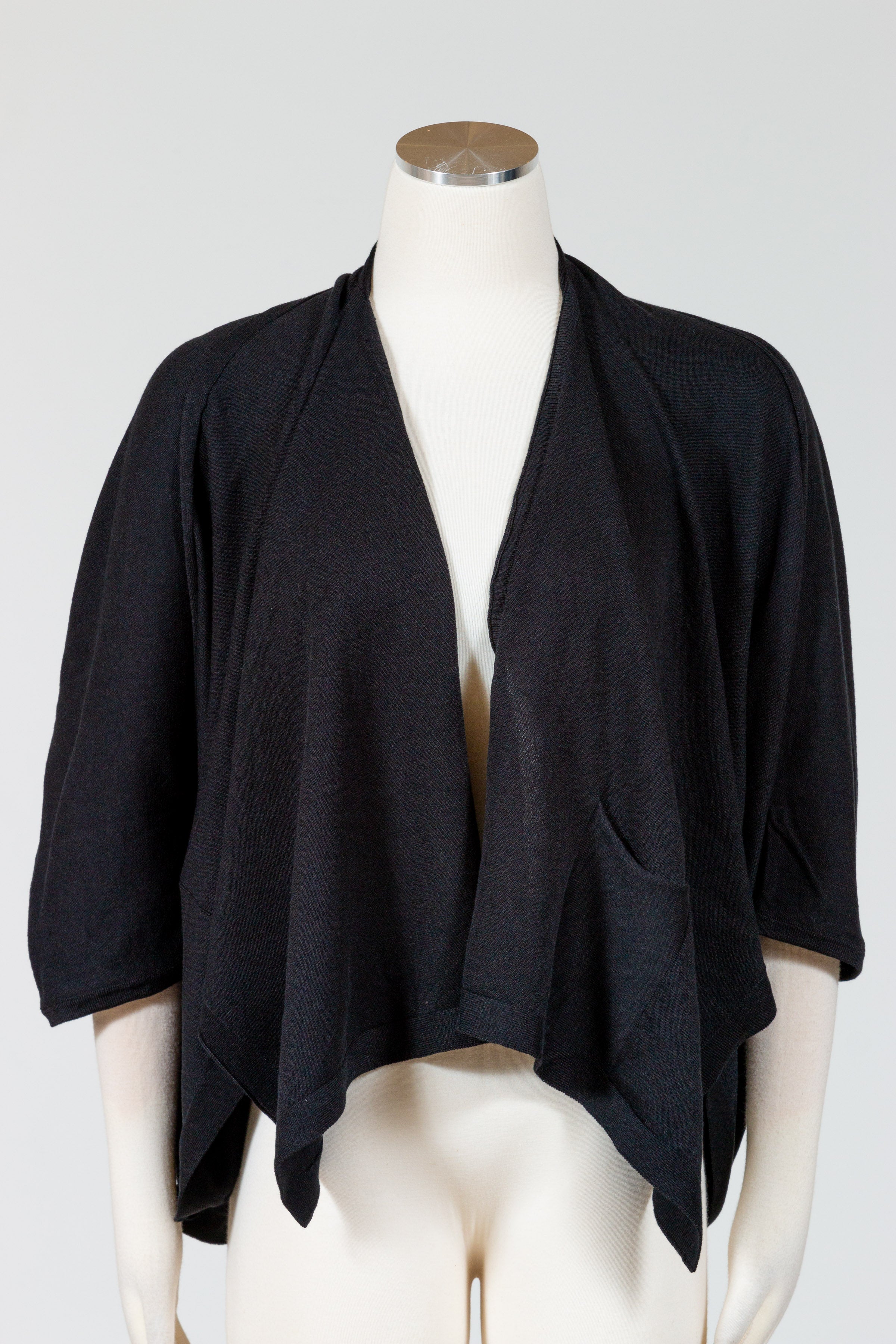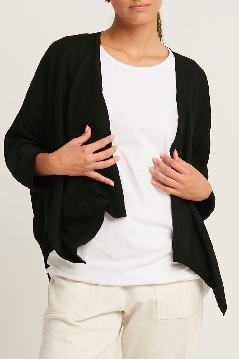 PLANET by Lauren G’s Pocket Cardi is a lightweight tissue knit cardigan made of soft luxurious Pima Cotton and Modal. Open front, this three quarter sleeved cardi has a loose, drapey cocoon shape. A perfect topper over a tank or dress. Falls over the hips. Features one patch pocket.Â