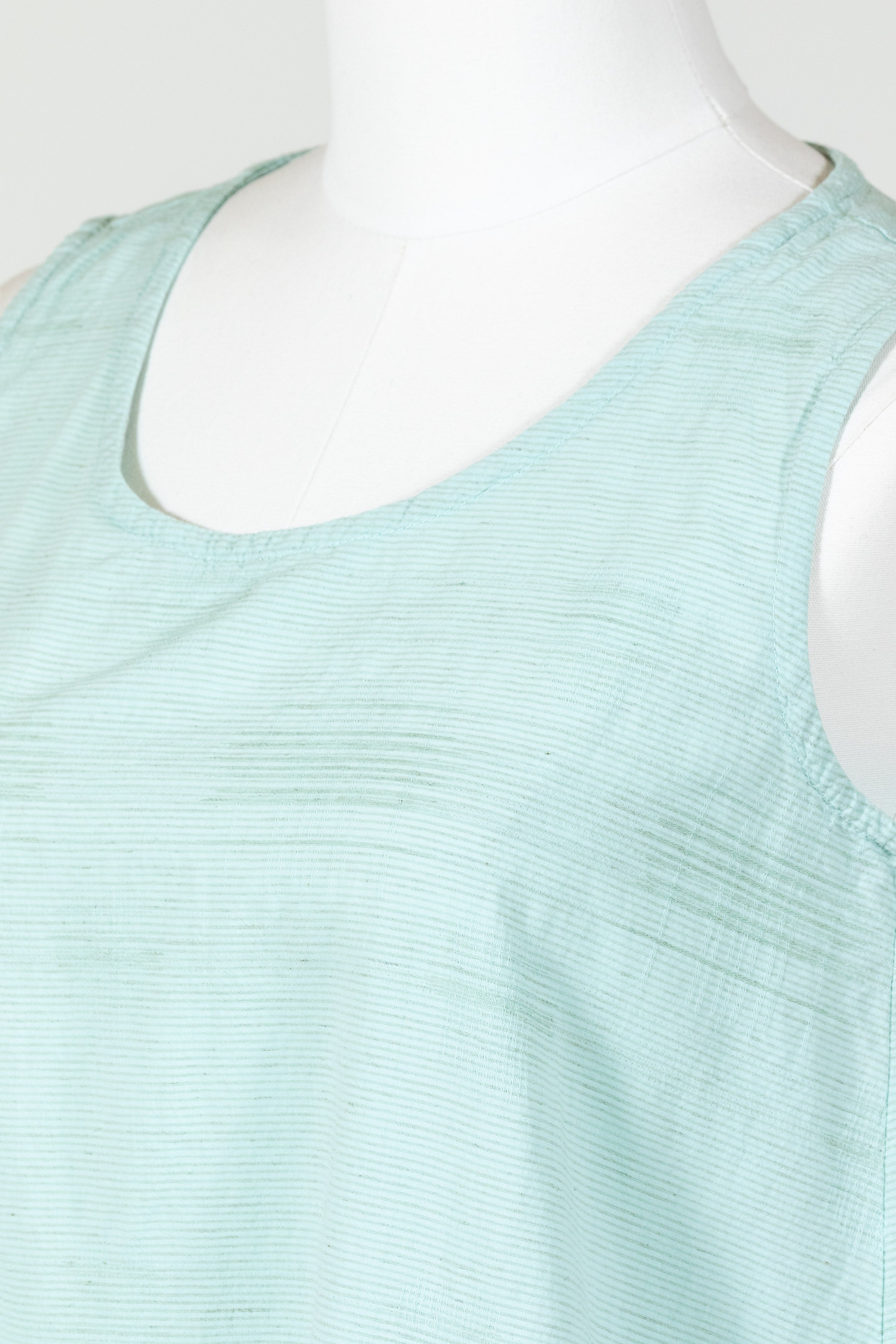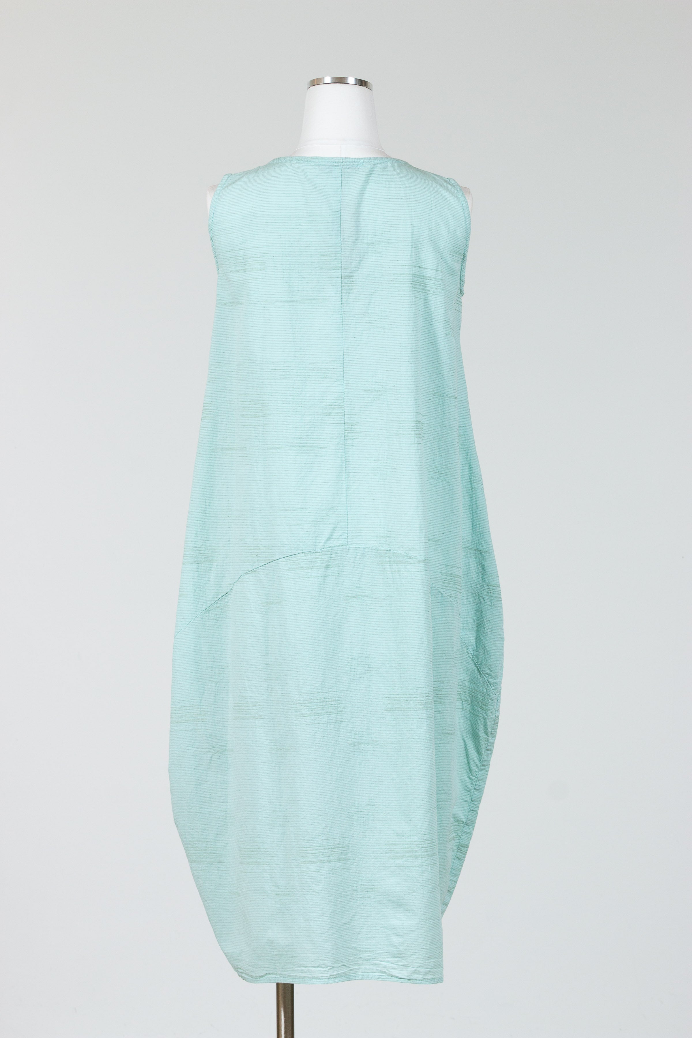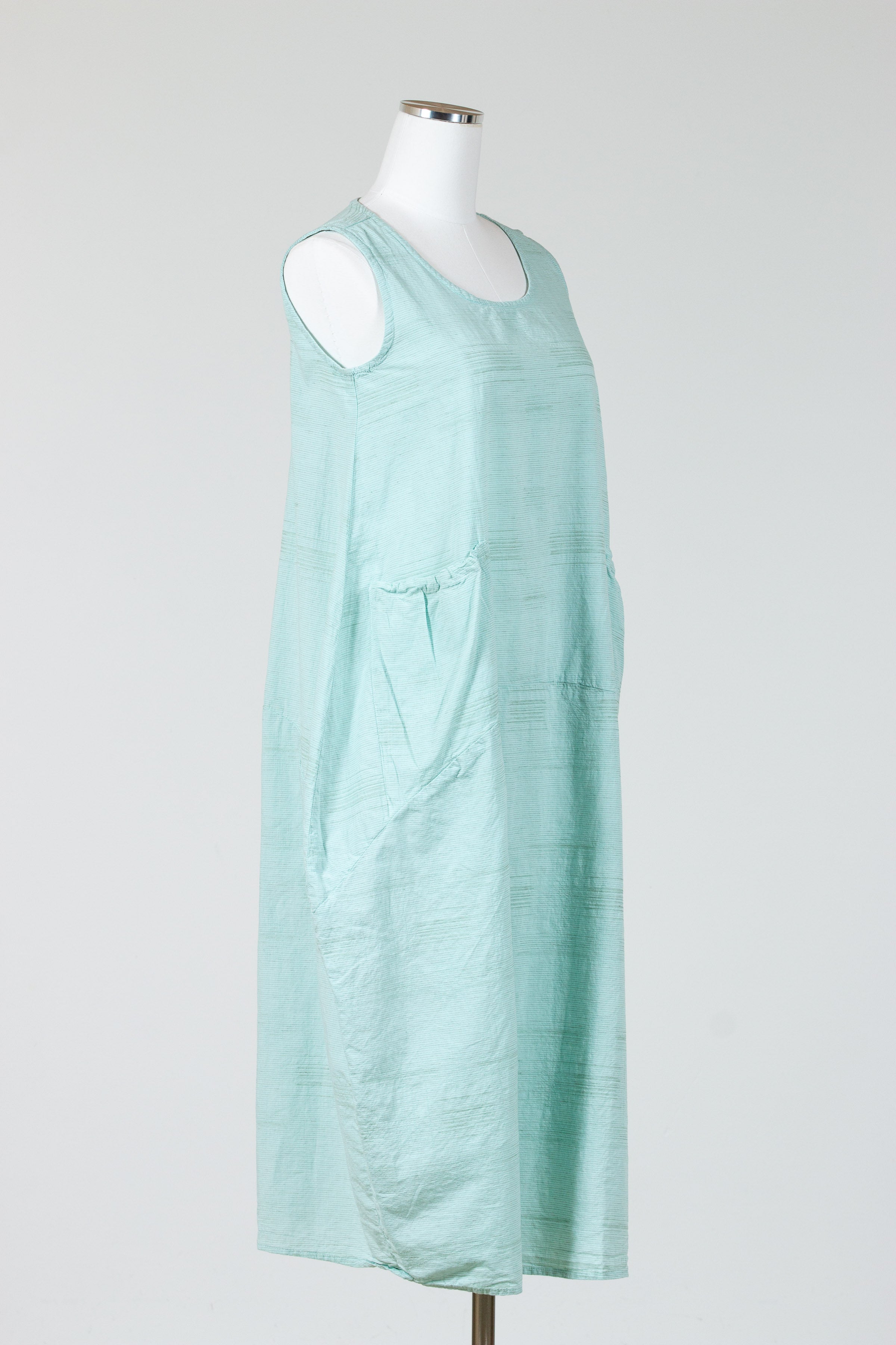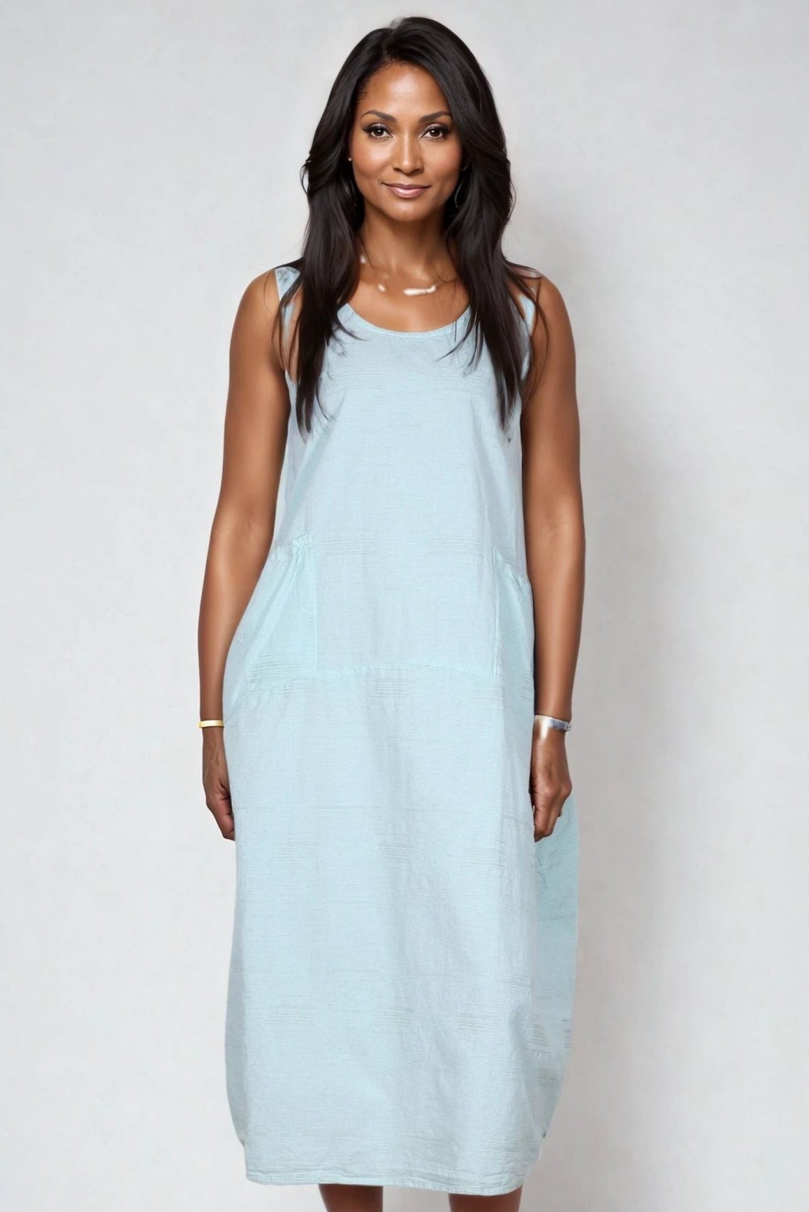 The Pocket Dress by Cut Loose is a sleeveless bubble dress with a textured stripe design. This one-of-a-kind and timeless dress has a midi length, crew neck, and a flattering silhouette. With an oversized, loose fit and two slouchy front pockets, this dress is made from a lightweight woven cotton linen fabric to keep you cool all season long. Offered in Fountain, a minty green blue tone that looks great with a whiten topper!