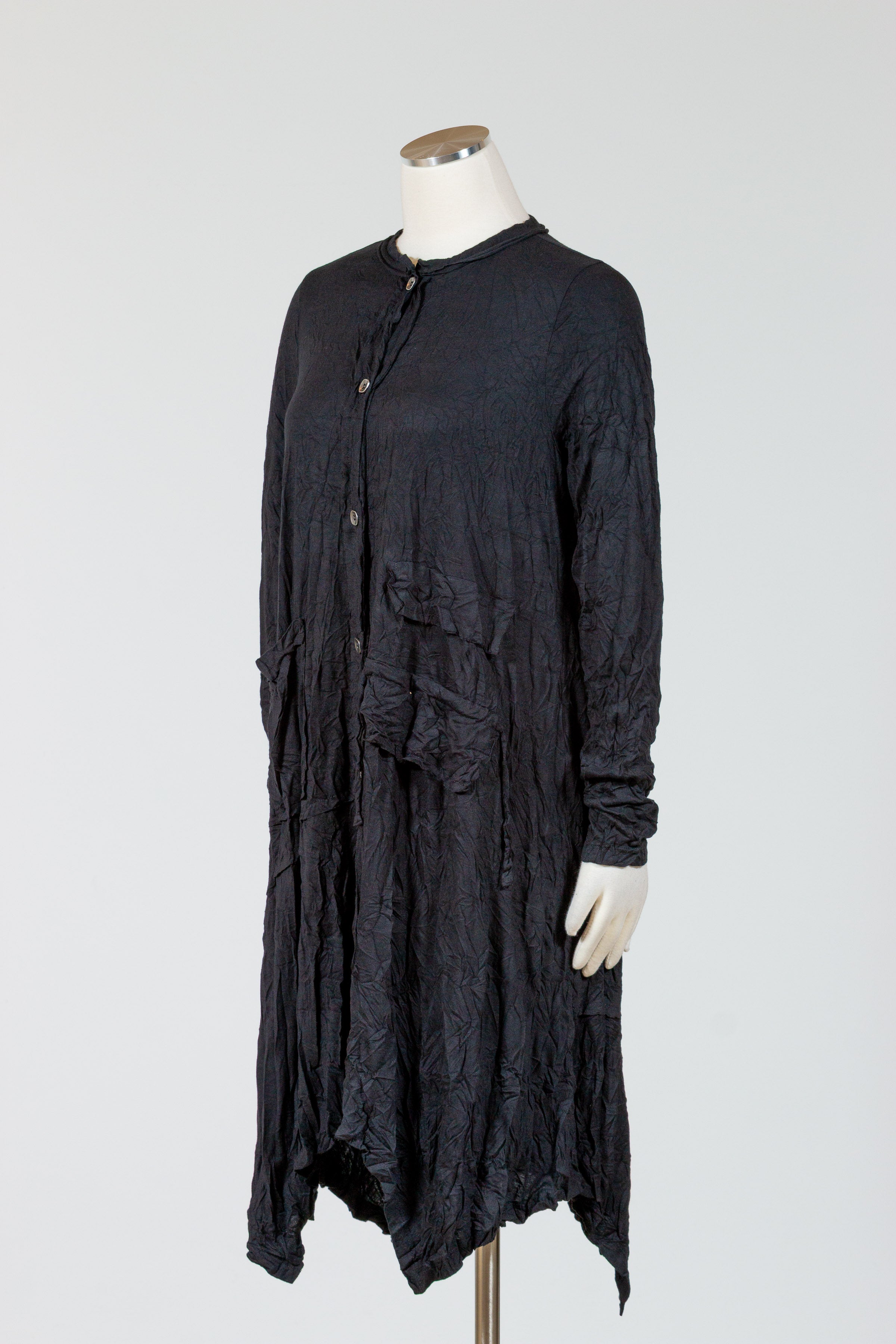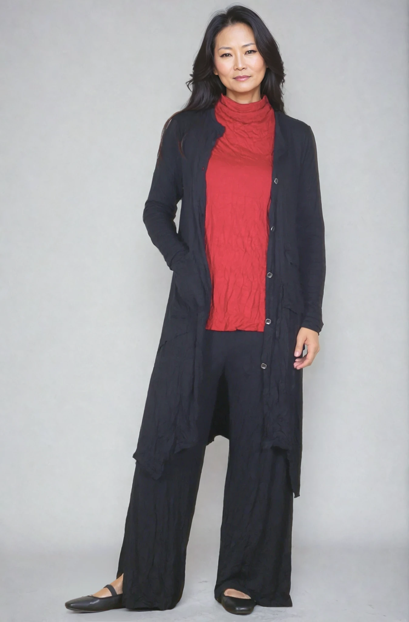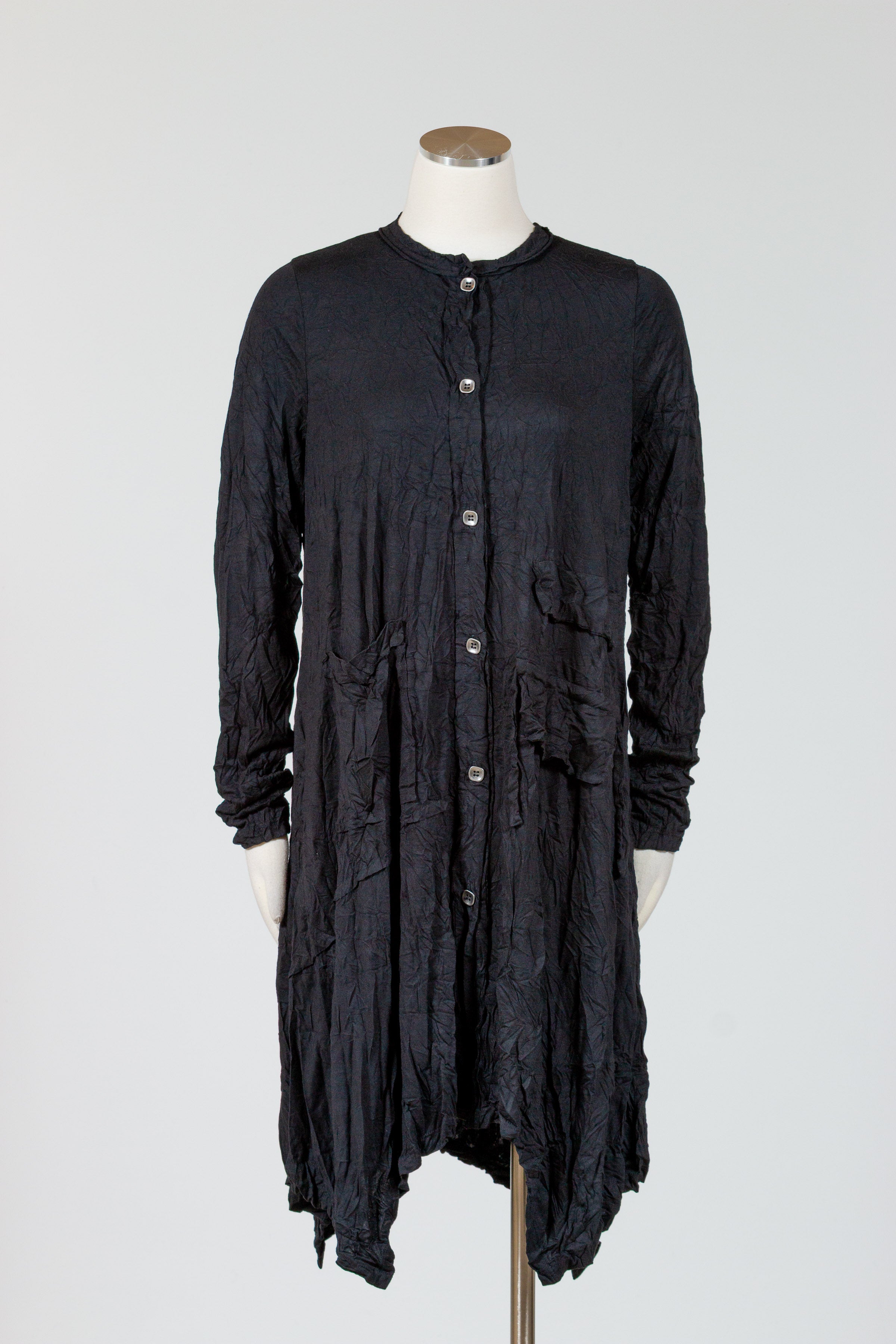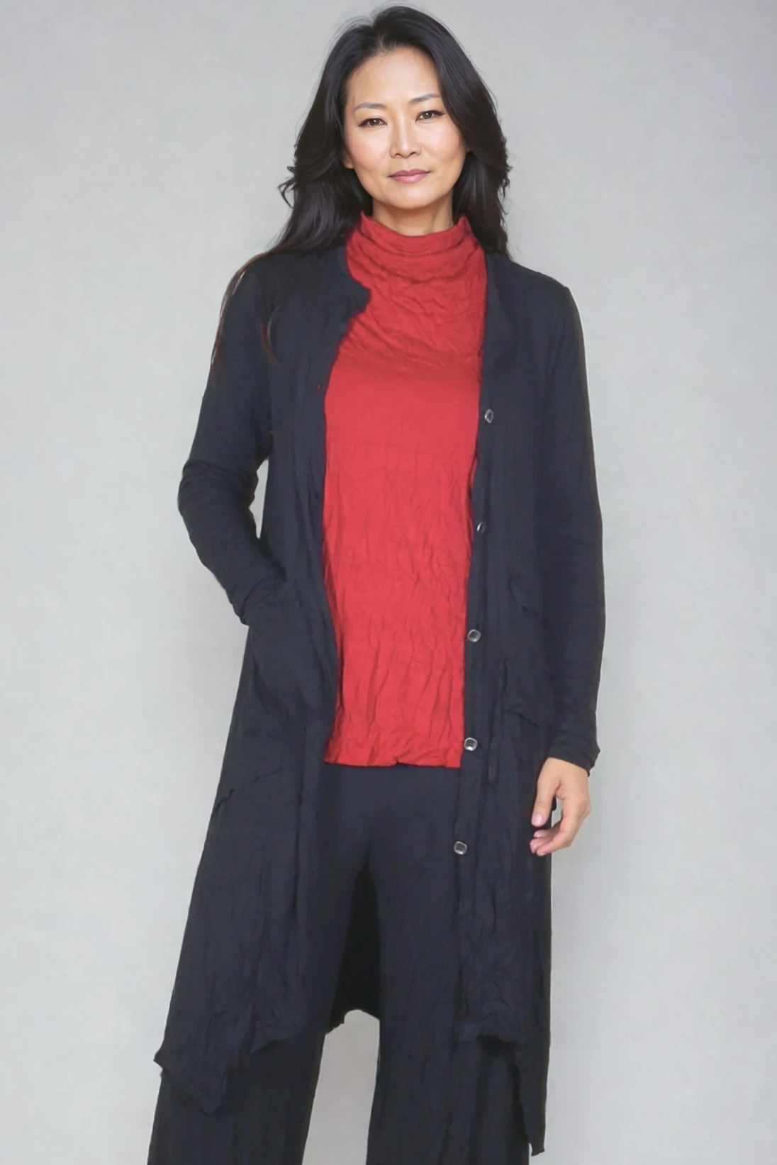 Chalet’s Rosie Jacket is a chic, knee-length crinkle knit topper with a button-front design and long sleeves. It skims the body beautifully, offering an effortlessly flattering silhouette. Unique details like an asymmetrical hem, raised seams, and square metal buttons lend a touch of industrial chic. With two faux pockets on the left hip and a single patch pocket on the right, this piece balances form and function. A stylish and sophisticated layer perfect for elevating any look.