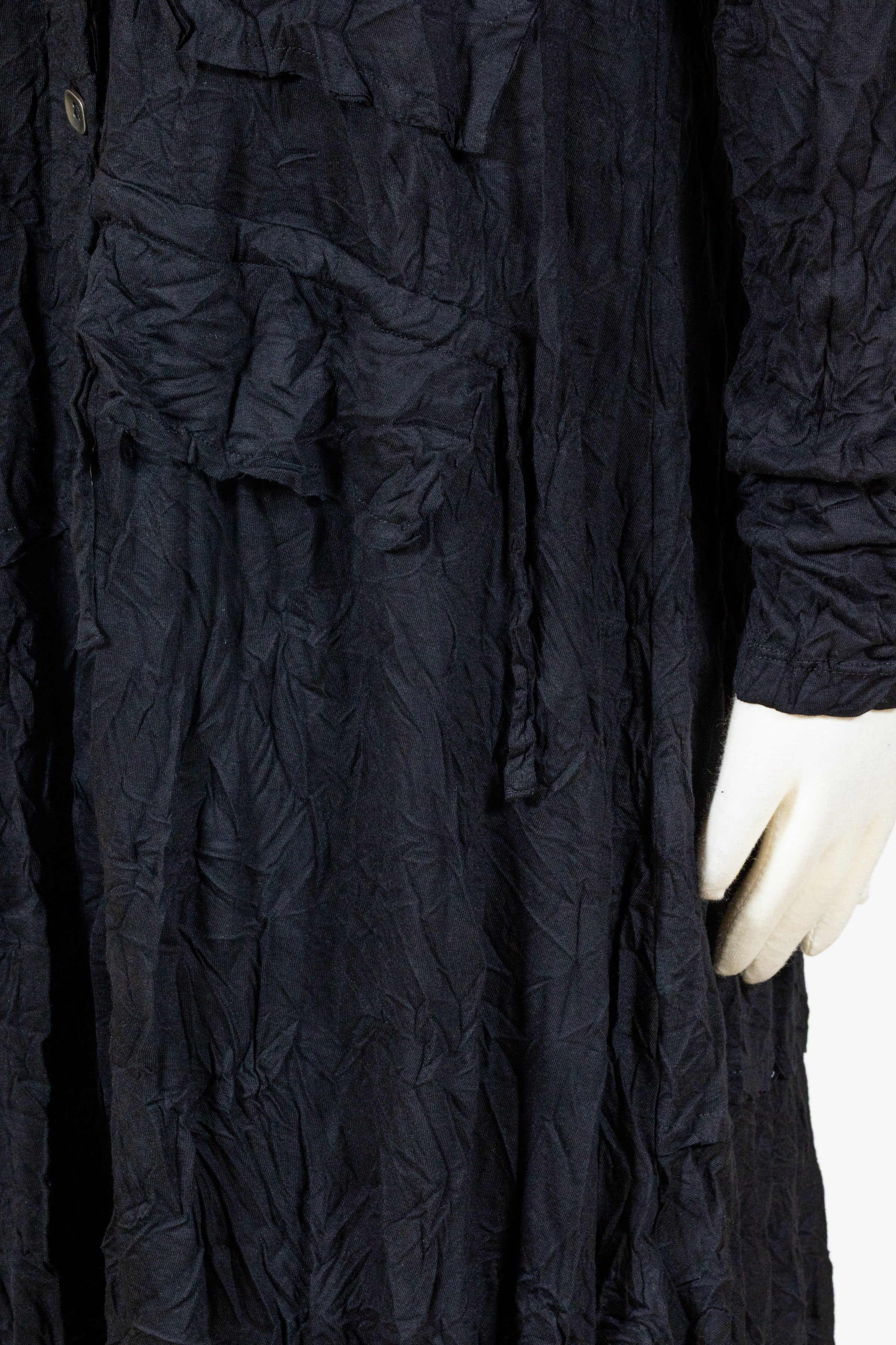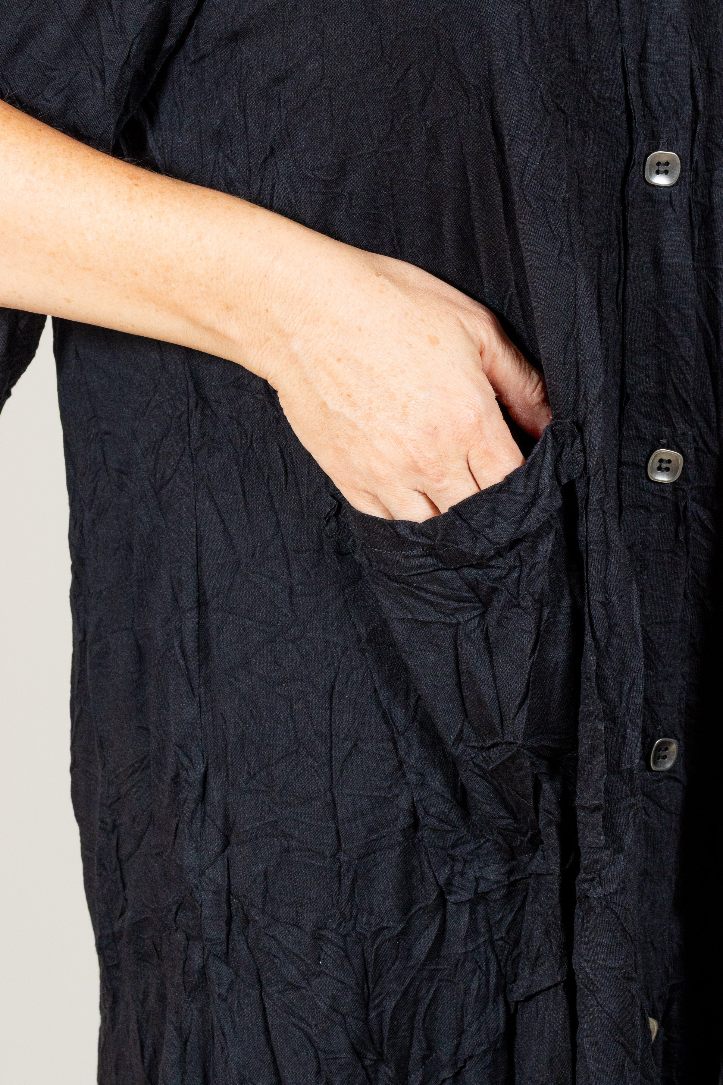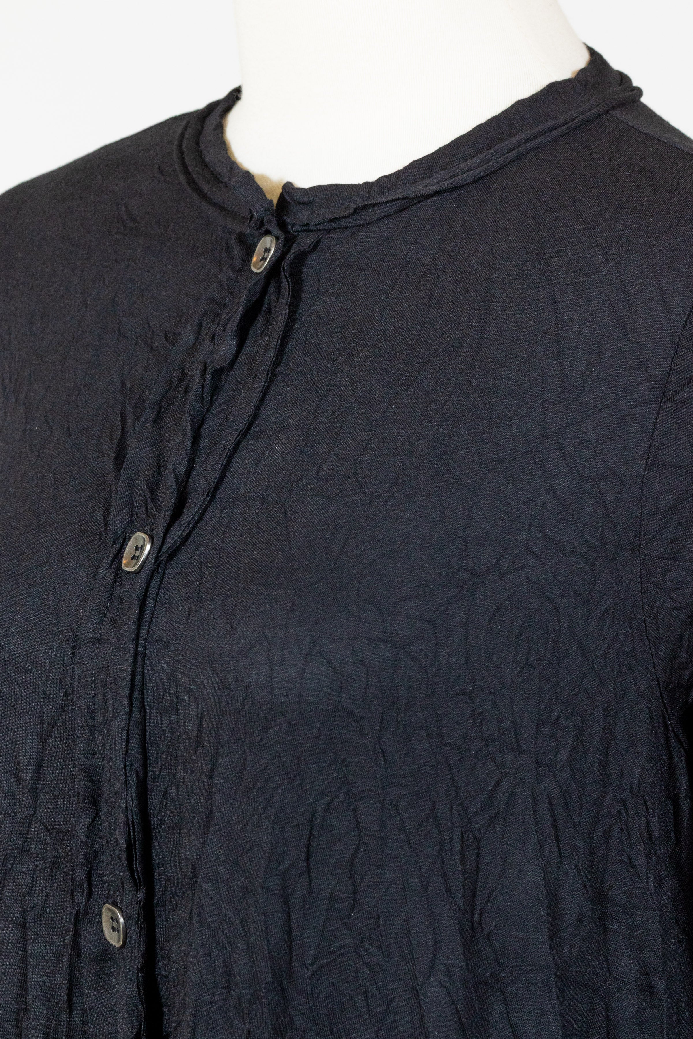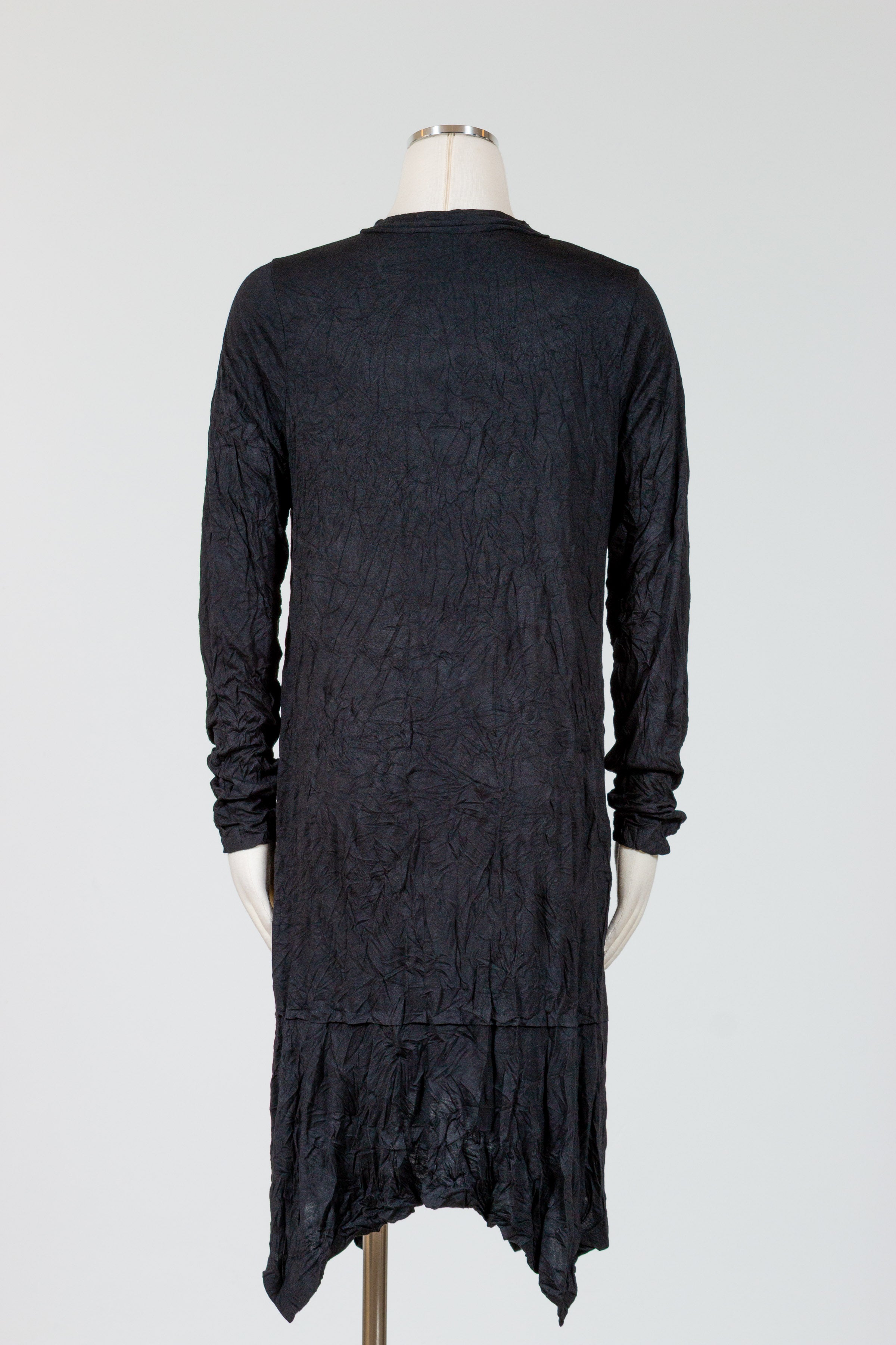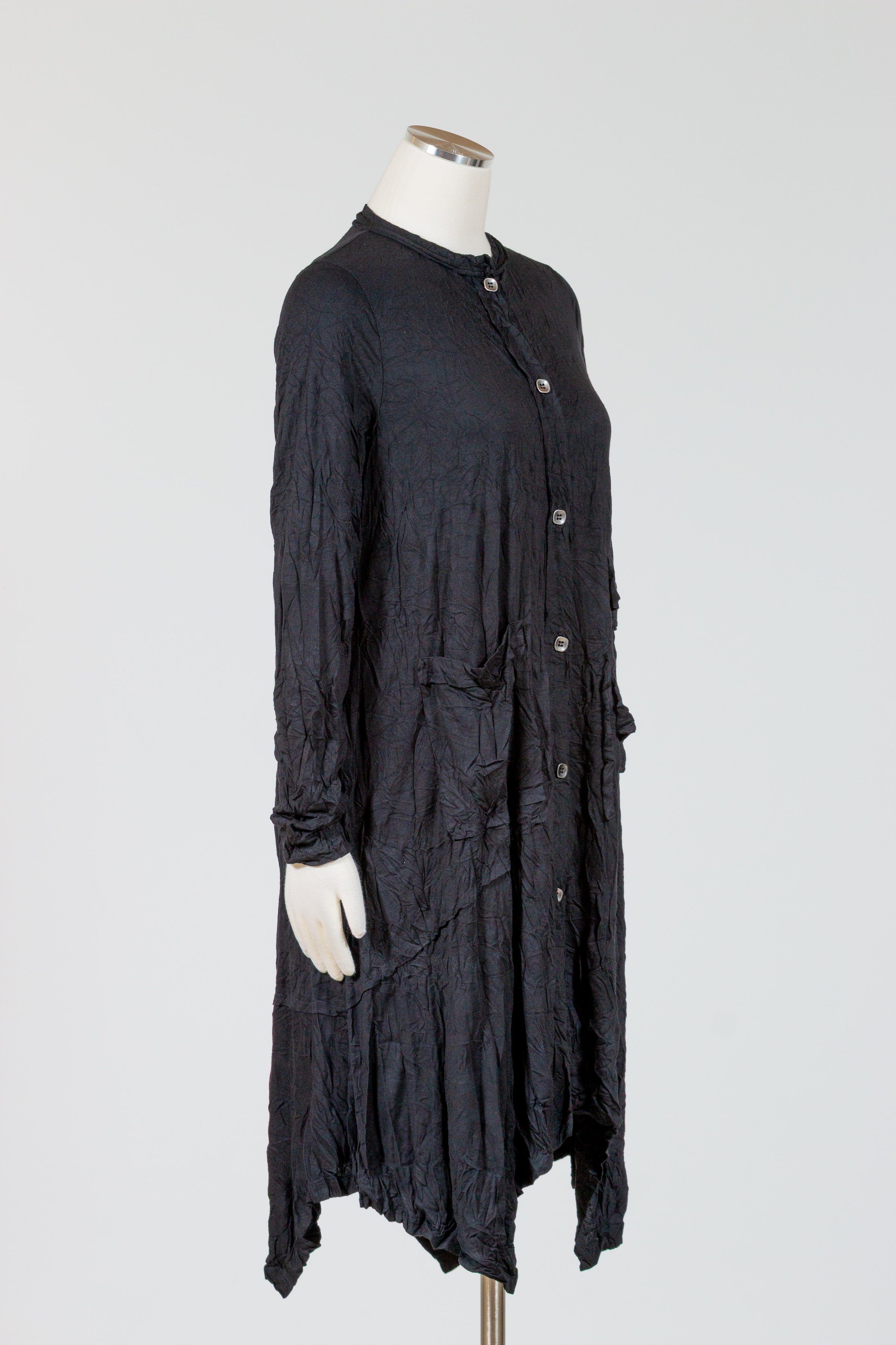 Chalet’s Rosie Jacket is a chic, knee-length crinkle knit topper with a button-front design and long sleeves. It skims the body beautifully, offering an effortlessly flattering silhouette. Unique details like an asymmetrical hem, raised seams, and square metal buttons lend a touch of industrial chic. With two faux pockets on the left hip and a single patch pocket on the right, this piece balances form and function. A stylish and sophisticated layer perfect for elevating any look.
