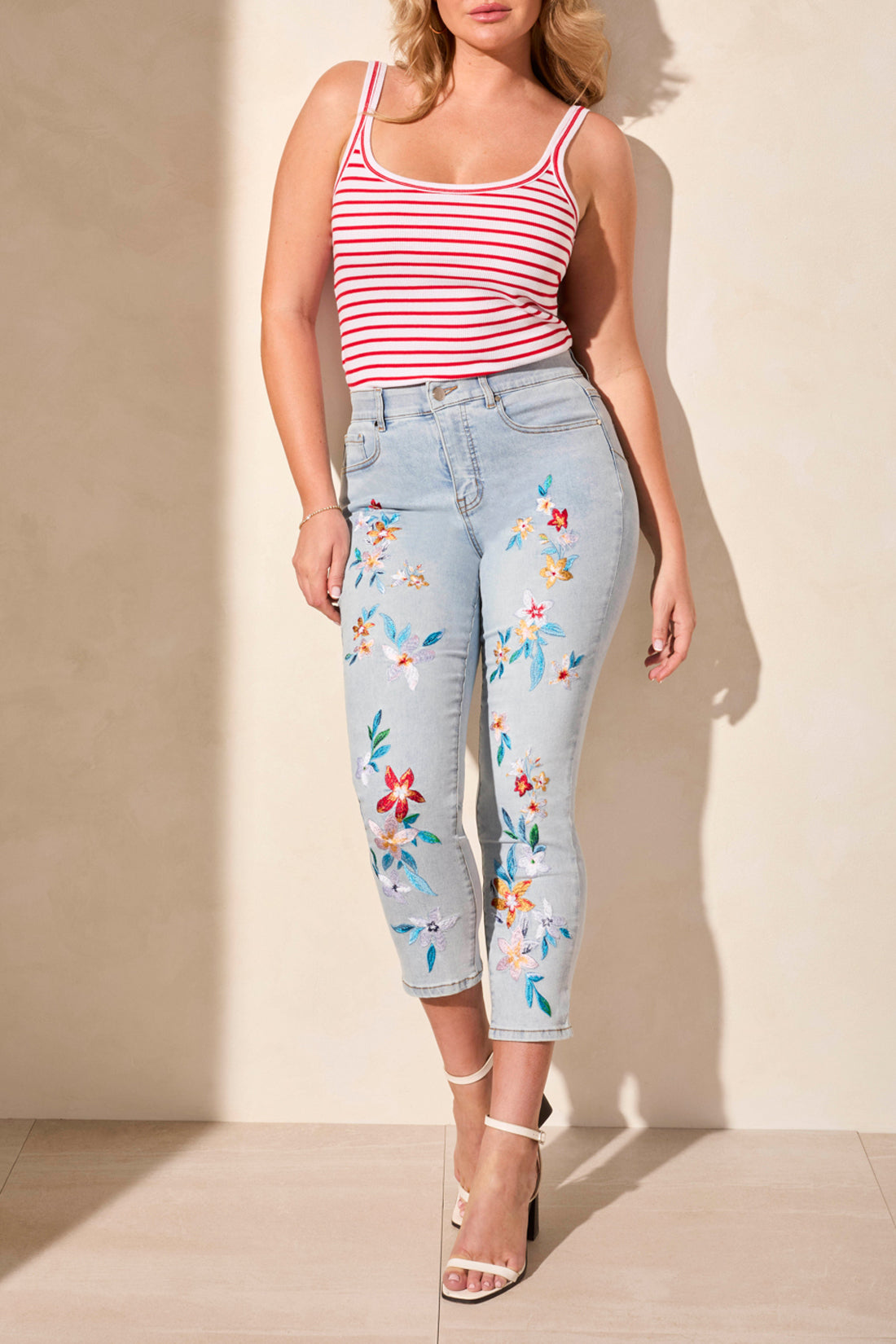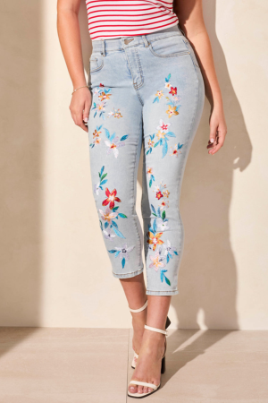 Sophia Curvy Embroidered Slim Crop Jeans from Tribal are a must-have! These stonewashed 5 pocket jeans feature a skinny fit, cropped length, and just the right amount of stretch for comfortable wear all day. Zip fly with button closure. The front legs are adorned with stunning floral embroidery that makes a bold statement. They hit just above the ankle for most wearers, making them both stylish and comfortable.