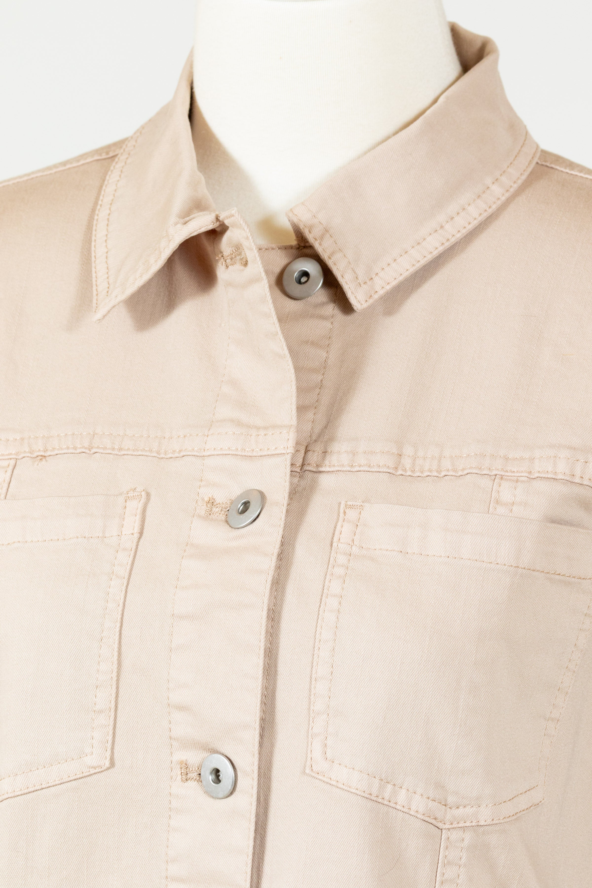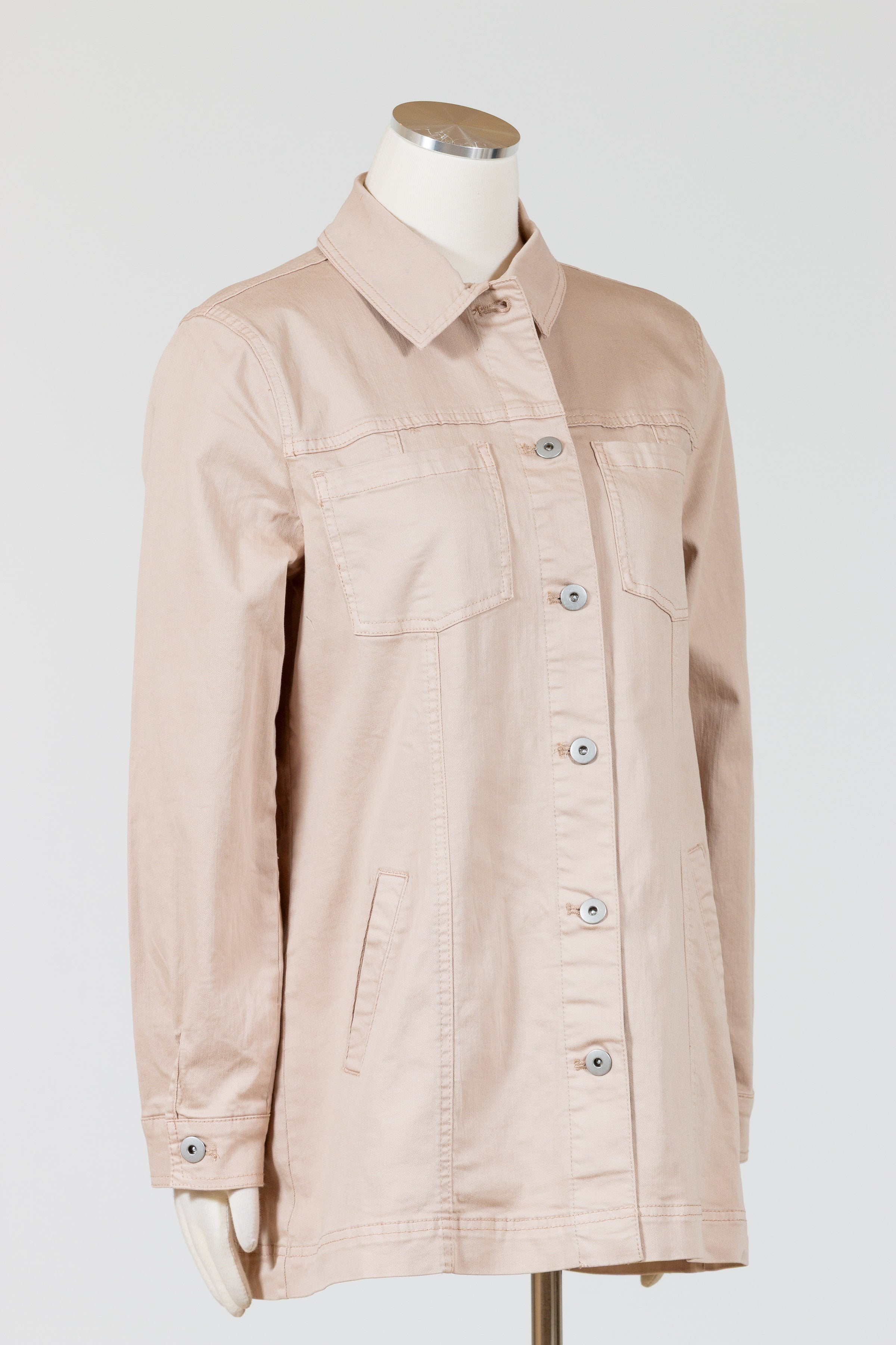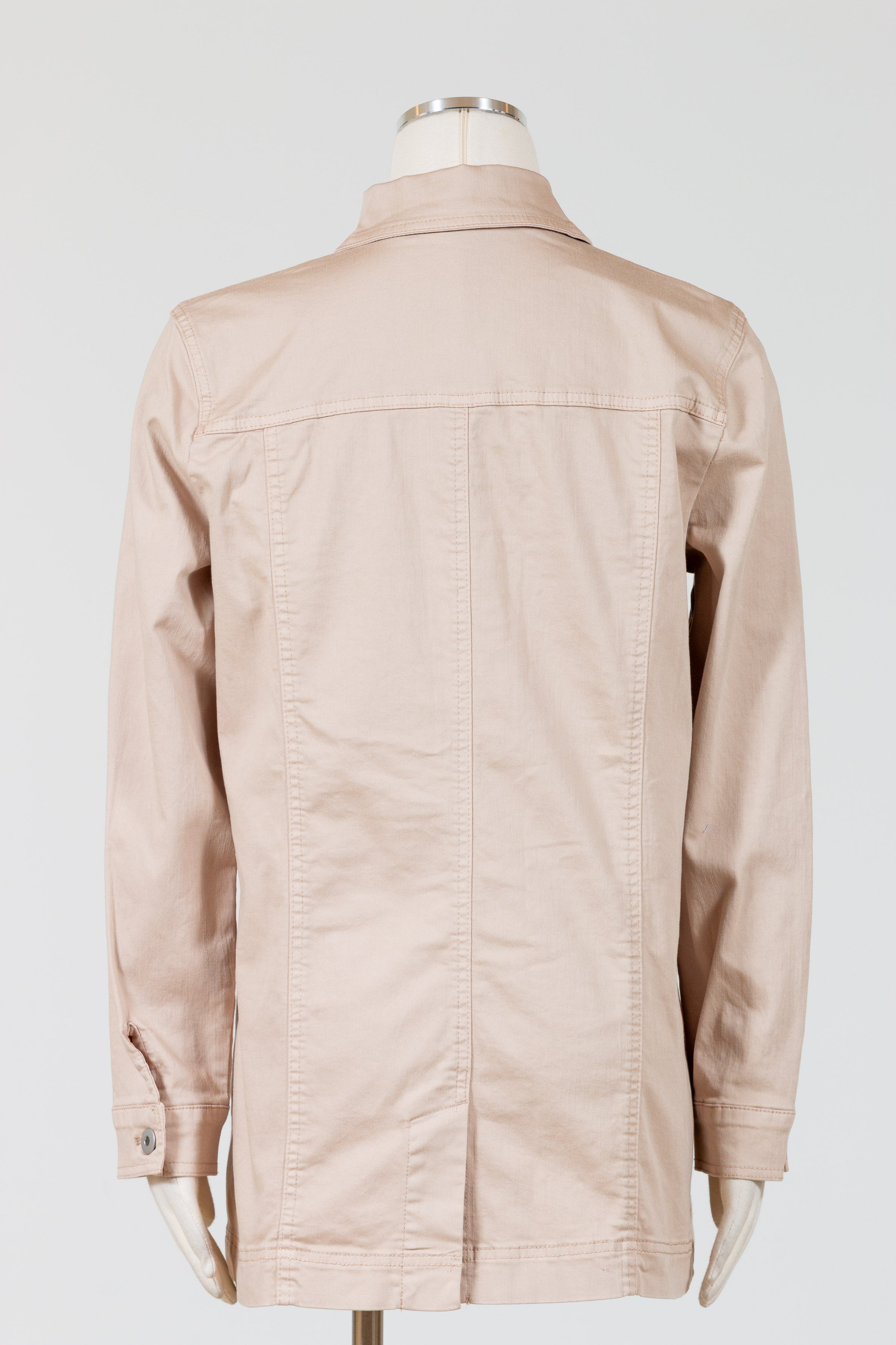 Introducing Habitat’s Denim Boyfriend Jacket – a trendy, fitted tunic length jacket made with stretch denim and a button front. Featuring two front chest pockets and two angled pockets, this lightweight stretch cotton fabric adds comfort and style to your everyday wear. Its long fall over the hips and brushed silver hardware make it a must-have piece in your wardrobe. Center back slit and unlined for a sleek and effortless look. A true essential in every closet!