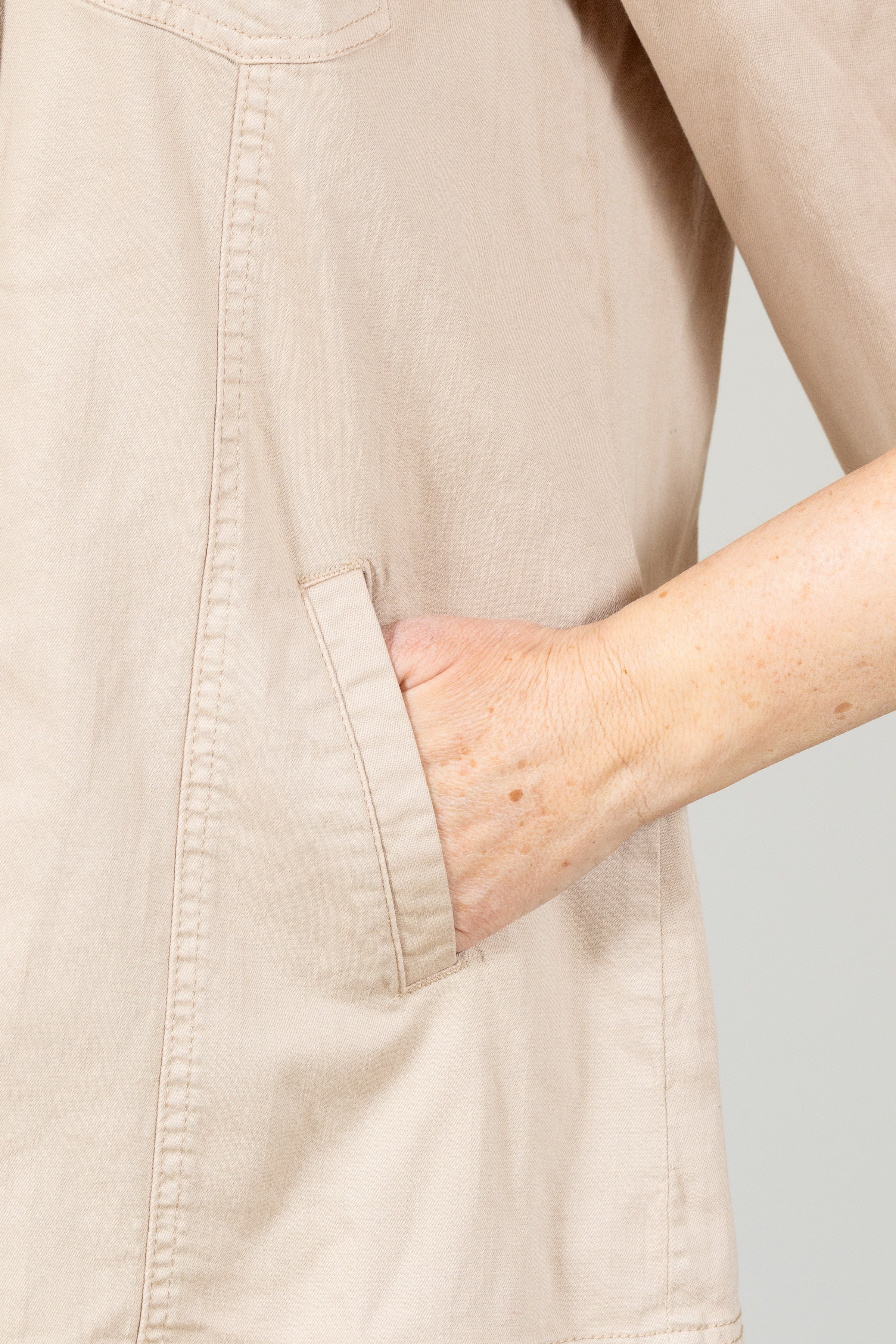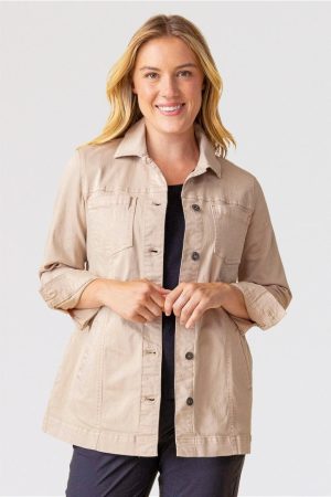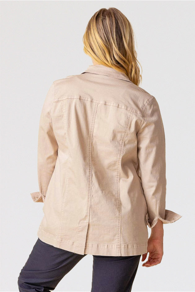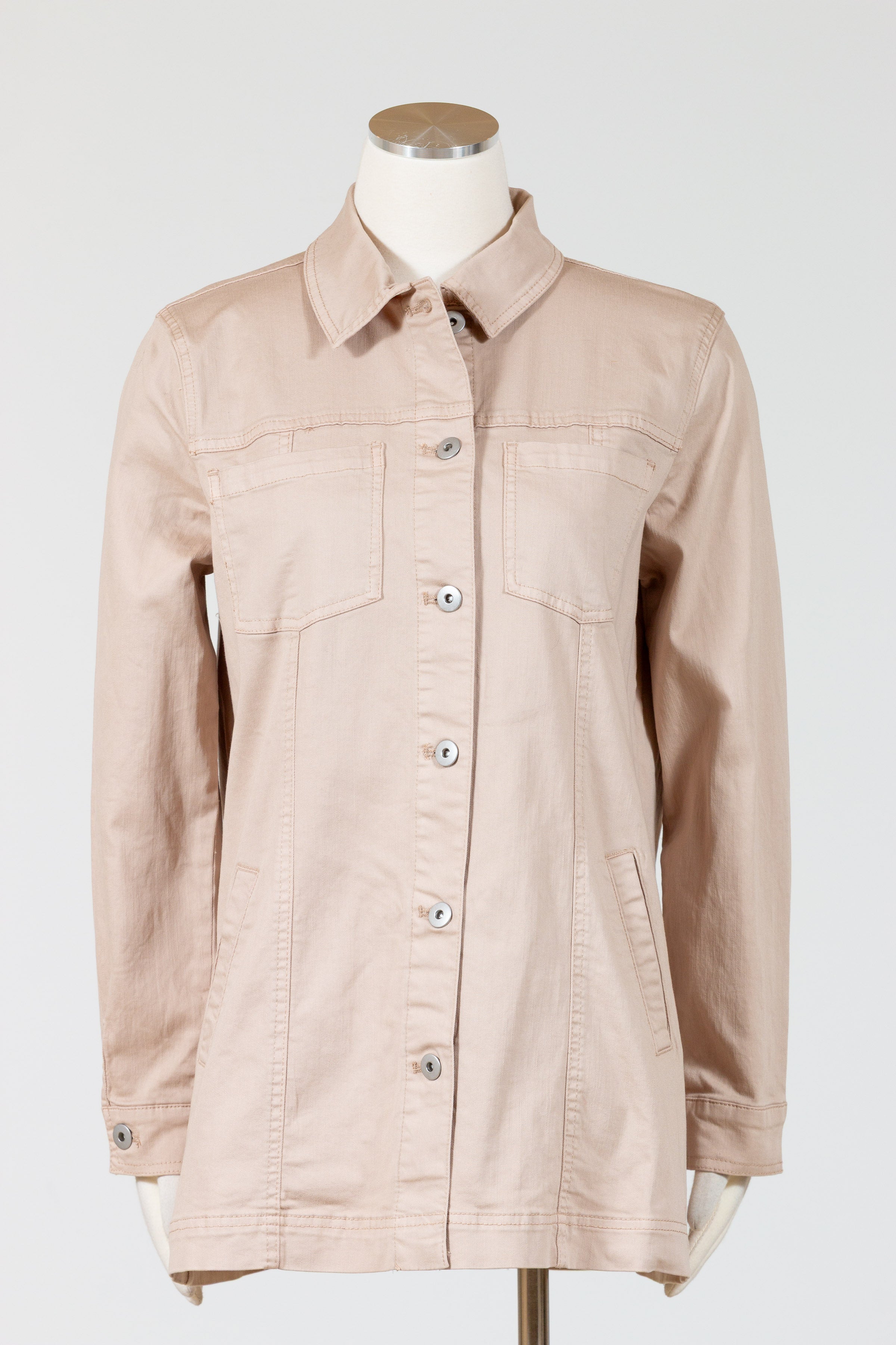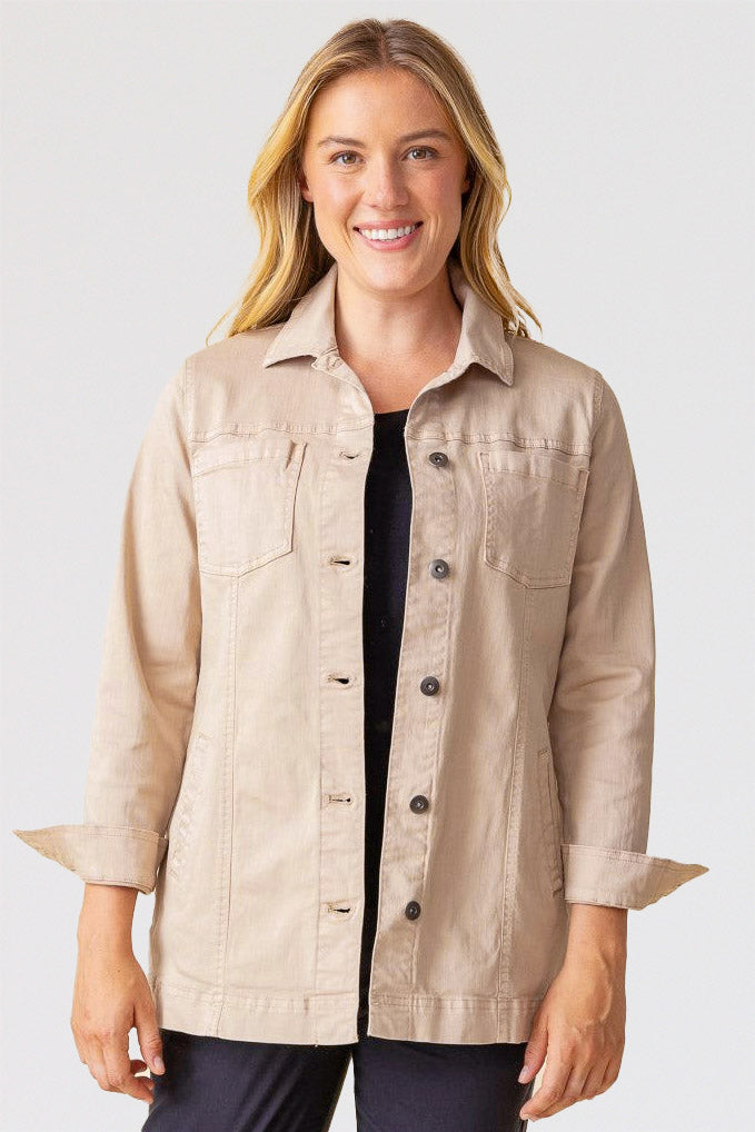 Introducing Habitat’s Denim Boyfriend Jacket – a trendy, fitted tunic length jacket made with stretch denim and a button front. Featuring two front chest pockets and two angled pockets, this lightweight stretch cotton fabric adds comfort and style to your everyday wear. Its long fall over the hips and brushed silver hardware make it a must-have piece in your wardrobe. Center back slit and unlined for a sleek and effortless look. A true essential in every closet!