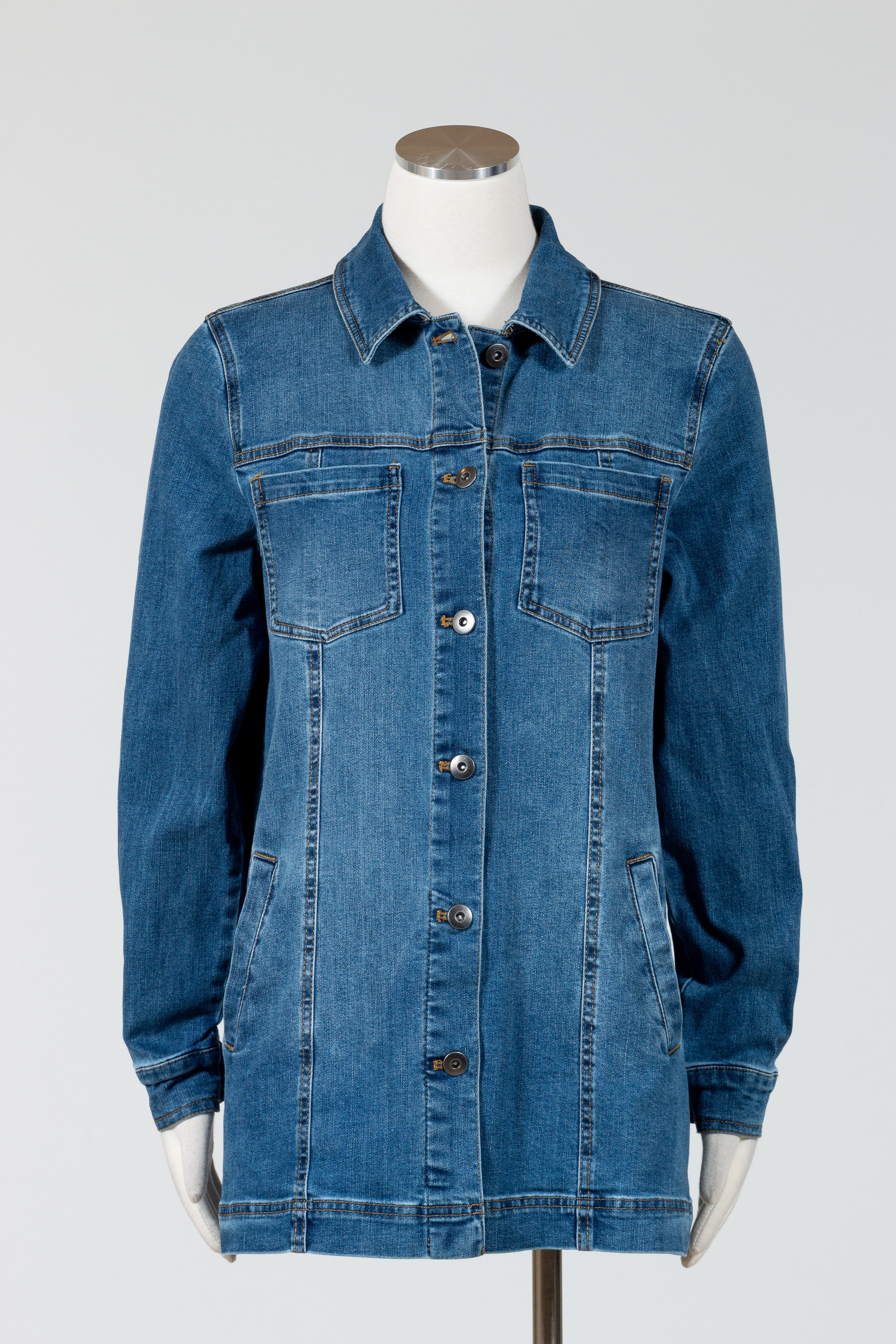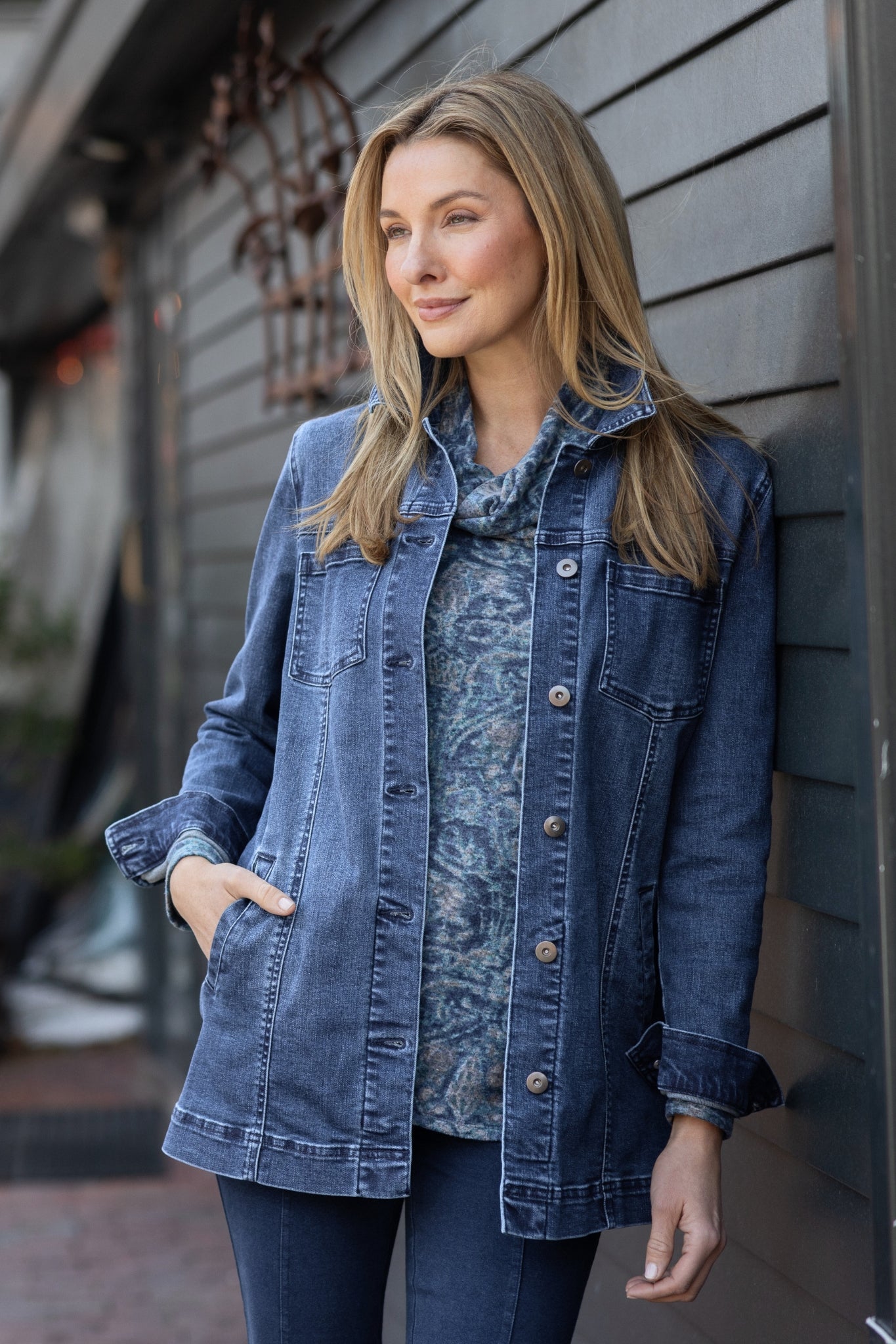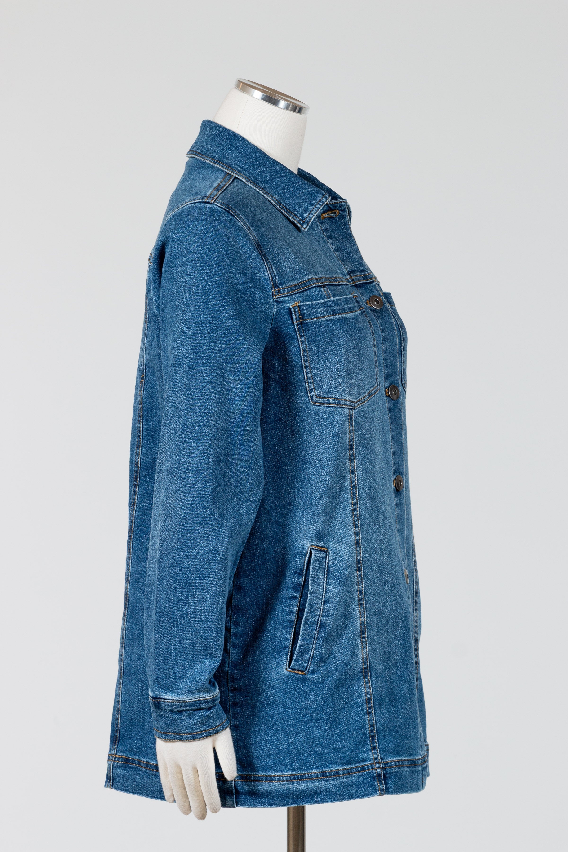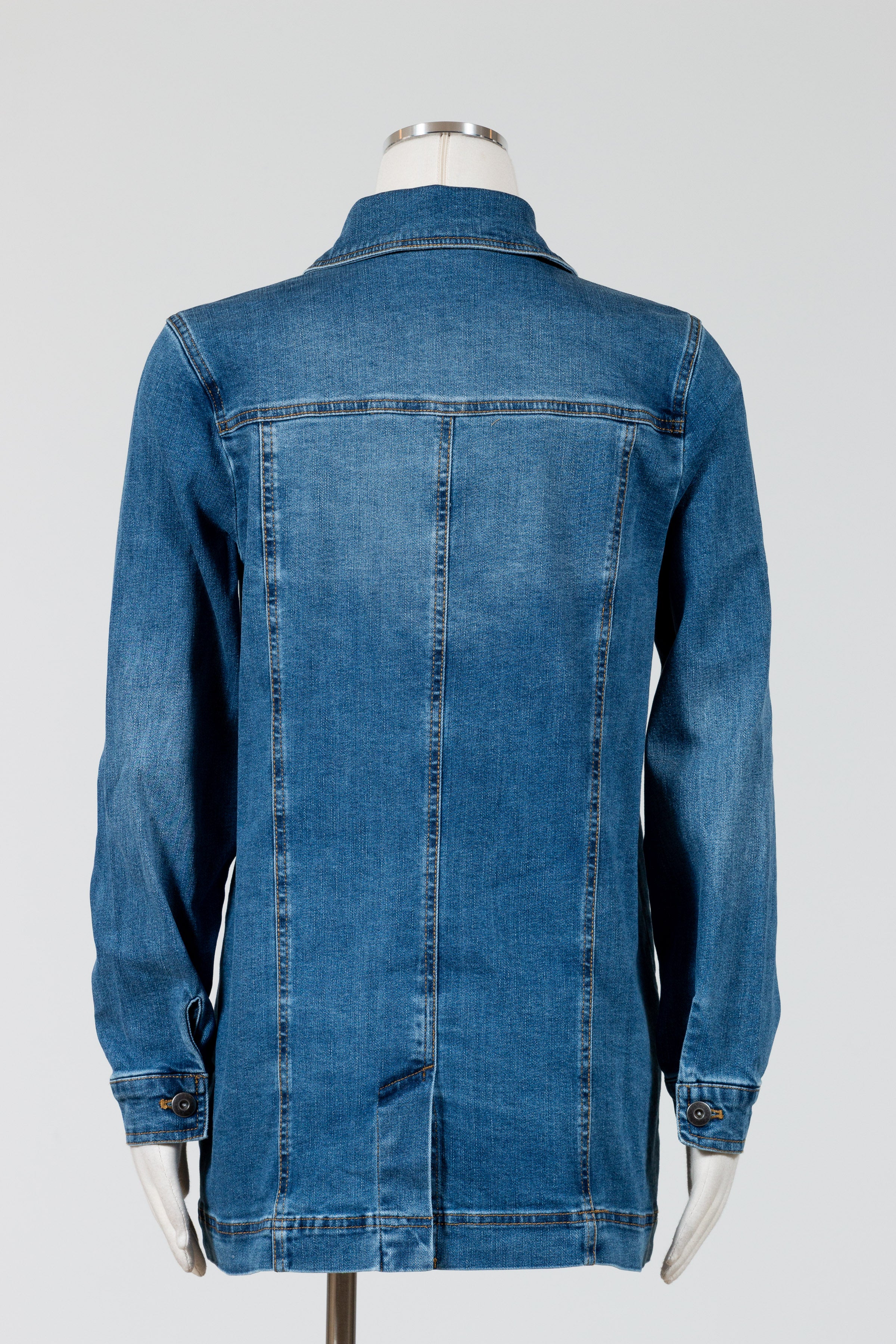 Meet your new go-to layer: Habitat’s Stretch Denim Boyfriend Jacket. Designed in stretch cotton washed denim for ease and comfort, this tunic-length jean jacket features a flattering fitted shape with a button-front closure, chest pockets, and angled side pockets. Brushed antiqued silver hardware and a center back slit add modern detail, while the lightweight, unlined construction keeps it sleek and versatile. Falling over the hips, this jacket is the perfect mix of casual cool and everyday polish — a true wardrobe essential.