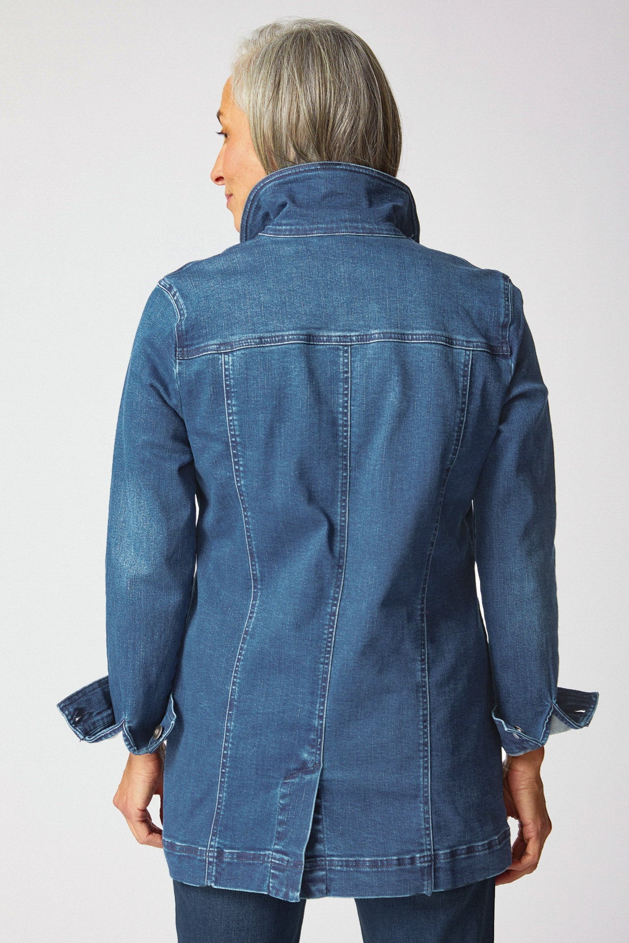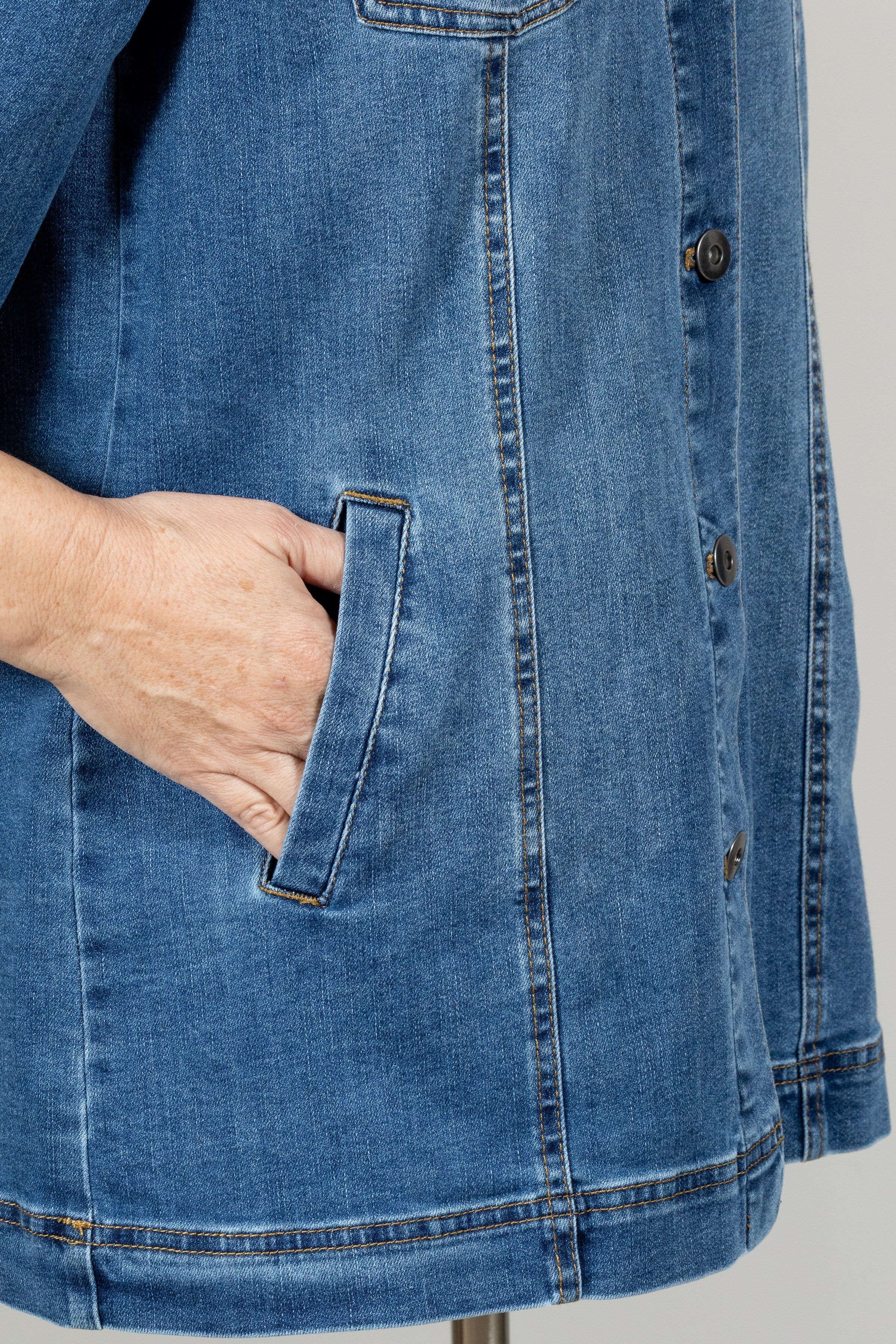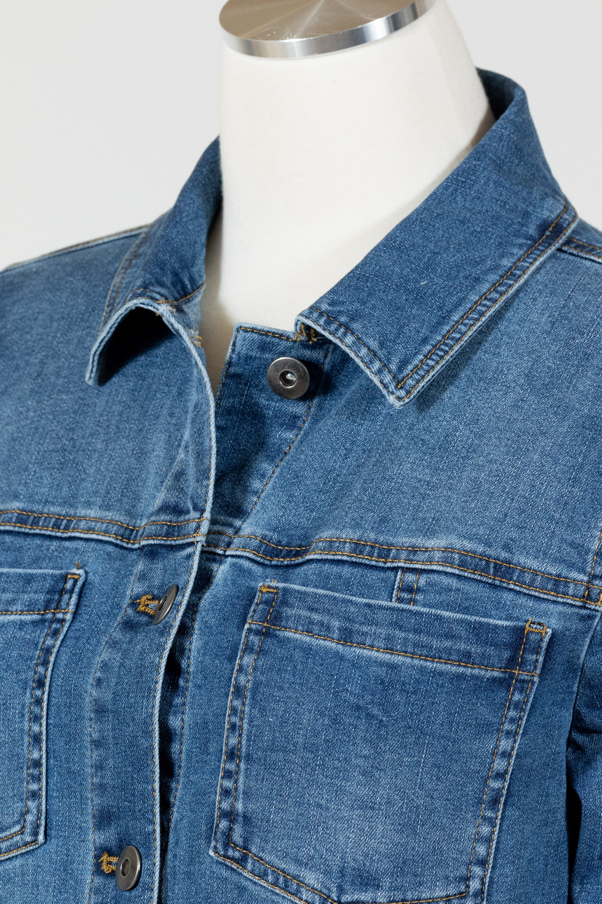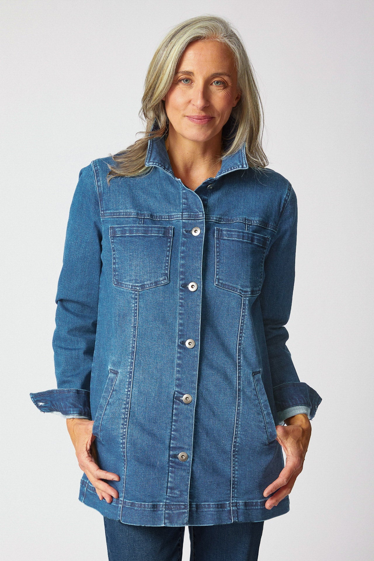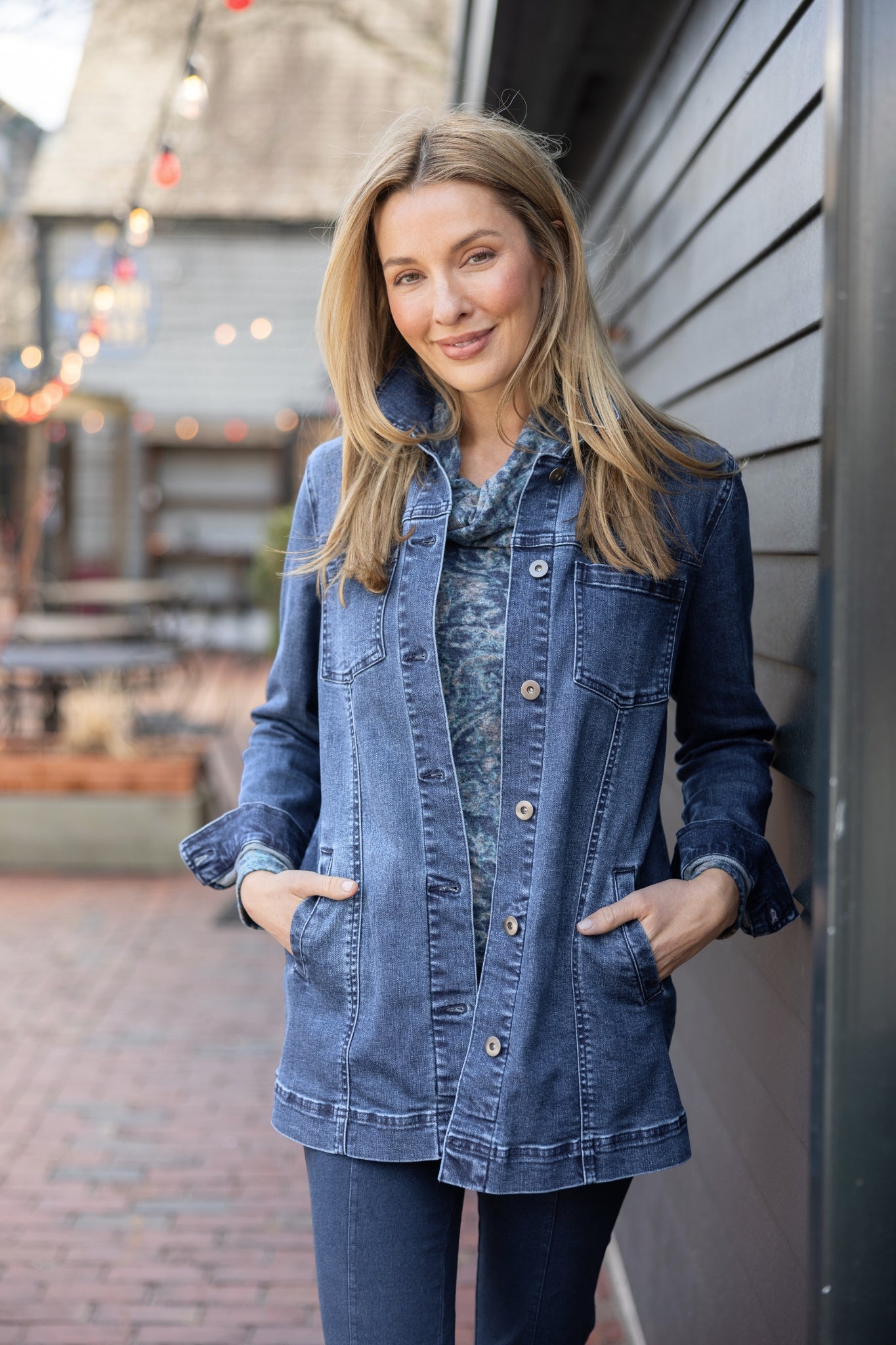 Meet your new go-to layer: Habitat’s Stretch Denim Boyfriend Jacket. Designed in stretch cotton washed denim for ease and comfort, this tunic-length jean jacket features a flattering fitted shape with a button-front closure, chest pockets, and angled side pockets. Brushed antiqued silver hardware and a center back slit add modern detail, while the lightweight, unlined construction keeps it sleek and versatile. Falling over the hips, this jacket is the perfect mix of casual cool and everyday polish — a true wardrobe essential.
